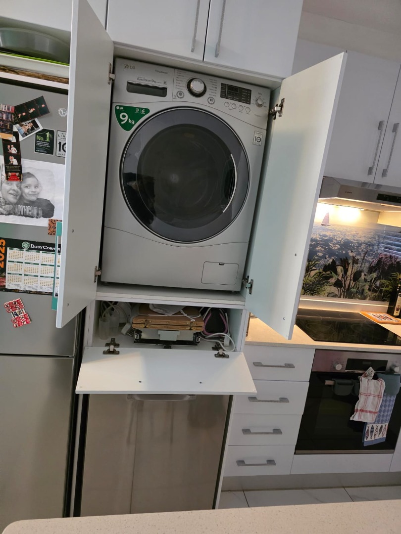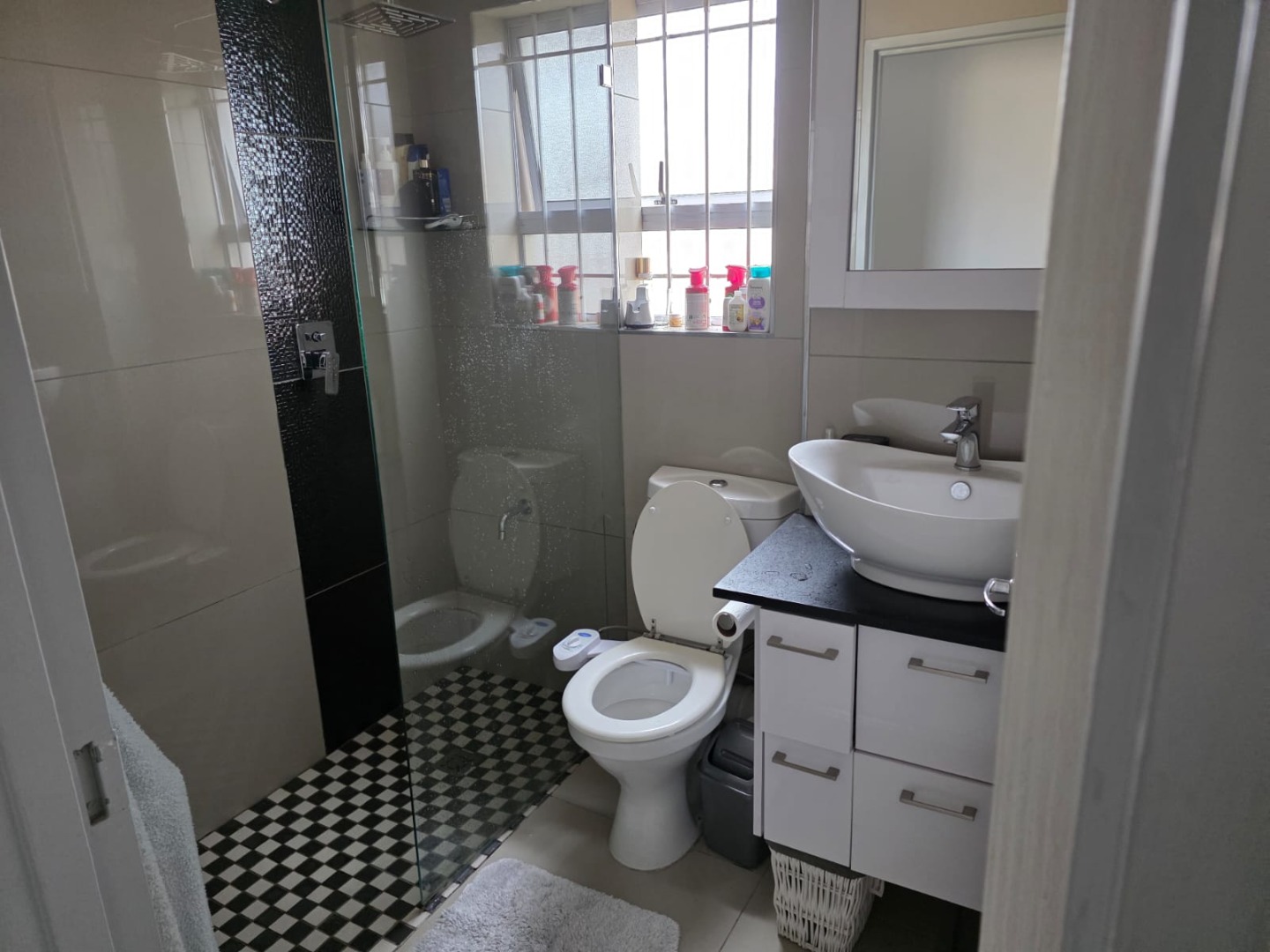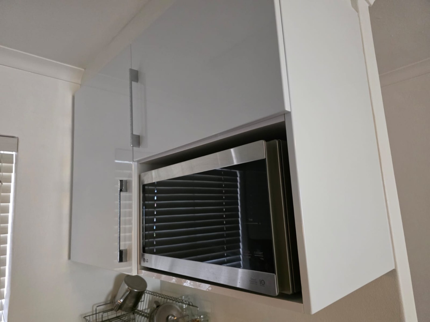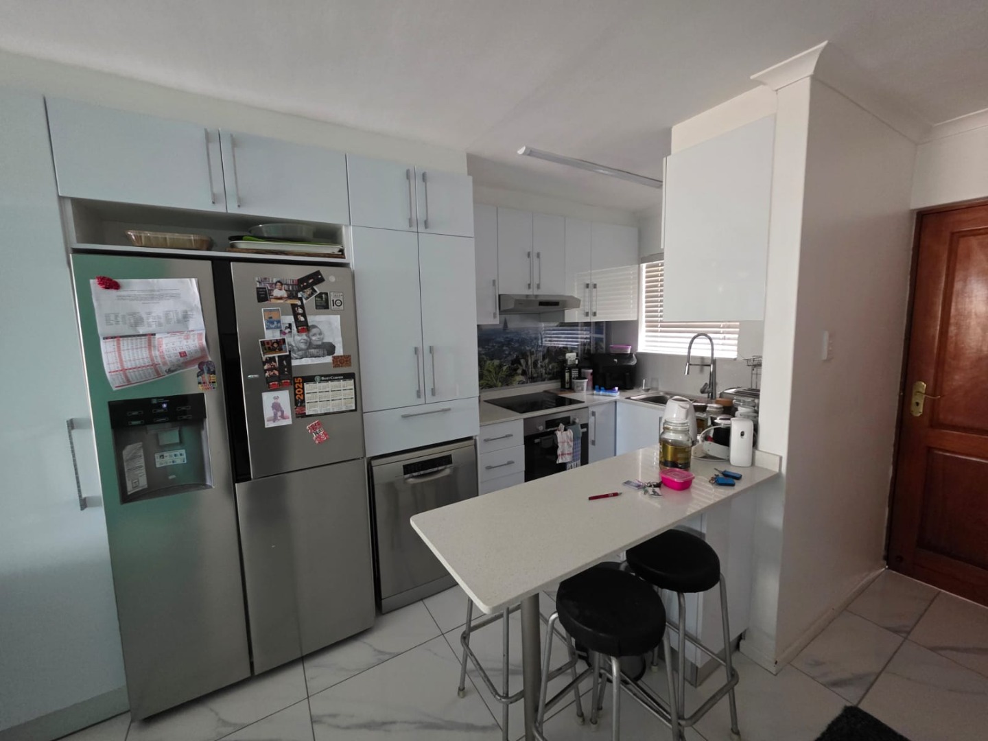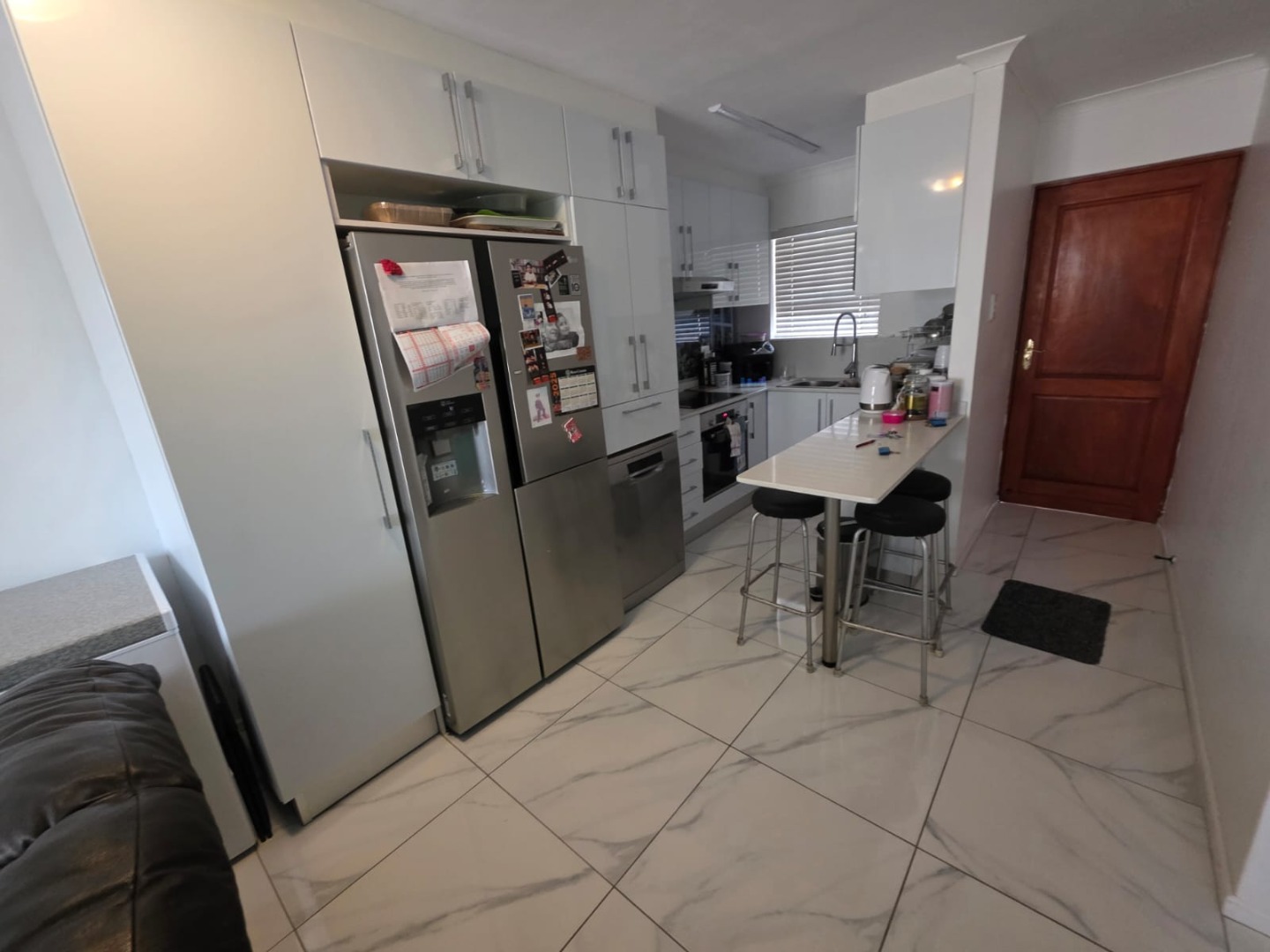 The kitchen space has been cleverly utilized with cupboards housing a washing machine as well as a pull out ironing board. With all of this there is still sufficient space for your groceries and cooking utensils. The white Caesarstone tops just finishes off the kitchen. The kitchen and open plan lounge is finished off in marble tiles that just enhances the entire place. The whole open plan kitchen /lounge makes this place feel so homely