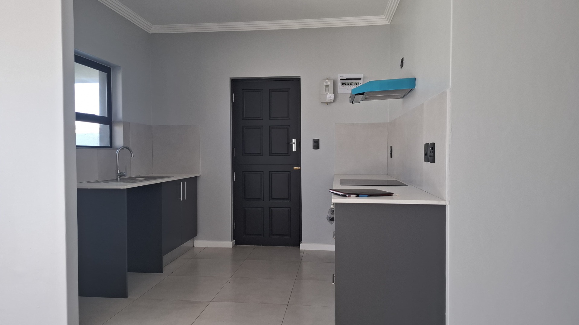 Step inside to a thoughtfully designed interior spanning 78 sqm, where a neutral colour palette of light grey walls and white trim enhances the sense of space and modernity. The entire home benefits from easy-to-maintain tiled flooring and abundant natural light, particularly in the lounge area which features a large sliding glass door. The contemporary kitchen is well-appointed with dark base cabinetry, light countertops, a built-in hob, and an extractor fan, offering a functional space for culinary pursuits.