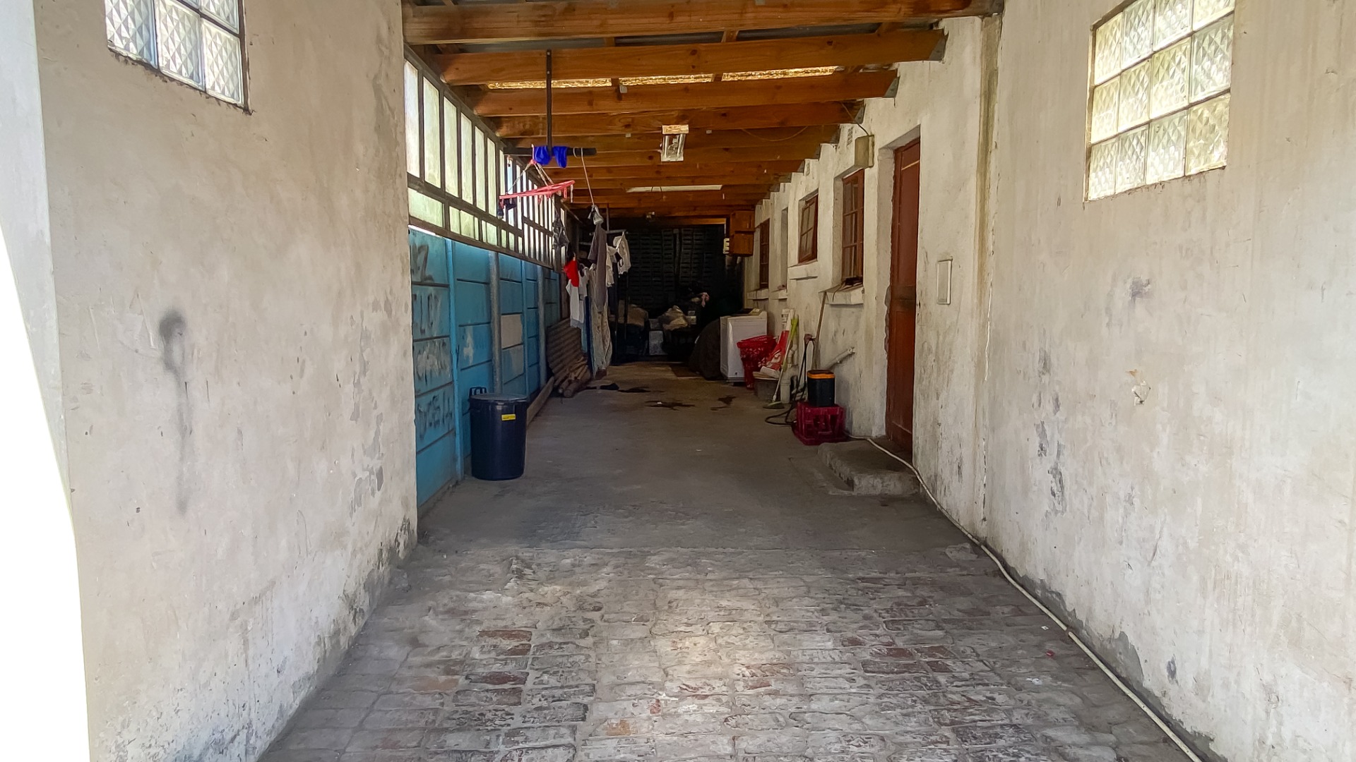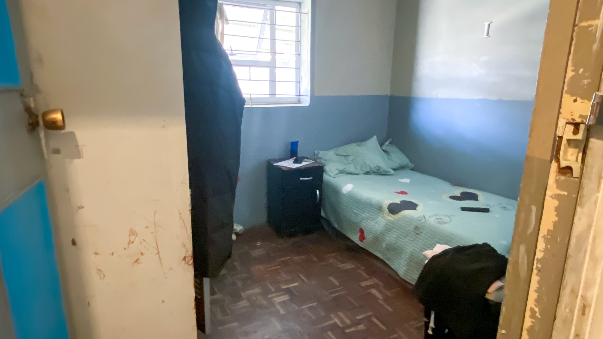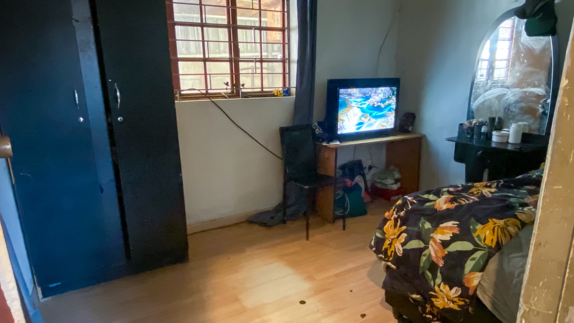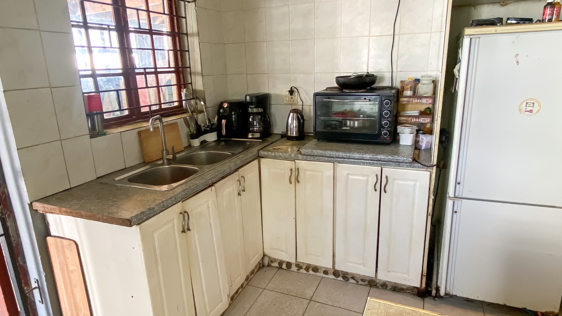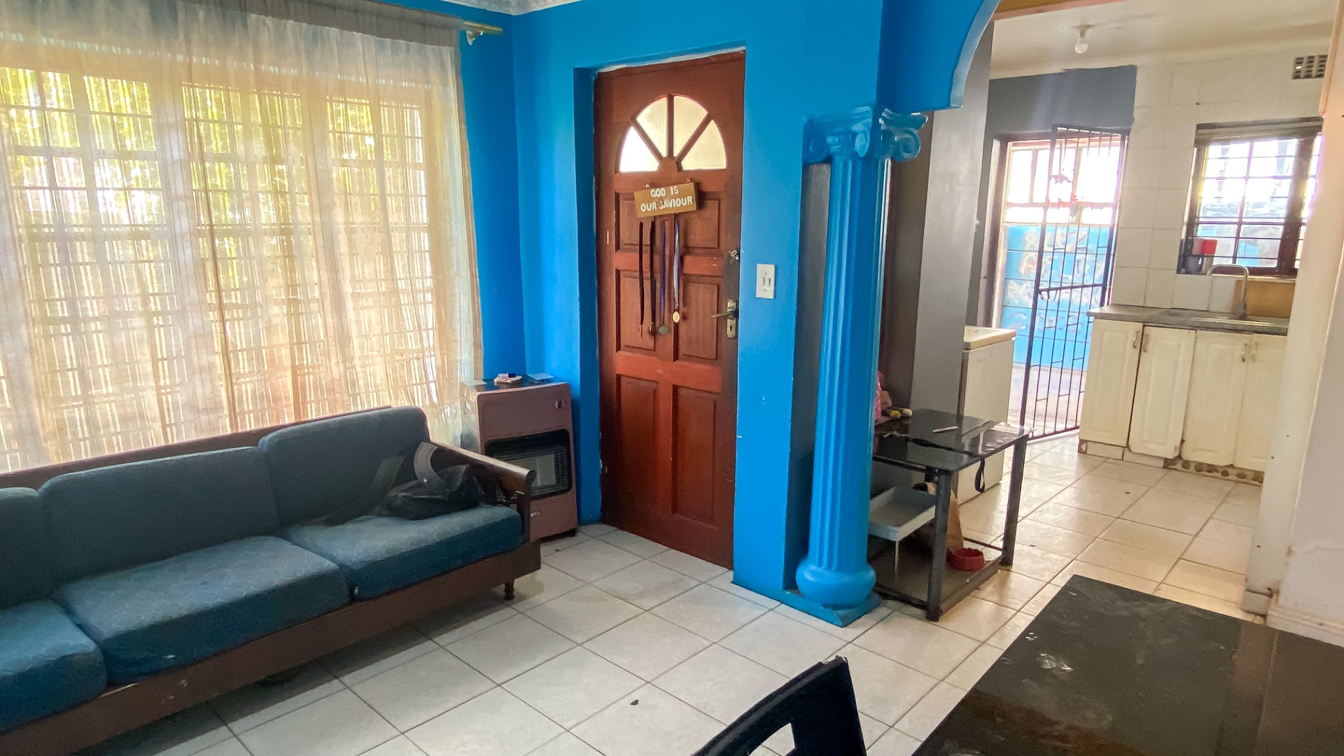 Inside, the home offers a practical layout designed for comfortable family living. The lounge area, characterized by vibrant blue walls and durable tiled flooring, provides a distinct space for relaxation and entertainment. Adjacent to this, the functional kitchen is equipped with essential appliances, a double sink, and basic cabinetry, ready for a modern upgrade. A unique stained-glass panel adds a touch of character, while security bars offer an added layer of protection.