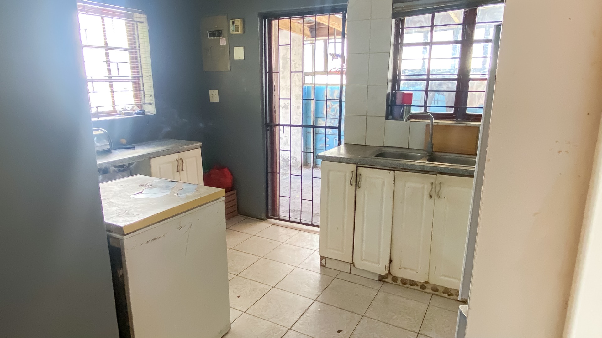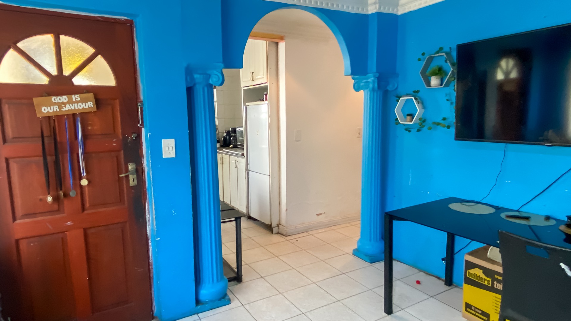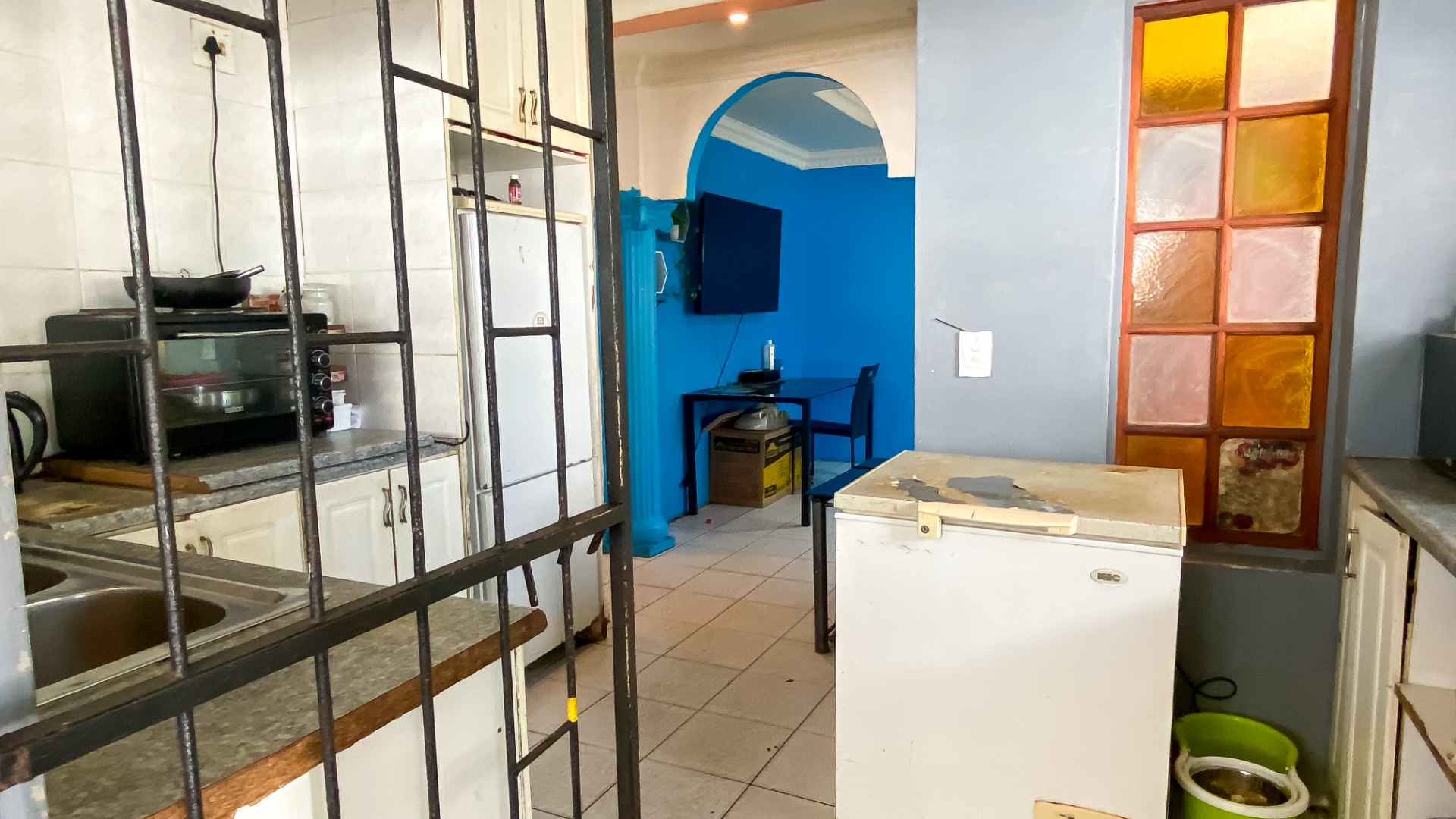Inside, the home offers a practical layout designed for comfortable family living. The lounge area, characterized by vibrant blue walls and durable tiled flooring, provides a distinct space for relaxation and entertainment. Adjacent to this, the functional kitchen is equipped with essential appliances, a double sink, and basic cabinetry, ready for a modern upgrade. A unique stained-glass panel adds a touch of character, while security bars offer an added layer of protection.