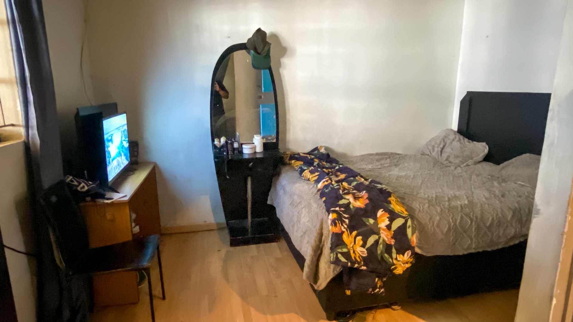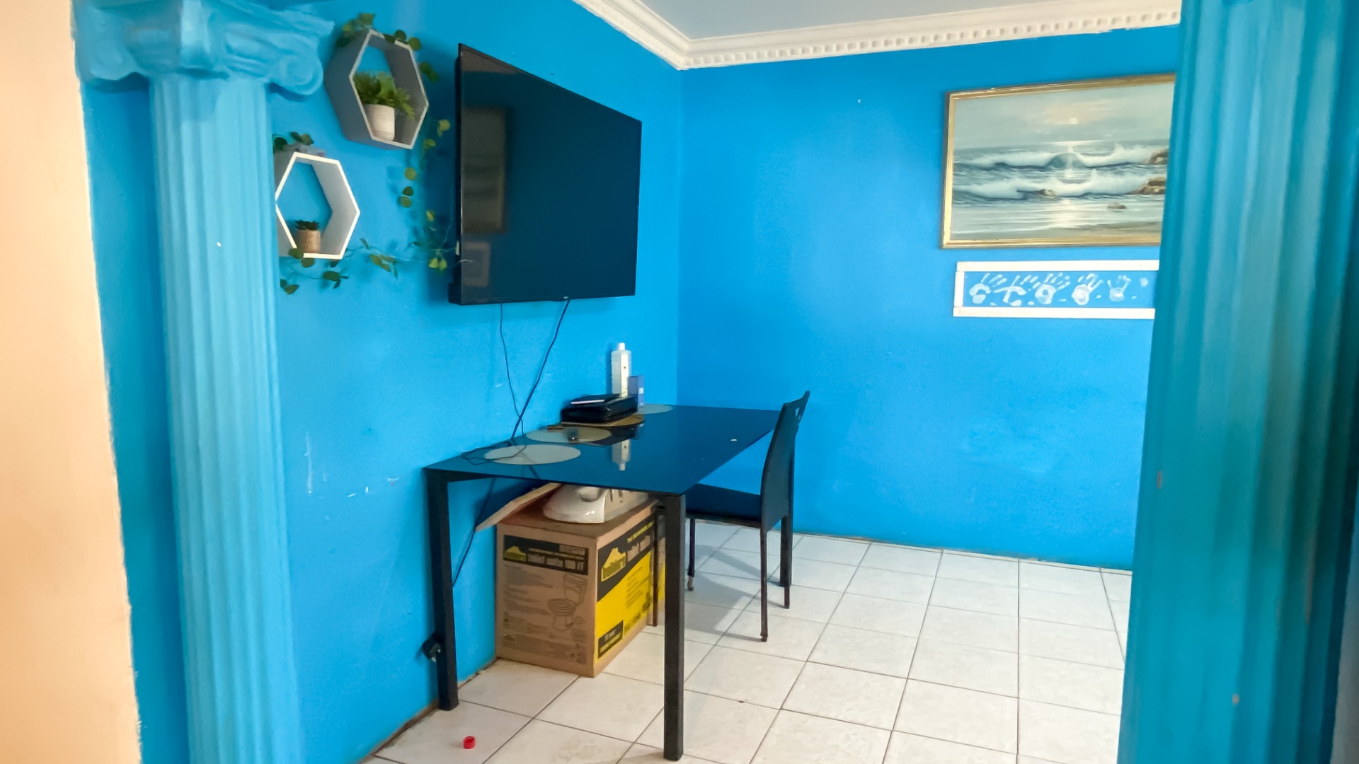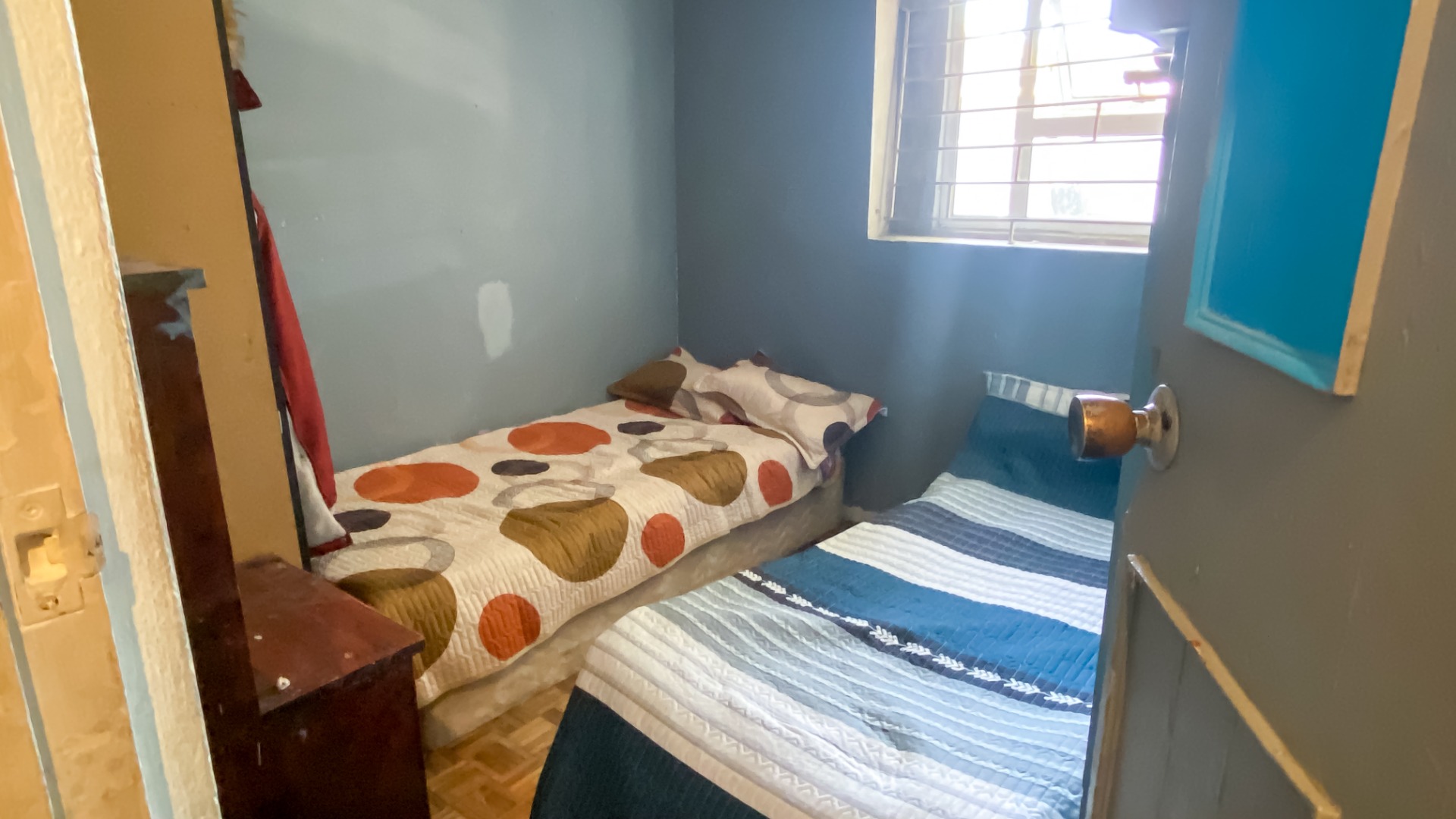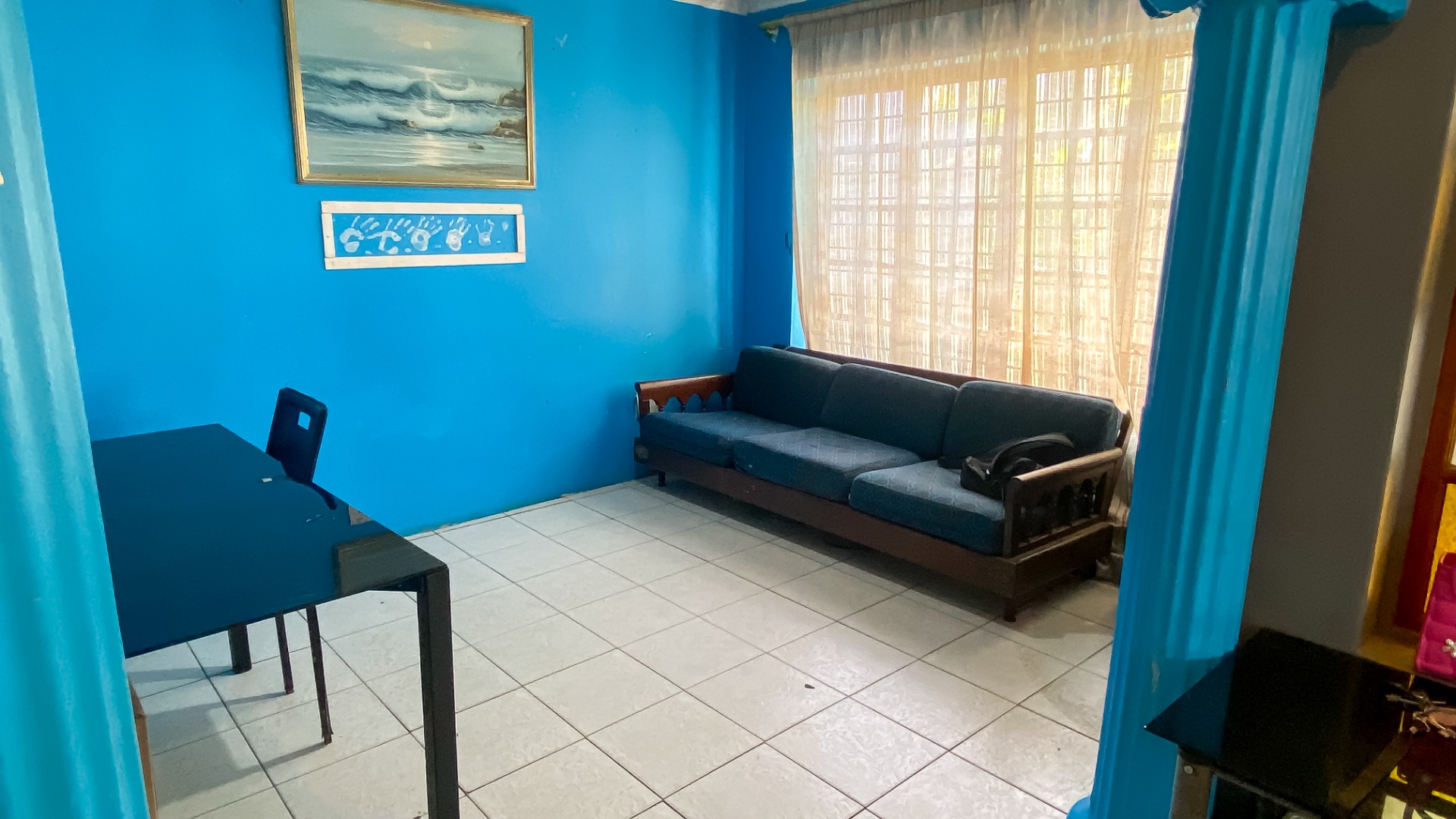 Inside, the home offers a practical layout designed for comfortable family living. The lounge area, characterized by vibrant blue walls and durable tiled flooring, provides a distinct space for relaxation and entertainment. Adjacent to this, the functional kitchen is equipped with essential appliances, a double sink, and basic cabinetry, ready for a modern upgrade. A unique stained-glass panel adds a touch of character, while security bars offer an added layer of protection.