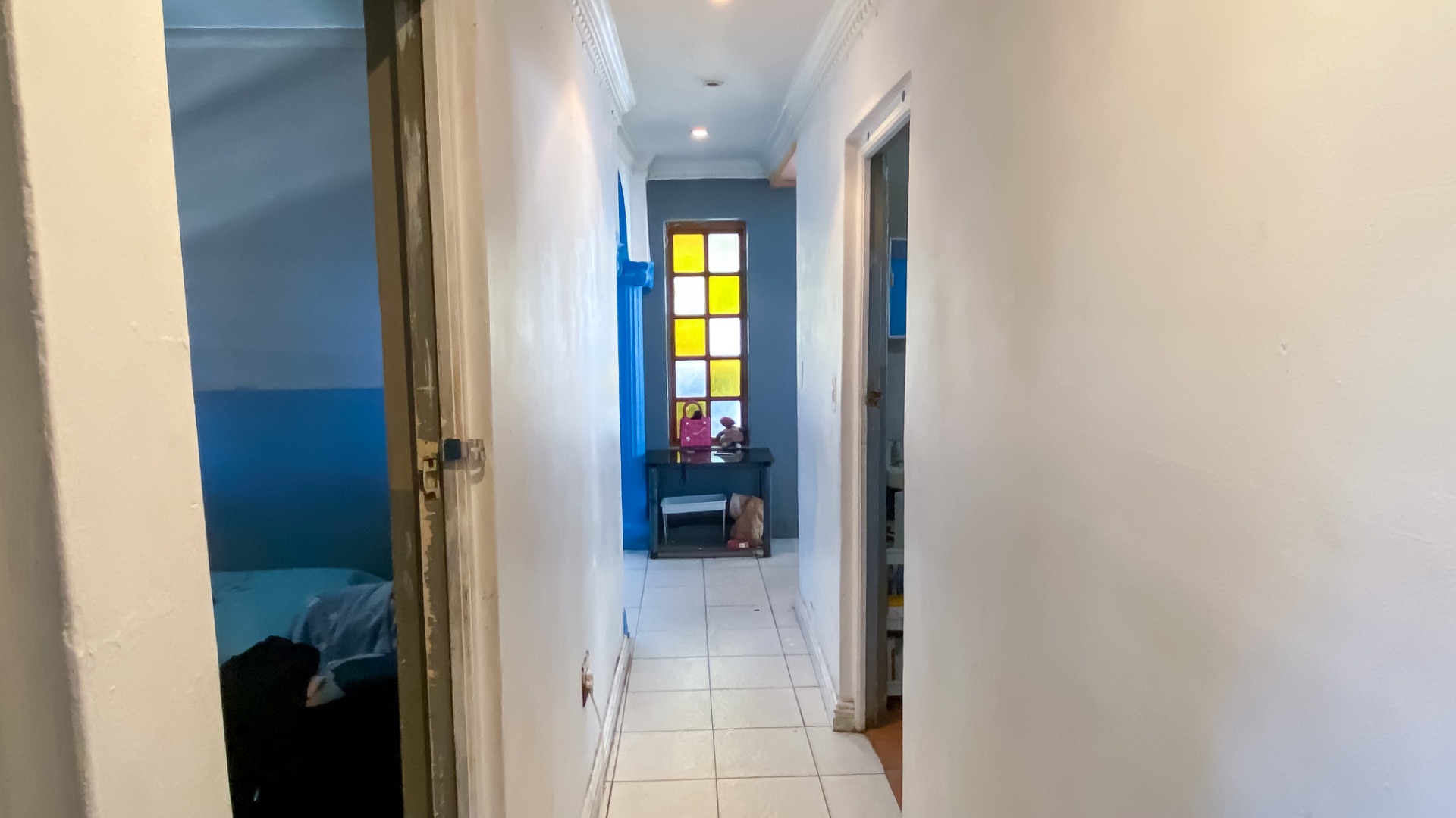 The residence comprises three bedrooms, each offering natural light and a foundation for comfortable private quarters. One bedroom features classic parquet flooring, adding warmth and character. The single bathroom is equipped with a bathtub, toilet, and pedestal sink, providing all necessary amenities, though it presents an opportunity for contemporary refurbishment to enhance its appeal and functionality.