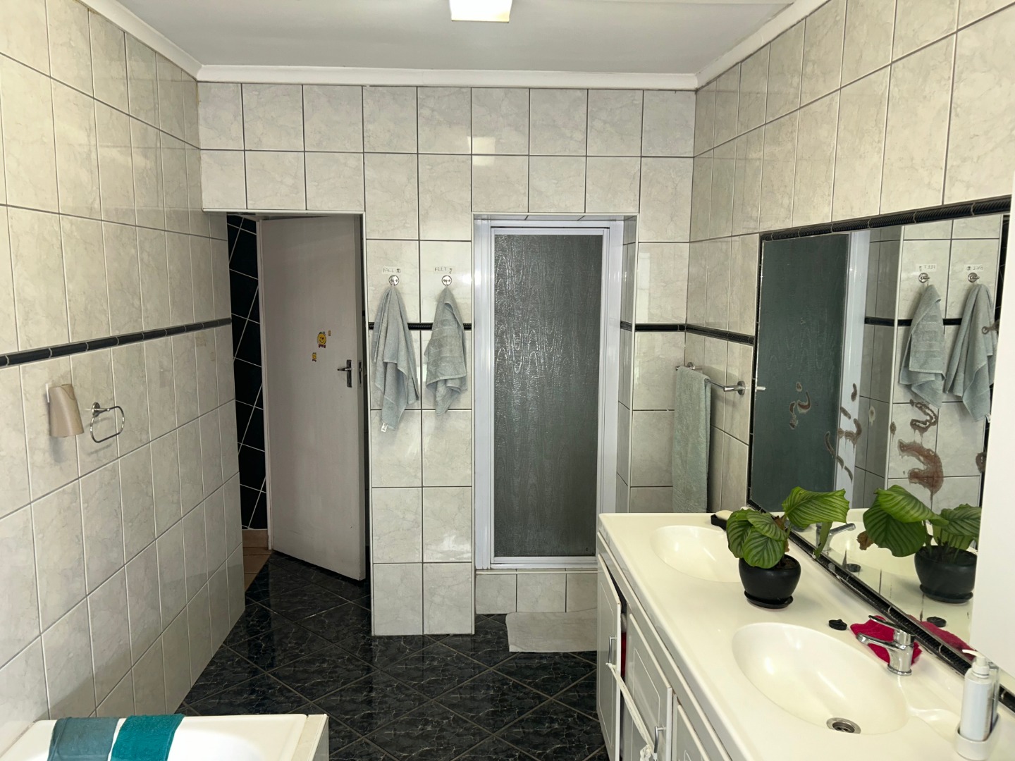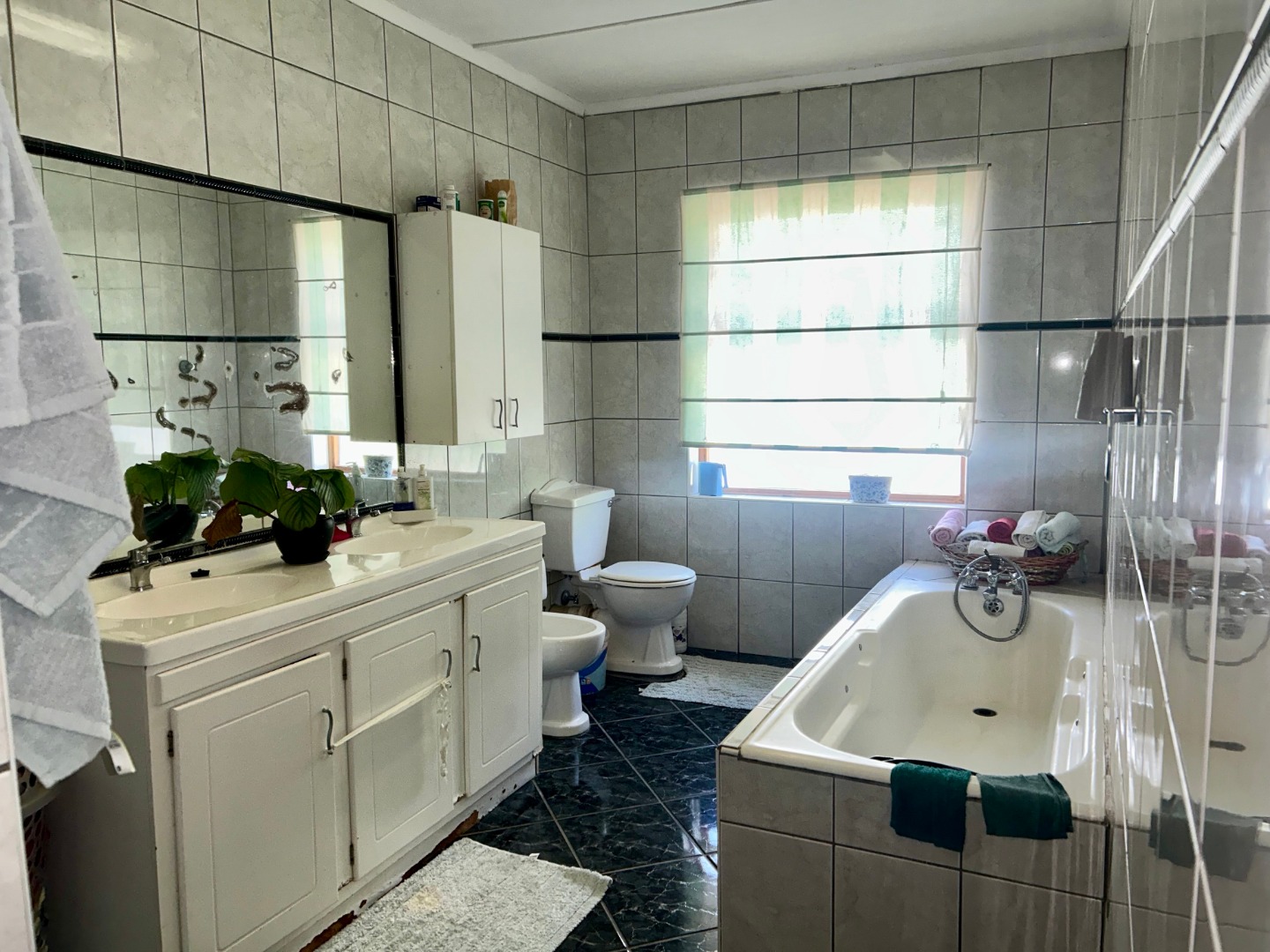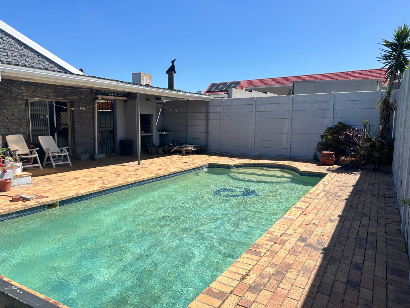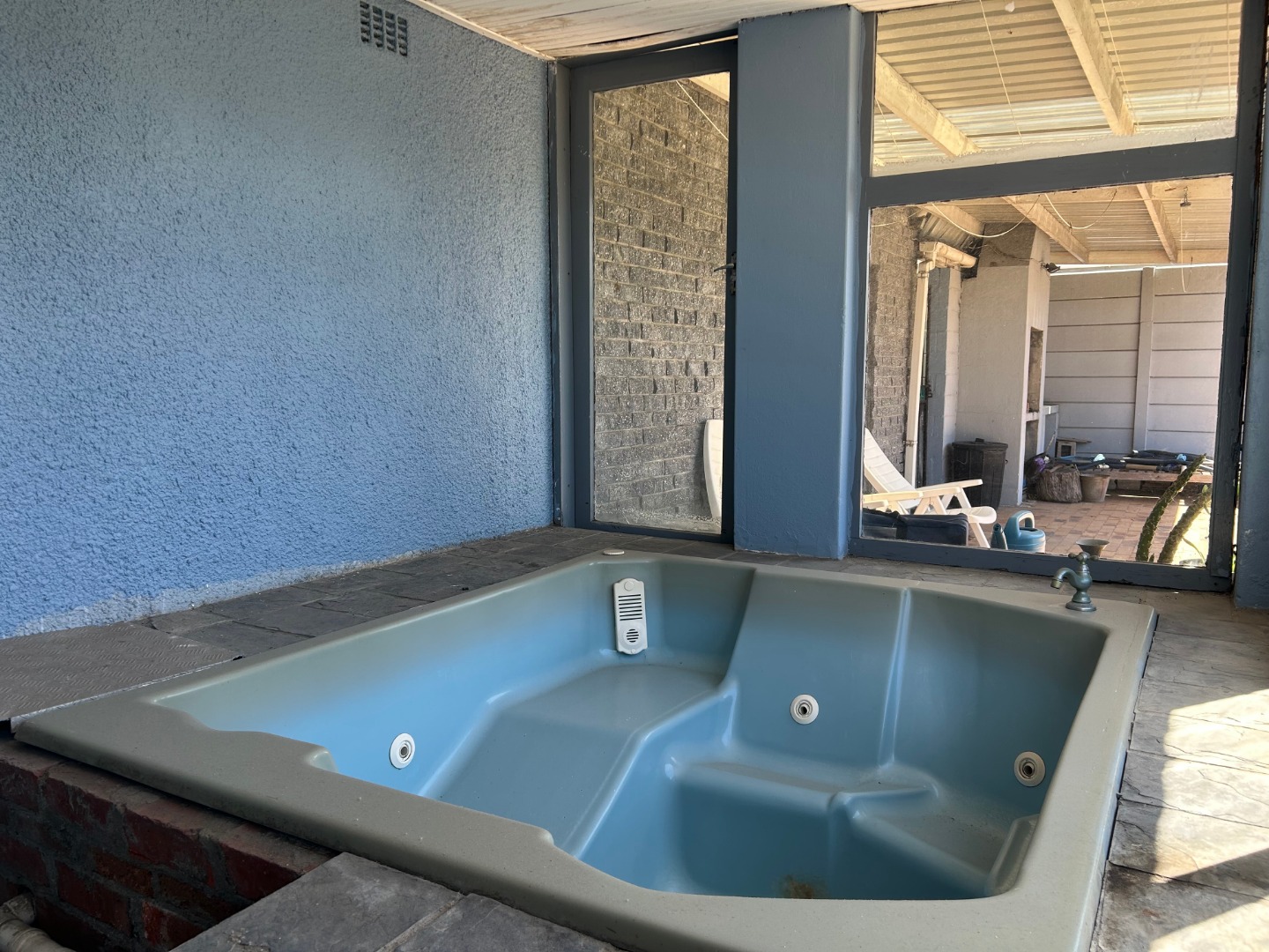 Outside, the garden includes a swimming pool, a covered patio with a built-in braai, and a separate Jacuzzi room. A second bathroom is conveniently located outdoors.