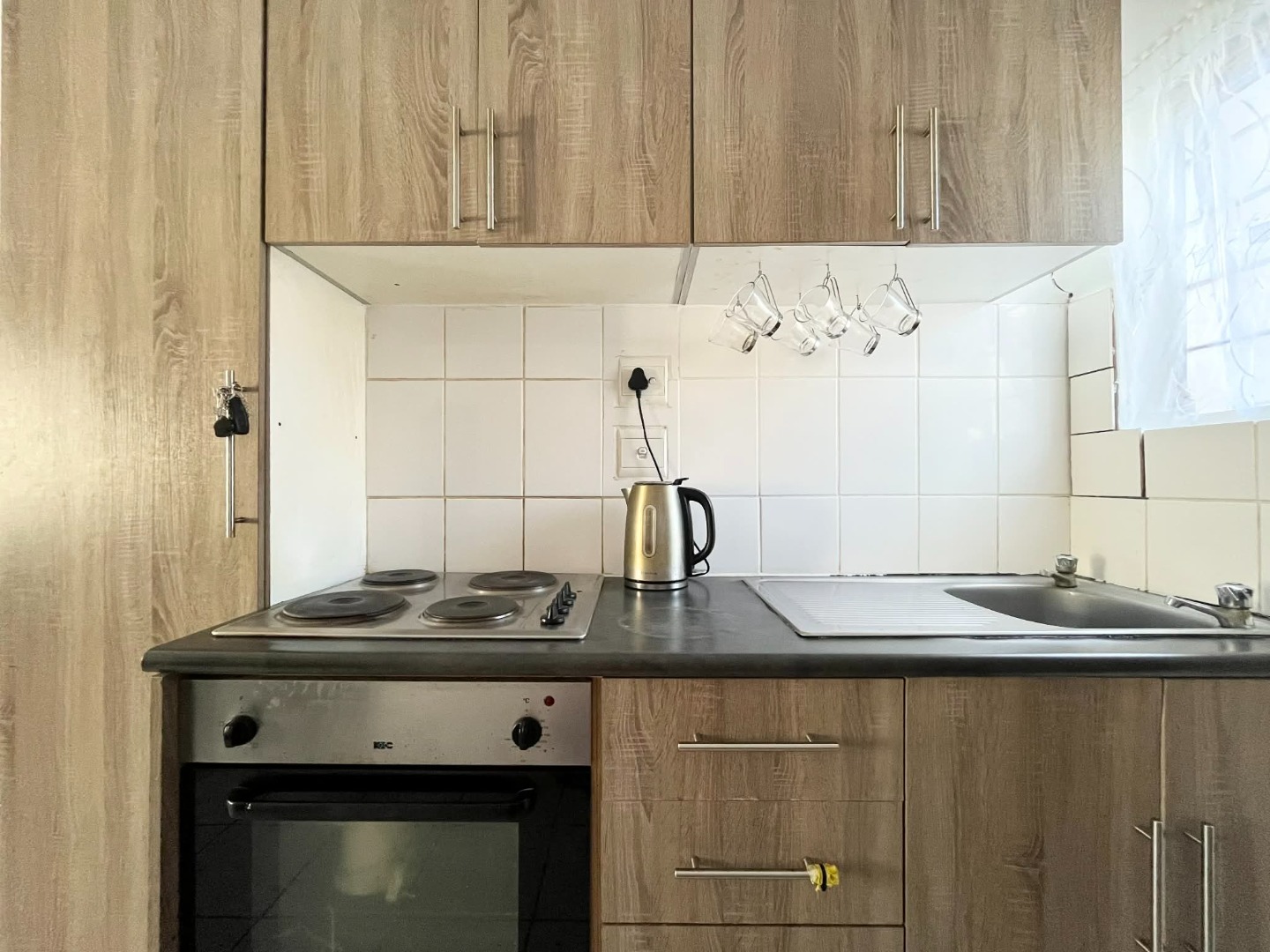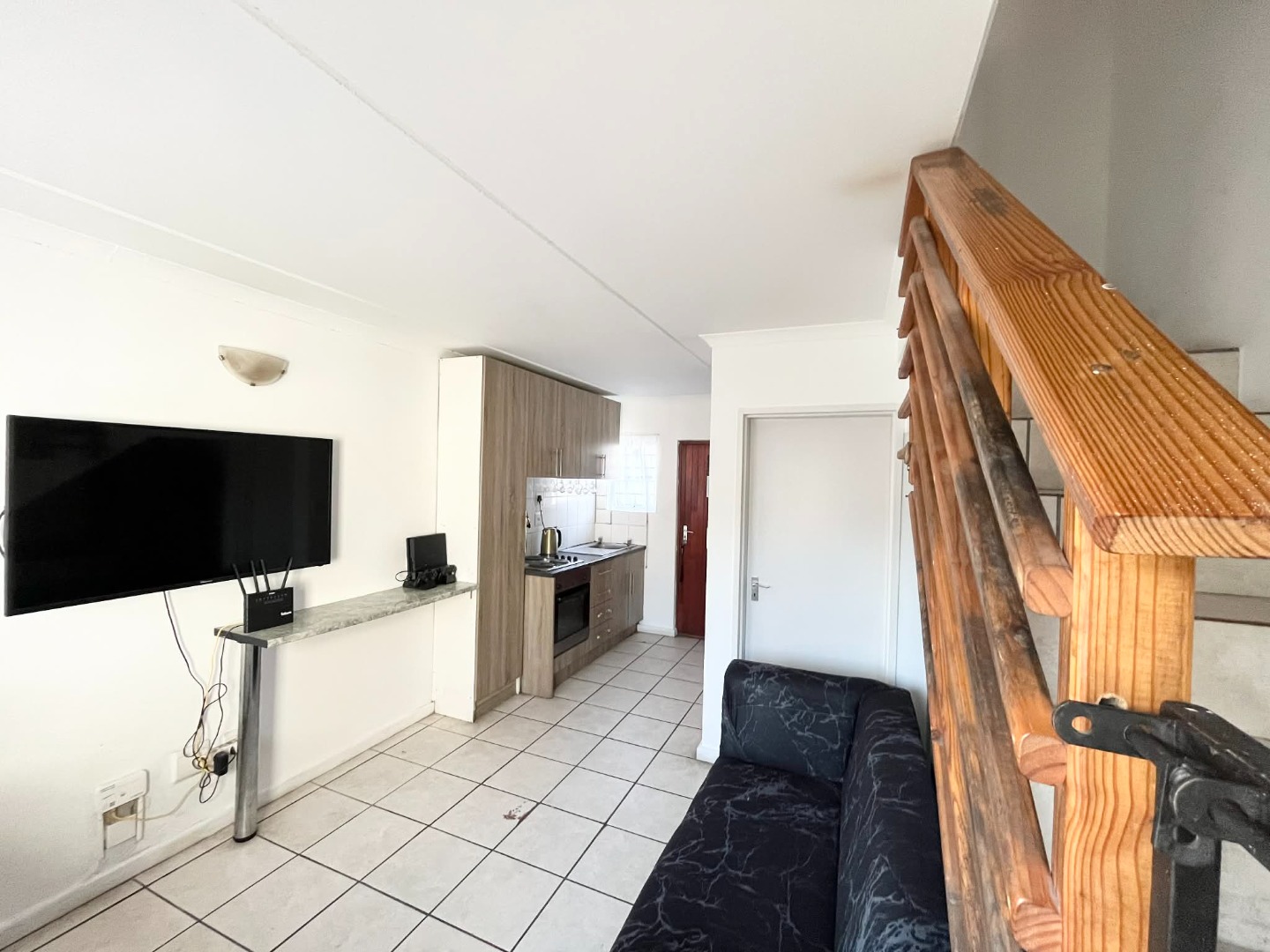 fitted kitchen that leads to a cozy lounge area.