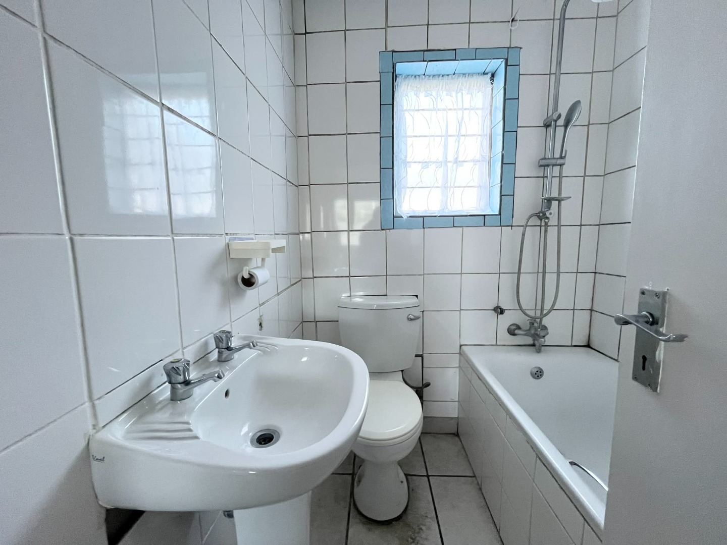 The family bathroom has a shower over the bath and a basin and toilet.