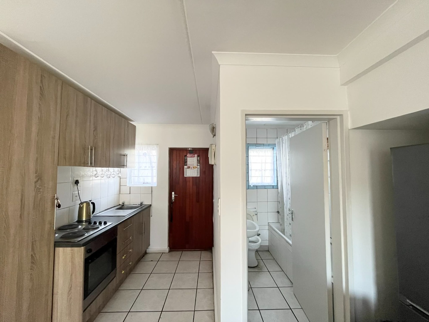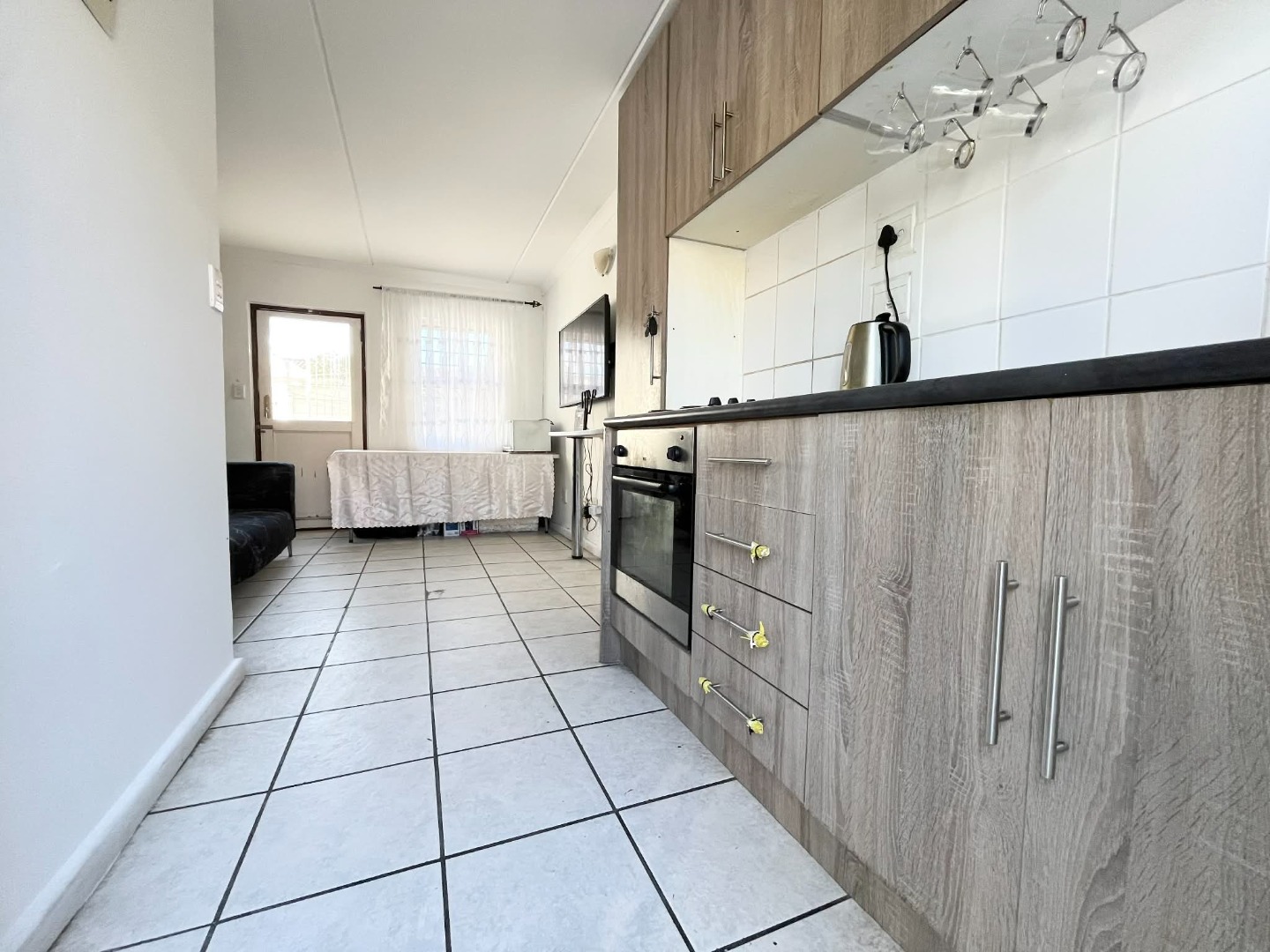 fitted kitchen that leads to a cozy lounge area.