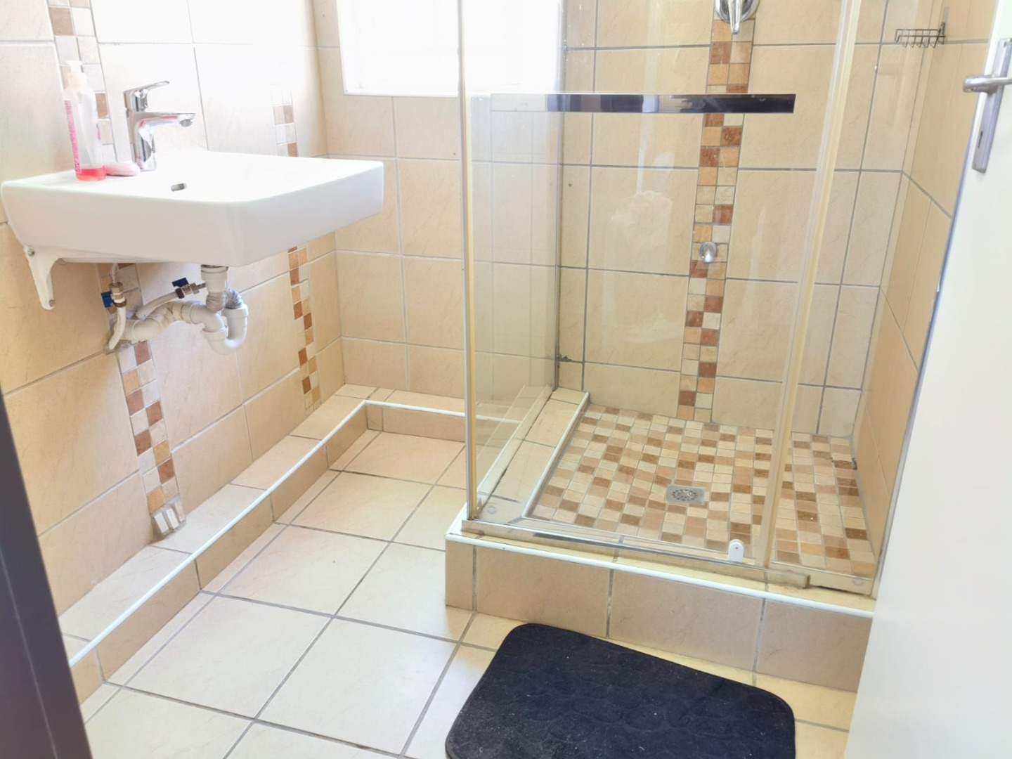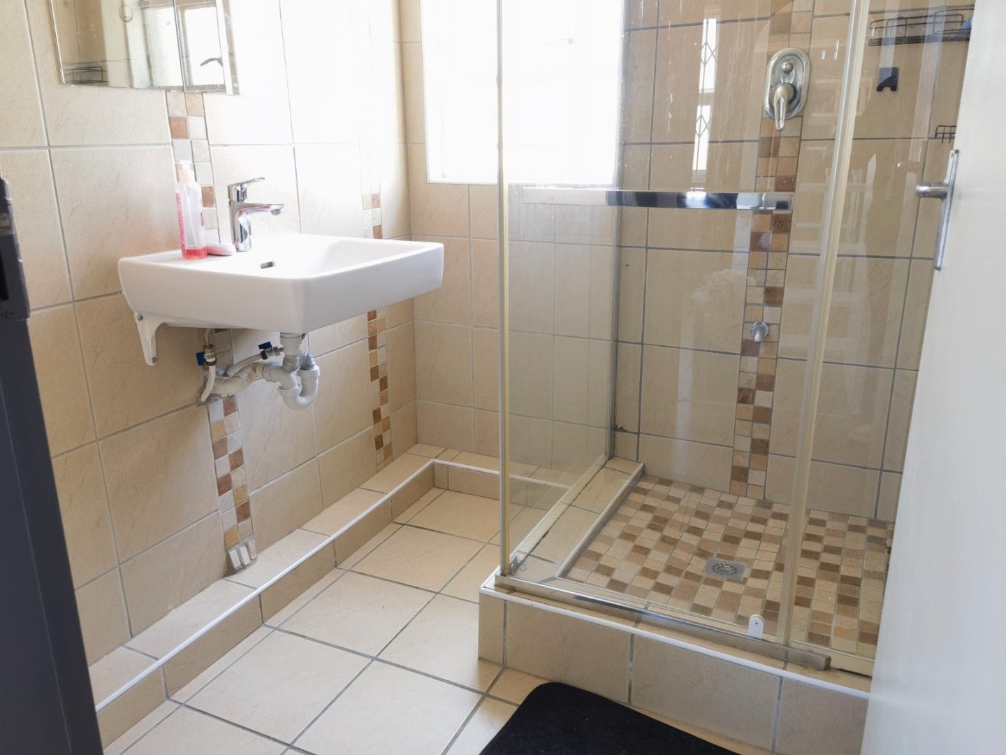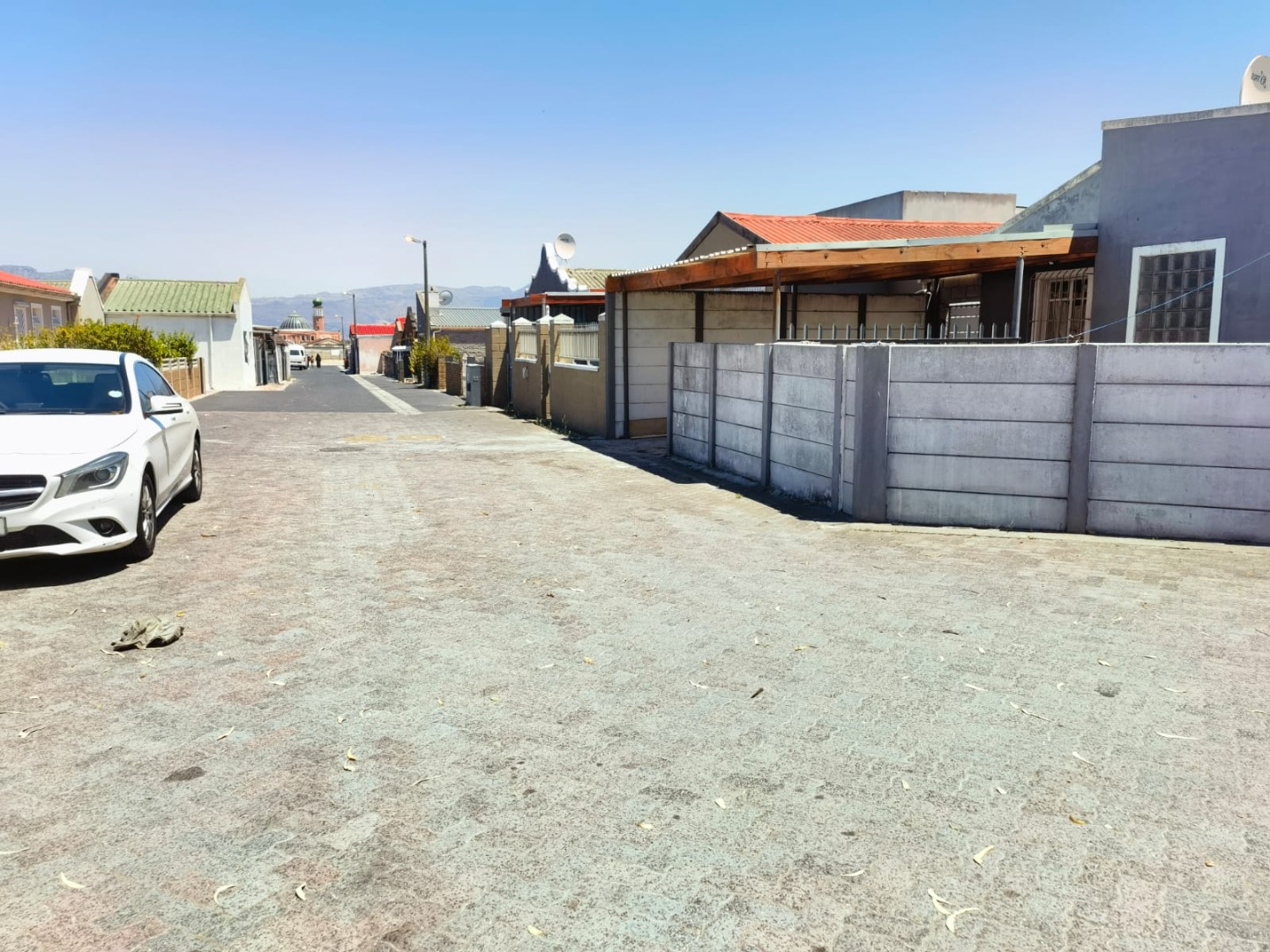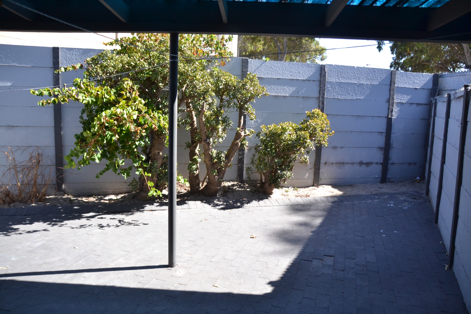 Step outside to a private, paved outdoor patio, ideal for relaxation or entertaining, complete with an awning for shade. The property sits on a 173 sqm erf, featuring a garden and additional paving. Parking is convenient with a single garage and an extra parking bay. Enjoy distant mountain and ocean views from various vantage points, adding to the appeal of this Cape Town home.