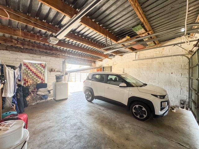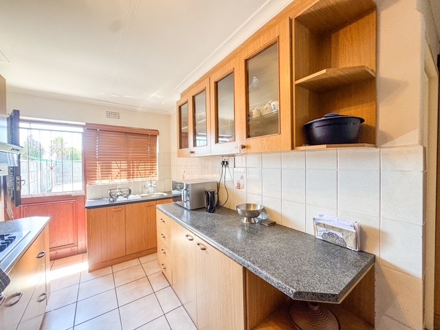 Step inside to a functional interior designed for comfortable living. The living room boasts easy-to-maintain tiled flooring, abundant natural light from a large window, and a charming exposed brick accent wall that adds character. The layout flows into an integrated kitchen and dining area, perfect for everyday meals and entertaining. The kitchen is equipped with wooden cabinets, tiled flooring, a built-in oven, and a gas cooktop, alongside a practical breakfast bar for casual dining.
