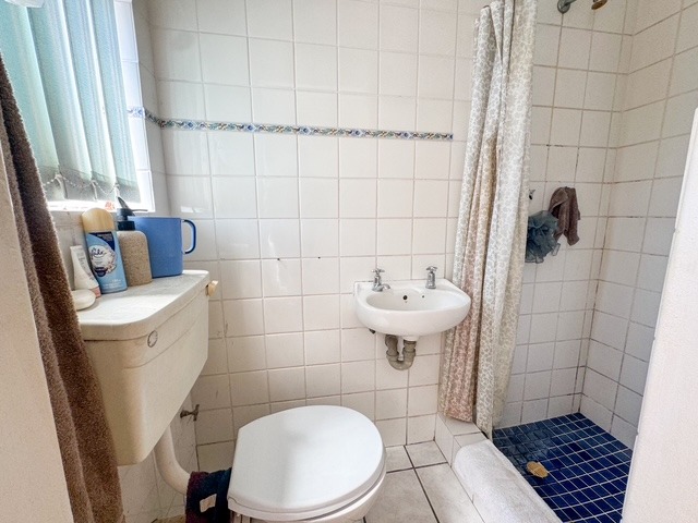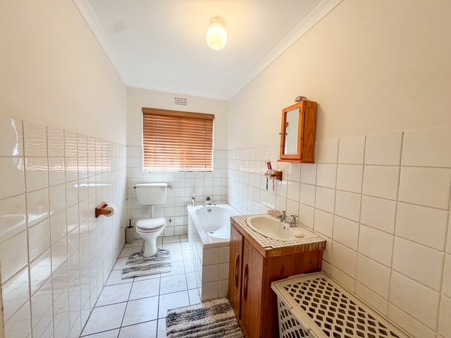 Accommodation includes three well-proportioned bedrooms, each benefiting from natural light. One bedroom features wood-look flooring and neutral walls, while another offers extensive storage with multiple wooden wardrobes. The home provides two bathrooms, both fully tiled and functional, featuring a bathtub in one and a shower in the other, catering to daily needs. While some fixtures reflect a classic style, they remain perfectly serviceable.