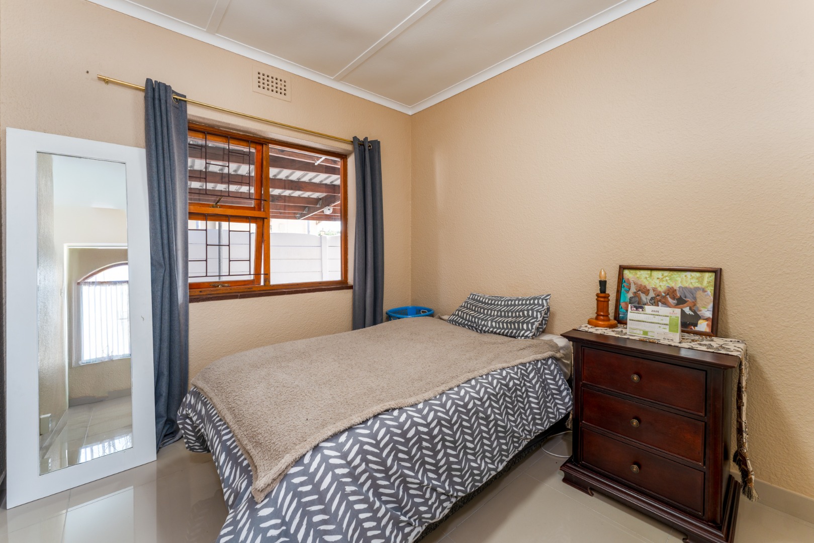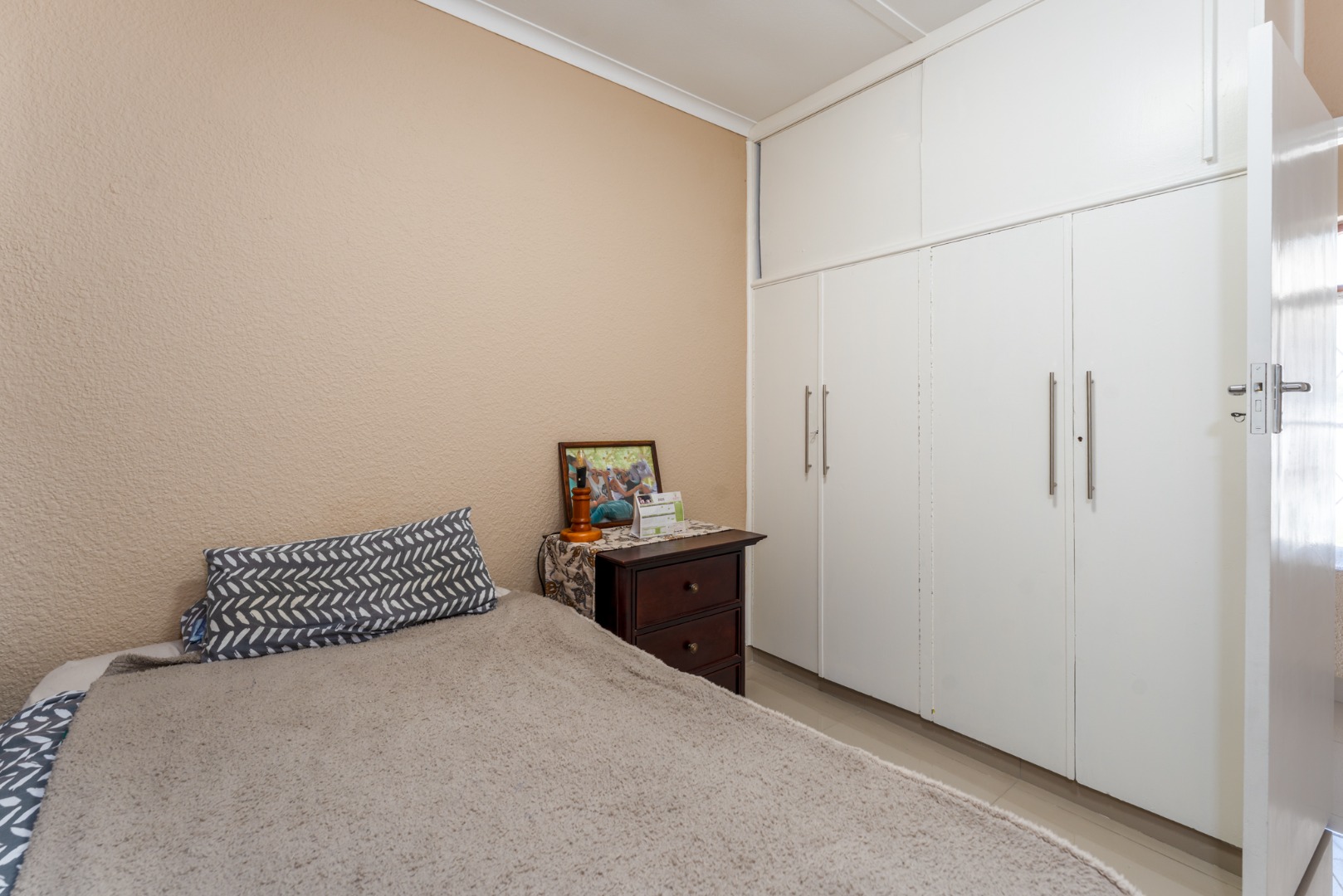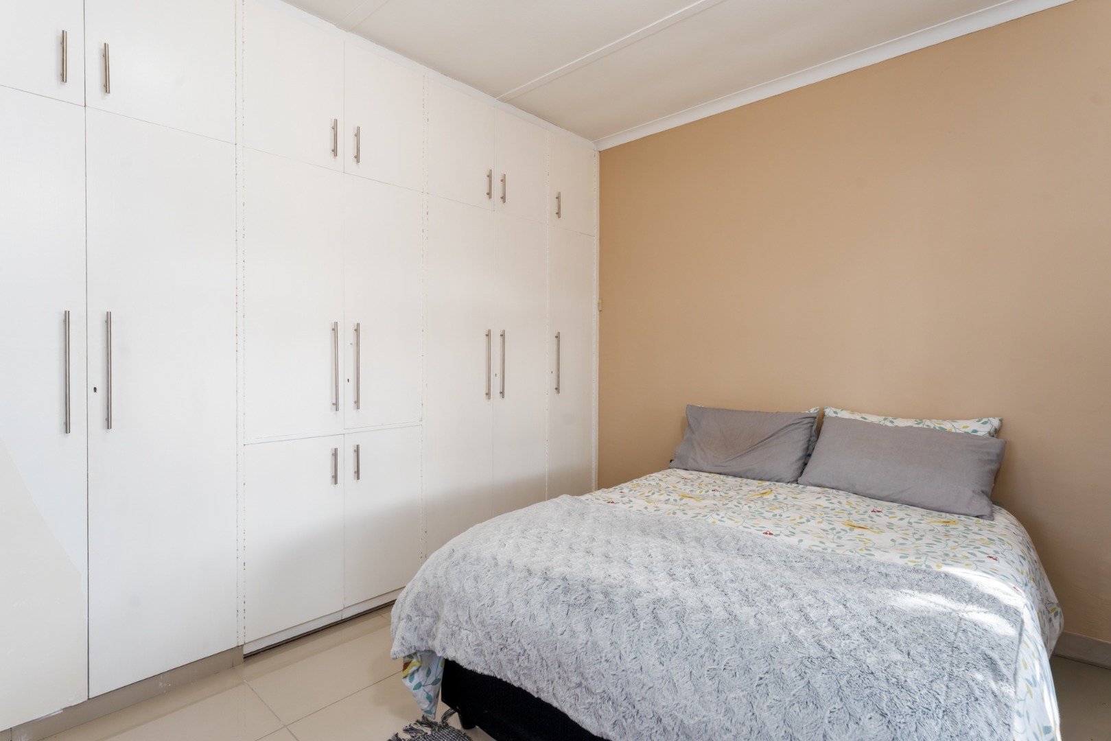 The home offers three comfortable bedrooms, each designed for practical living. The main bedroom includes floor-to-ceiling built-in white wardrobes, ensuring ample storage. A well-appointed bathroom serves the household, featuring tiled flooring throughout for easy maintenance.
