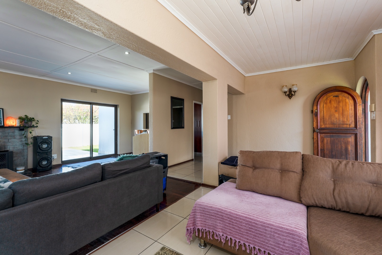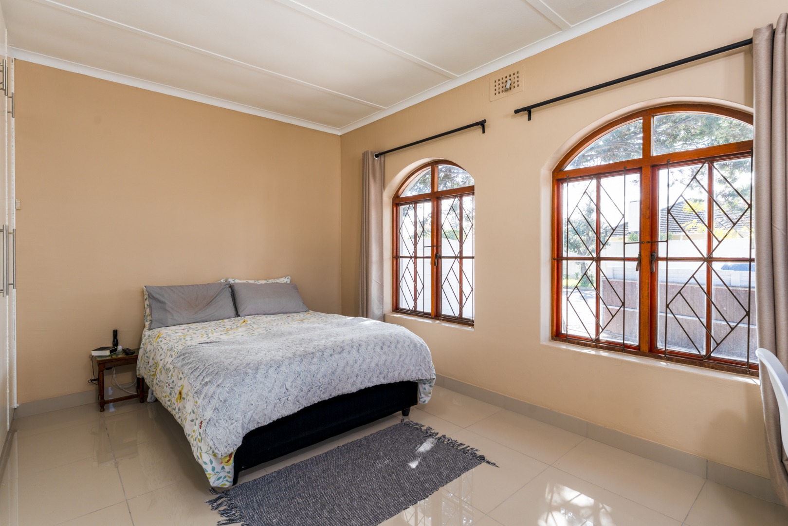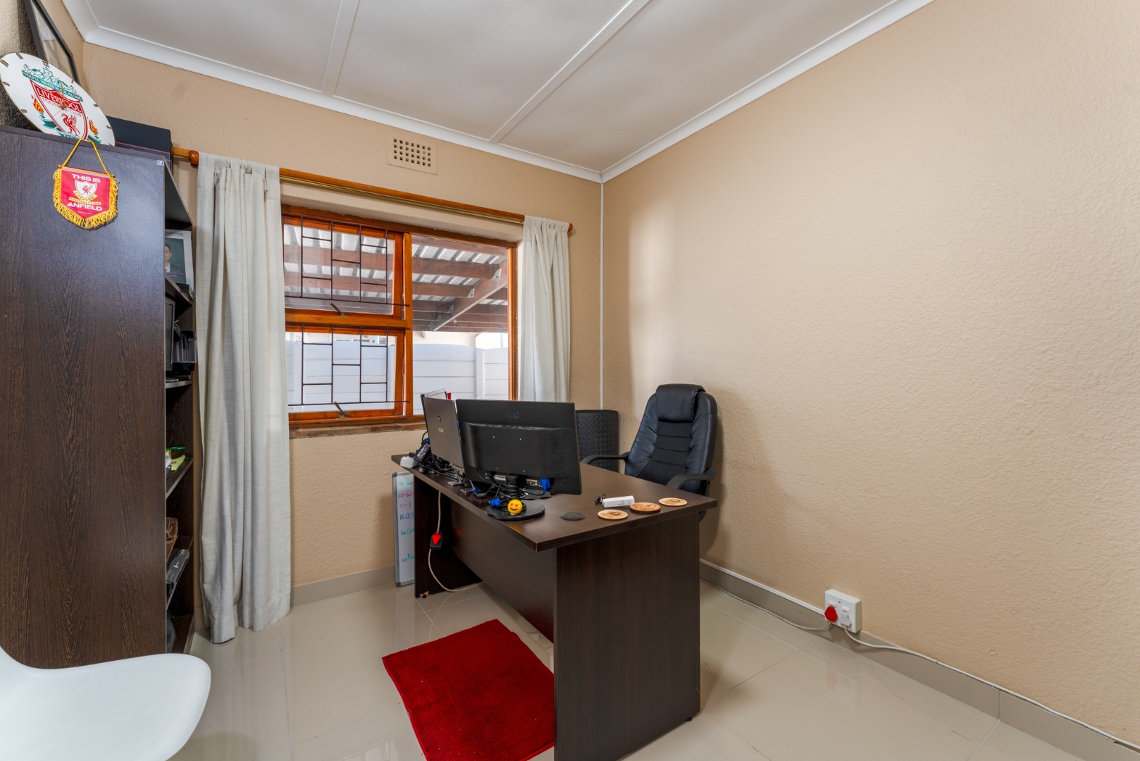 The home offers three comfortable bedrooms, each designed for practical living. The main bedroom includes floor-to-ceiling built-in white wardrobes, ensuring ample storage. A well-appointed bathroom serves the household, featuring tiled flooring throughout for easy maintenance.