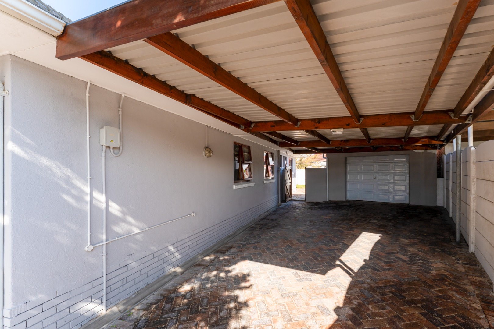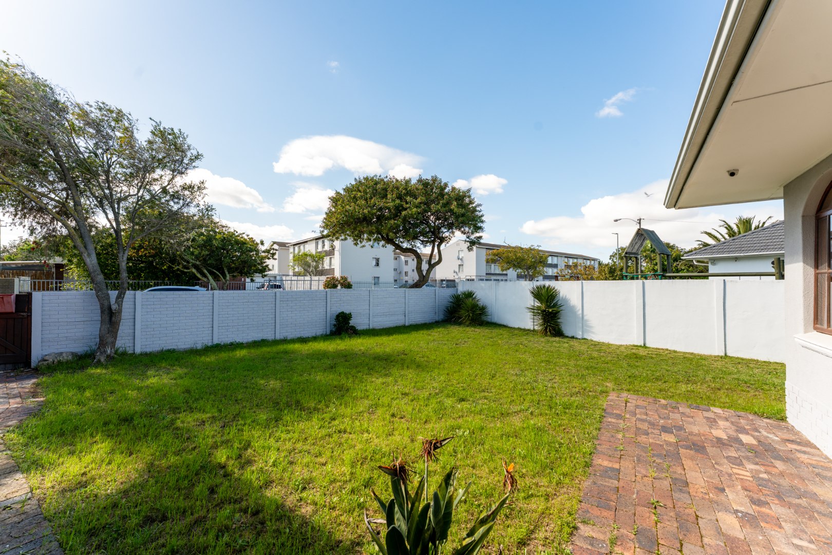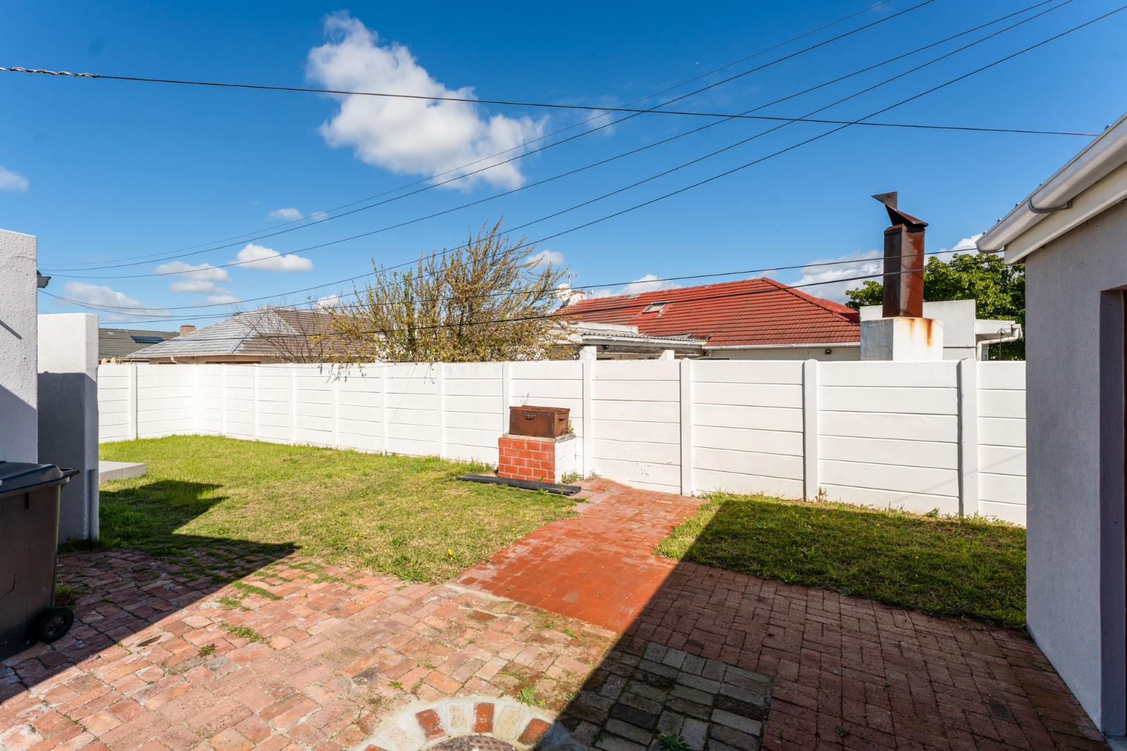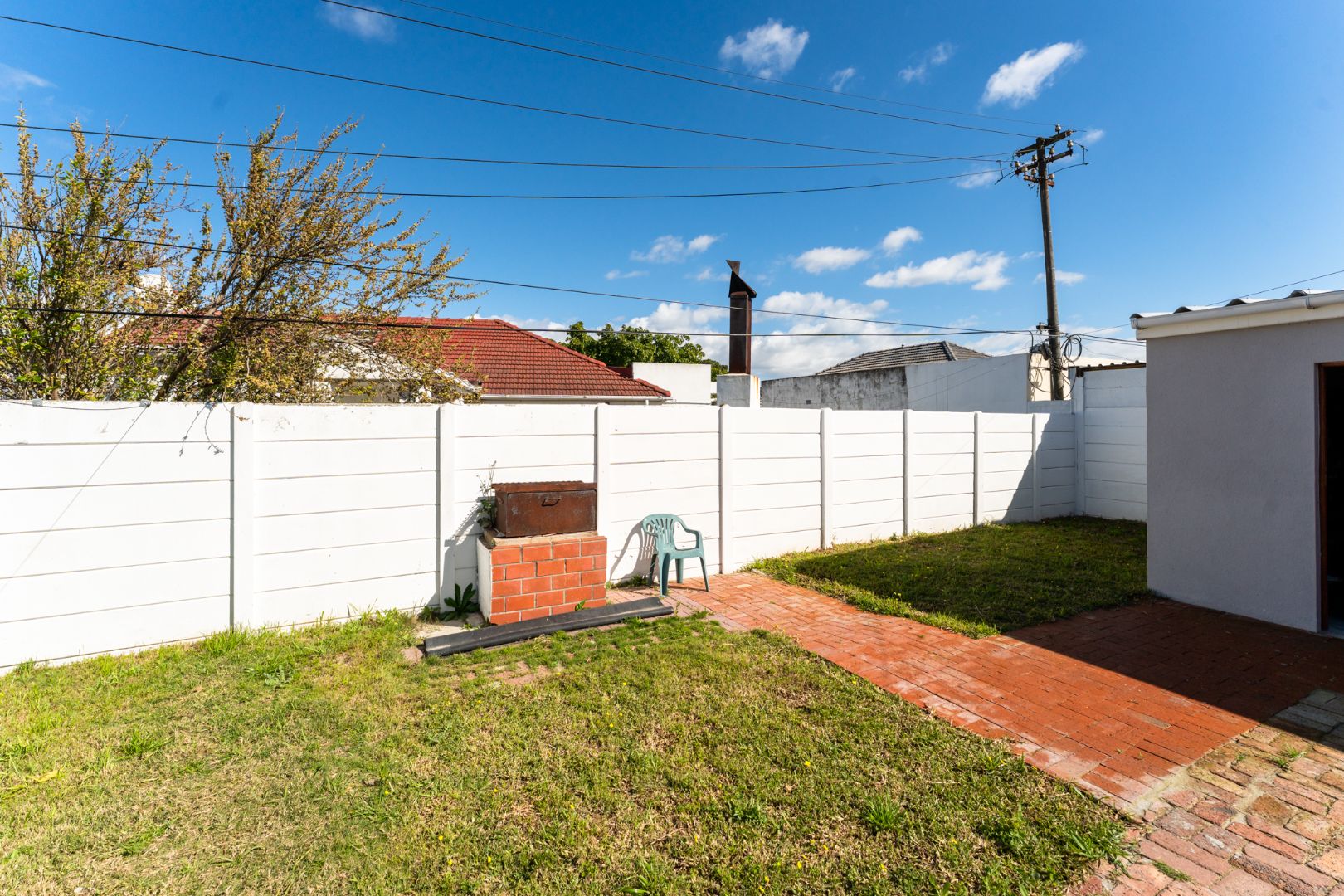 Outdoor living is a pleasure with a spacious tiled patio, ideal for relaxation or entertaining guests. The property sits on a generous 598 sqm erf, featuring a green grassy lawn and mature trees within a private, fenced yard. A separate outbuilding provides additional utility, complemented by a single garage and a total of eight parking bays, offering abundant space for vehicles. Security bars on the kitchen window provide an added layer of peace of mind.