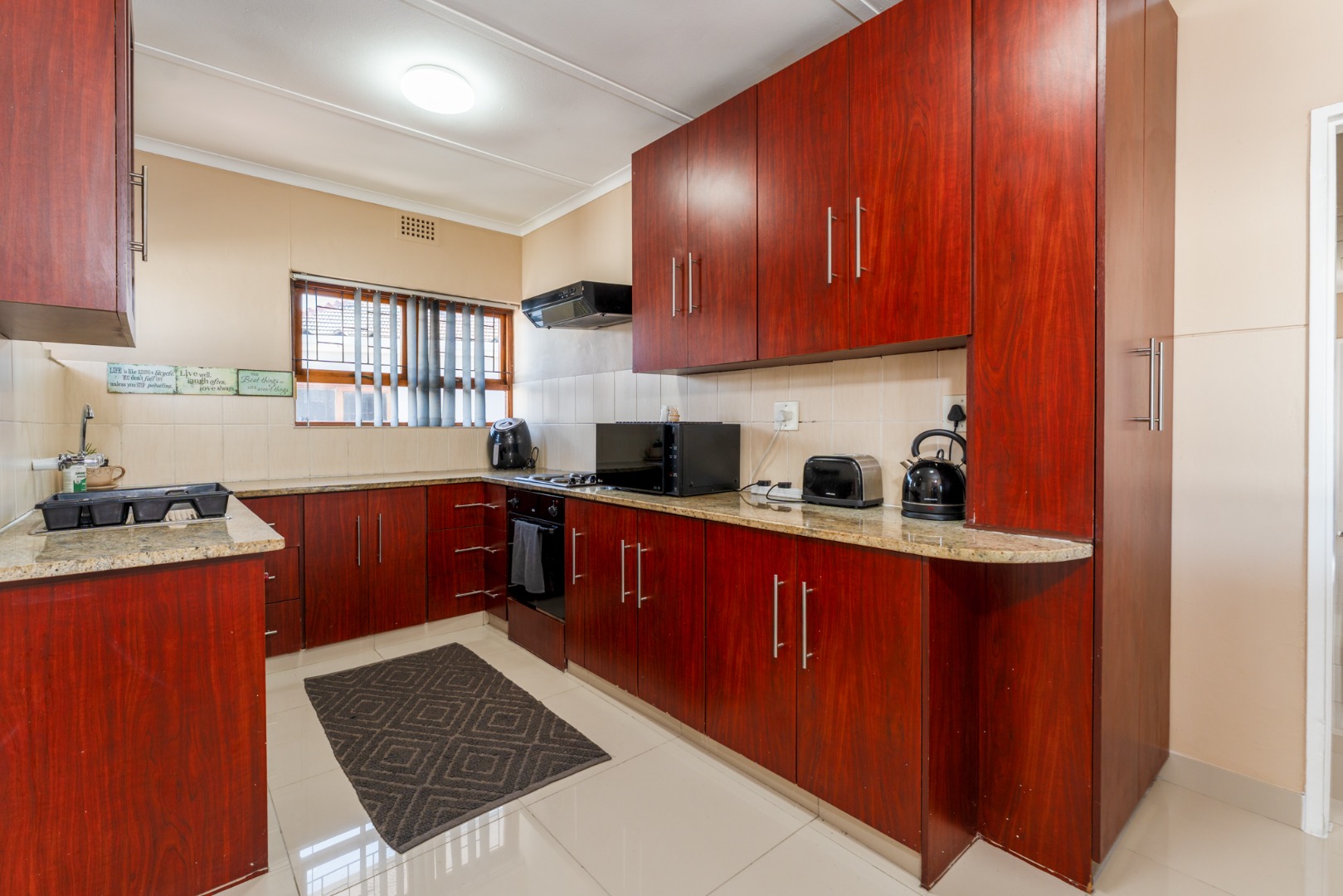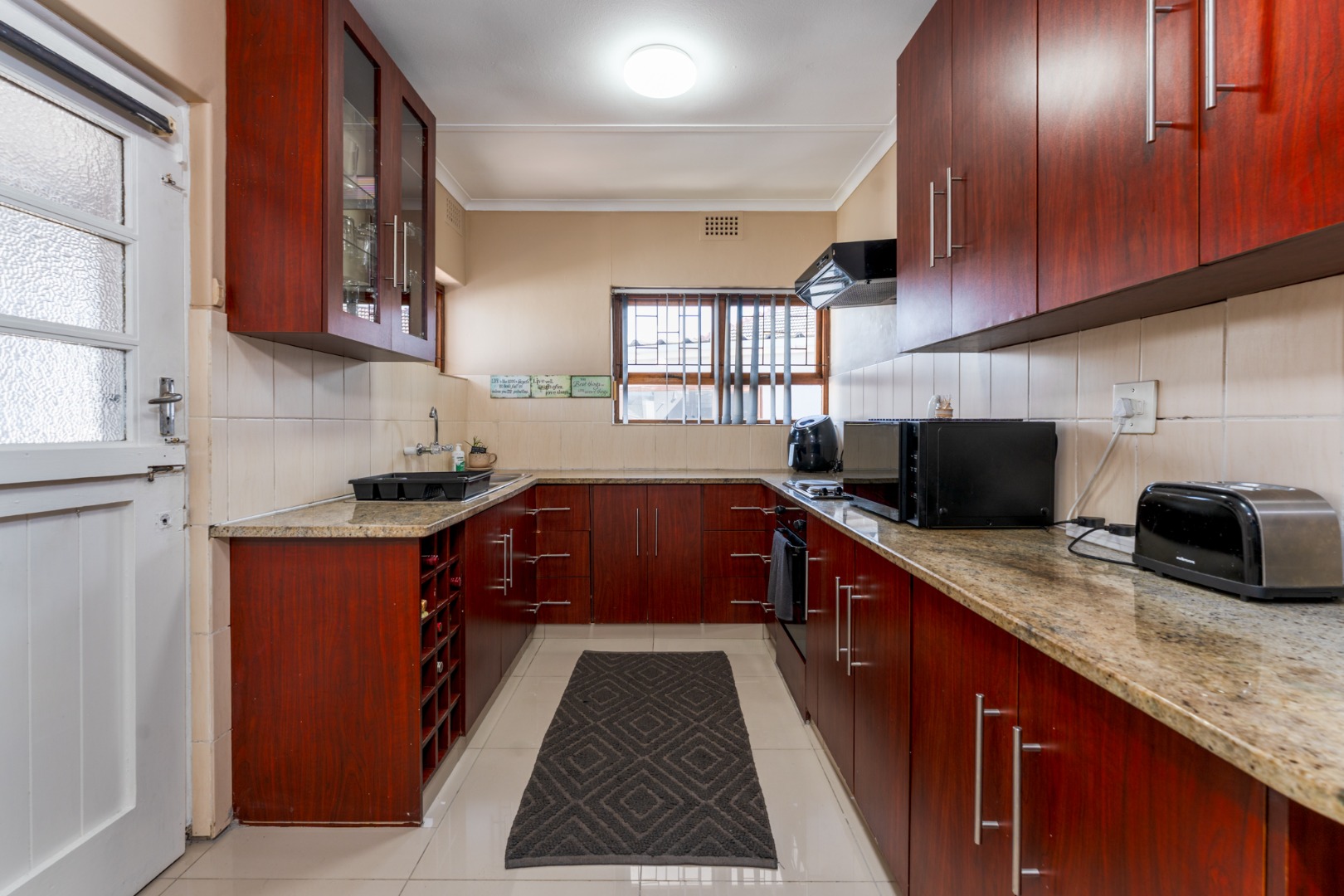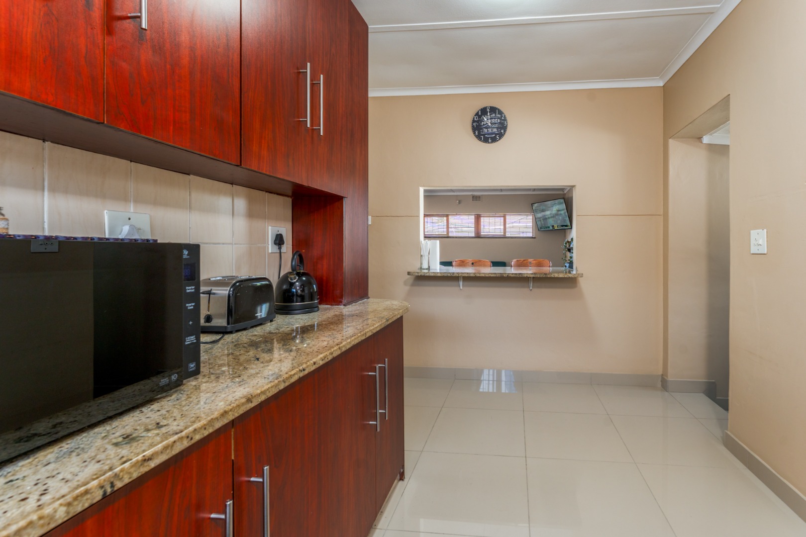 Step inside to an inviting open-plan living area, bathed in natural light from large sliding glass doors that seamlessly connect to the outdoor space. The functional U-shaped kitchen is a highlight, featuring extensive dark wood cabinetry, durable granite-look countertops, and tiled flooring. It comes equipped with built-in appliances, a convenient wine rack, and a pass-through window, perfect for entertaining.