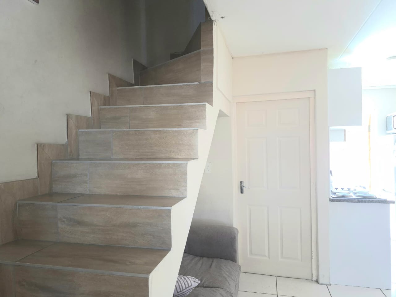 Discover this functional two-story residence, offering a practical and secure living environment. The property presents a welcoming kerb appeal with its integrated roll-up garage, providing secure parking for one vehicle, complemented by an additional covered parking space for a second vehicle. A separate pedestrian gate ensures convenient and secure access. Step inside to an efficiently designed open-plan living area, creating a cohesive space for daily activities. The modern kitchen is a highlight, featuring sleek white cabinetry, a practical tiled backsplash, and an integrated dining counter, perfect for casual meals. Natural light enhances the bright and clean aesthetic of this central hub. Upstairs, the home offers two comfortable bedrooms, each designed with light-coloured walls and ample natural light, providing a neutral canvas for personalisation. These rooms are serviced by a well-appointed bathroom, ensuring convenience for residents. Outdoor spaces are thoughtfully designed for practicality, including a covered passage that offers shelter and a dedicated area for utilities. The property benefits from security grilles on the upper-floor windows and a security gate at the main entrance, contributing to peace of mind. This home is ideal for individuals or small families seeking a compact, secure, and well-located property with essential amenities. Its functional layout and practical features make it a compelling option in the current market. Key Features: * Two-story residence * 2 Bedrooms, 1 Bathroom * 1 Lounge area * Integrated single garage * Additional covered parking for 2 vehicles * Modern kitchen with white cabinetry * Tiled backsplash and integrated dining counter * Security grilles on upper windows * Security gate at main entrance