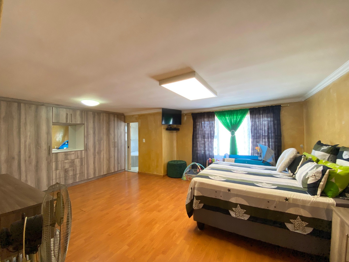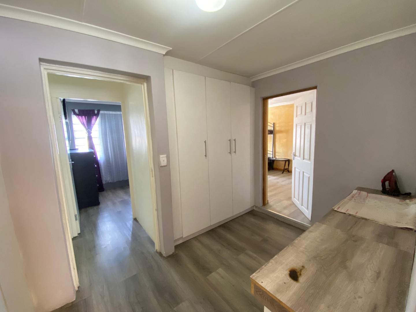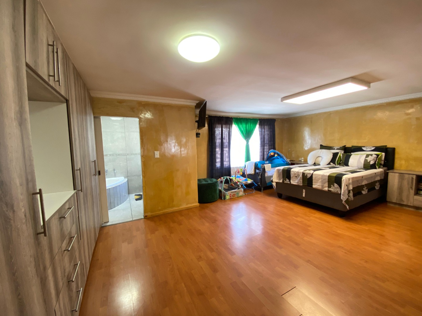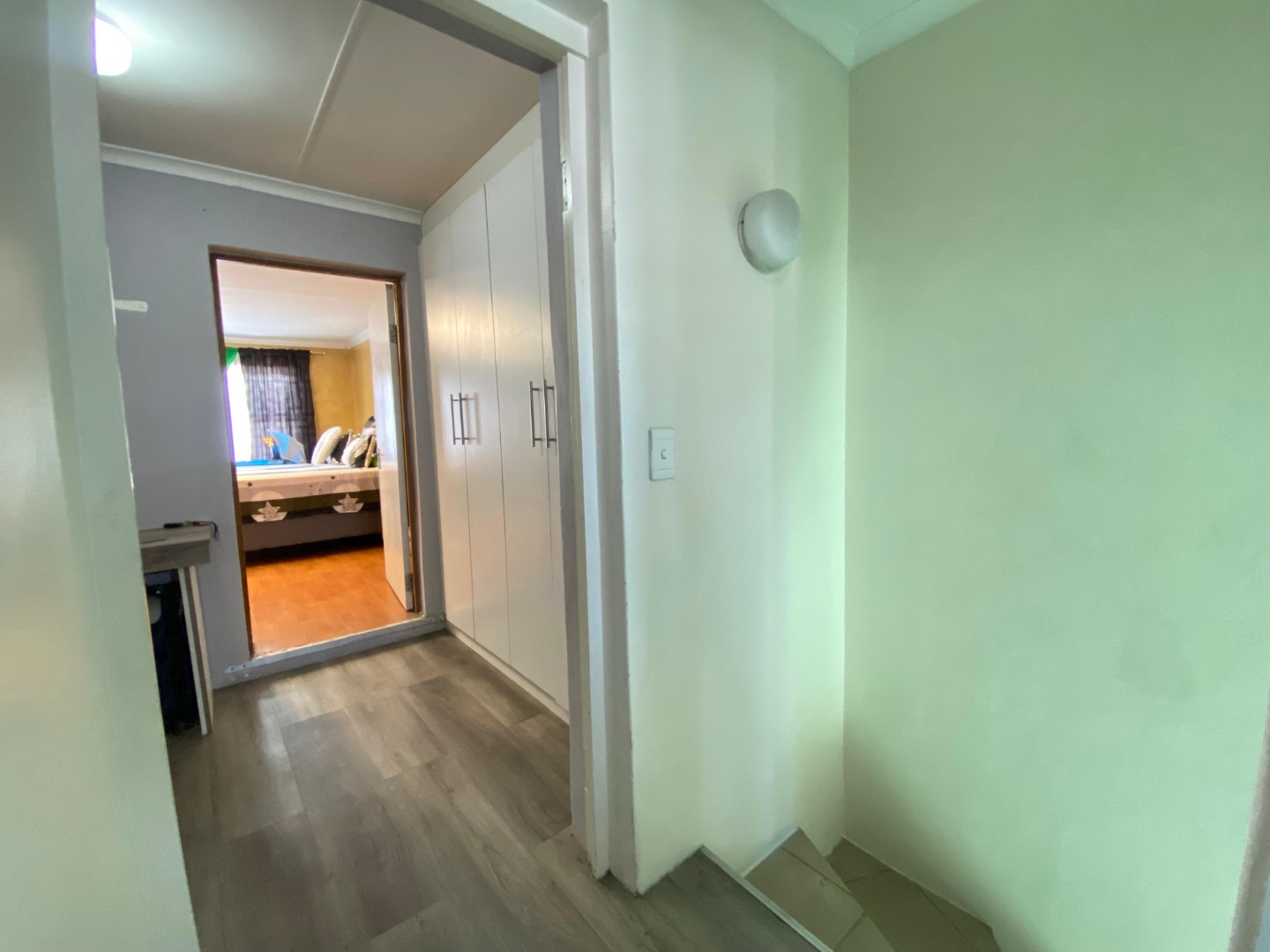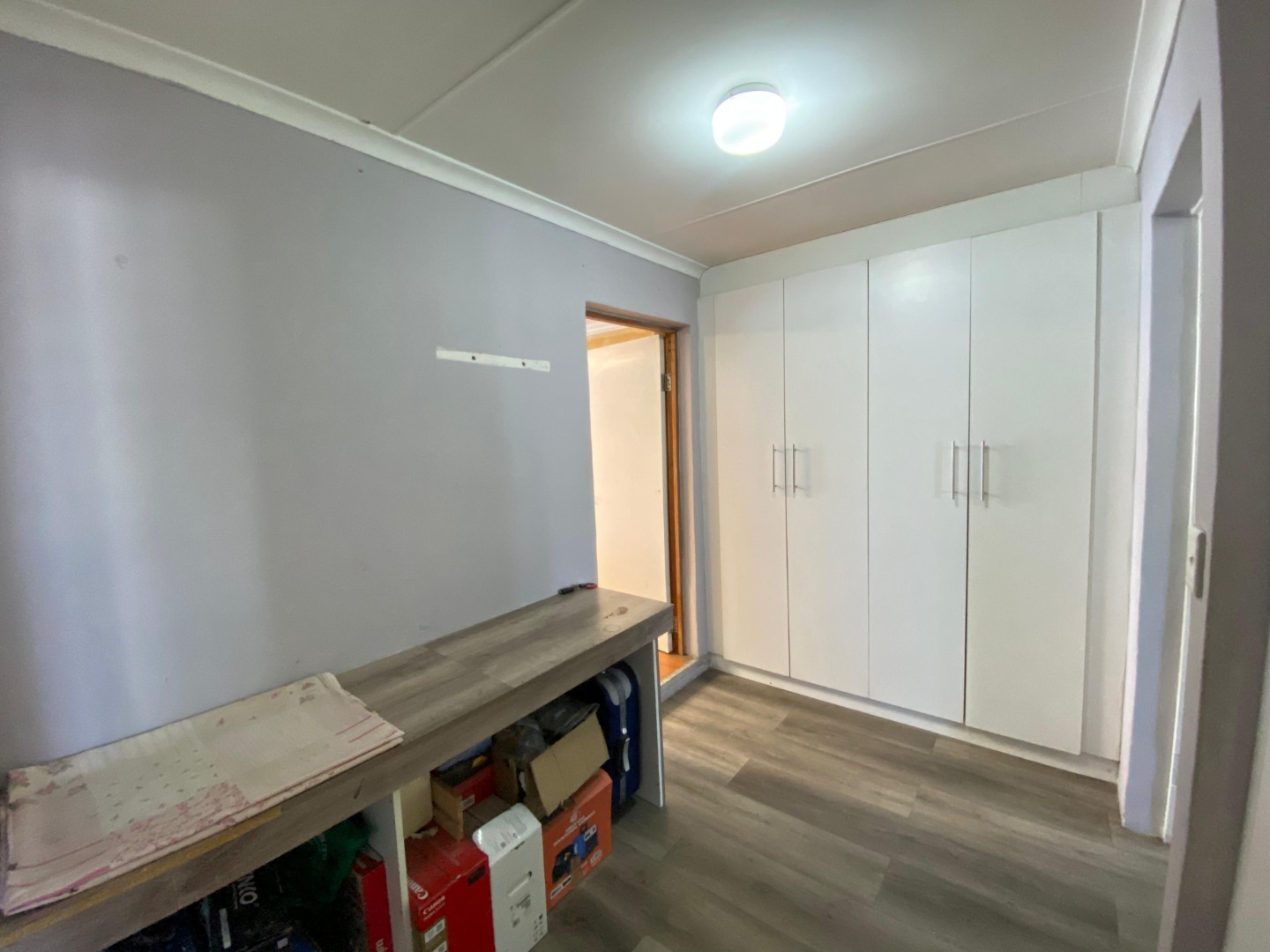 Upstairs: The upper level offers three well-sized bedrooms; all fitted with laminated flooring. Two of the bedrooms feature sleek open-plan built-in cupboards, while the generously sized main bedroom provides all the space you need, complete with a private en-suite bathroom boasting a corner bath, toilet and basin. An additional walk-through study area with built-in cupboards adds extra practicality—ideal for working from home, homework space for kids, or extra storage.