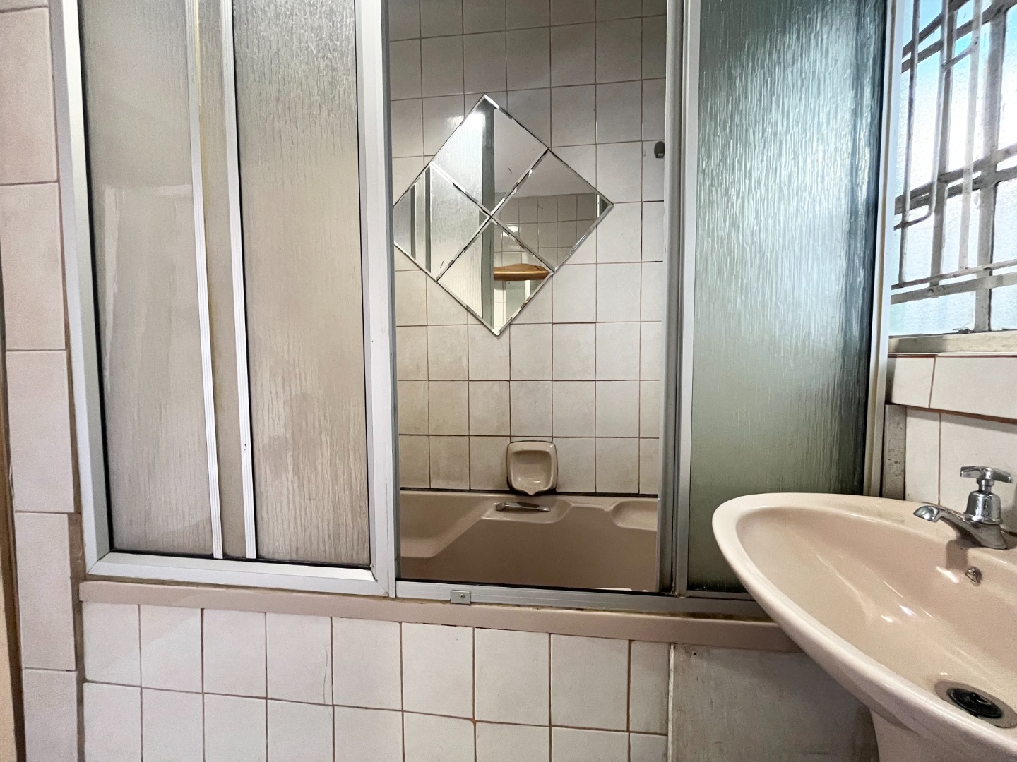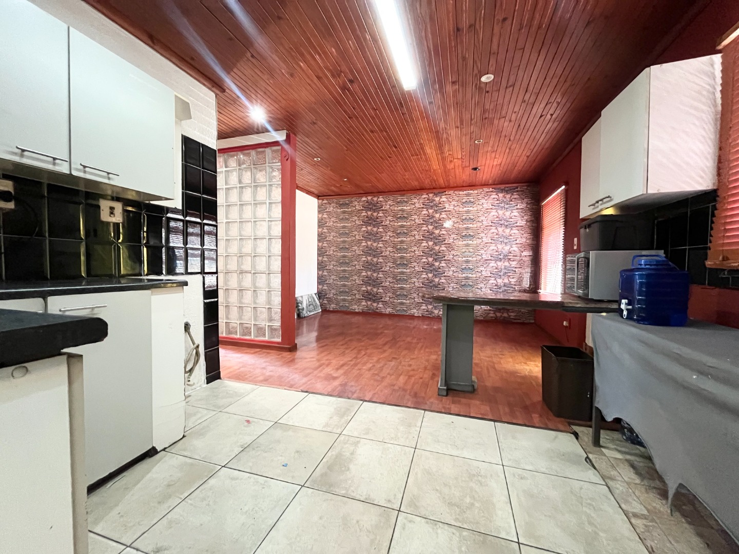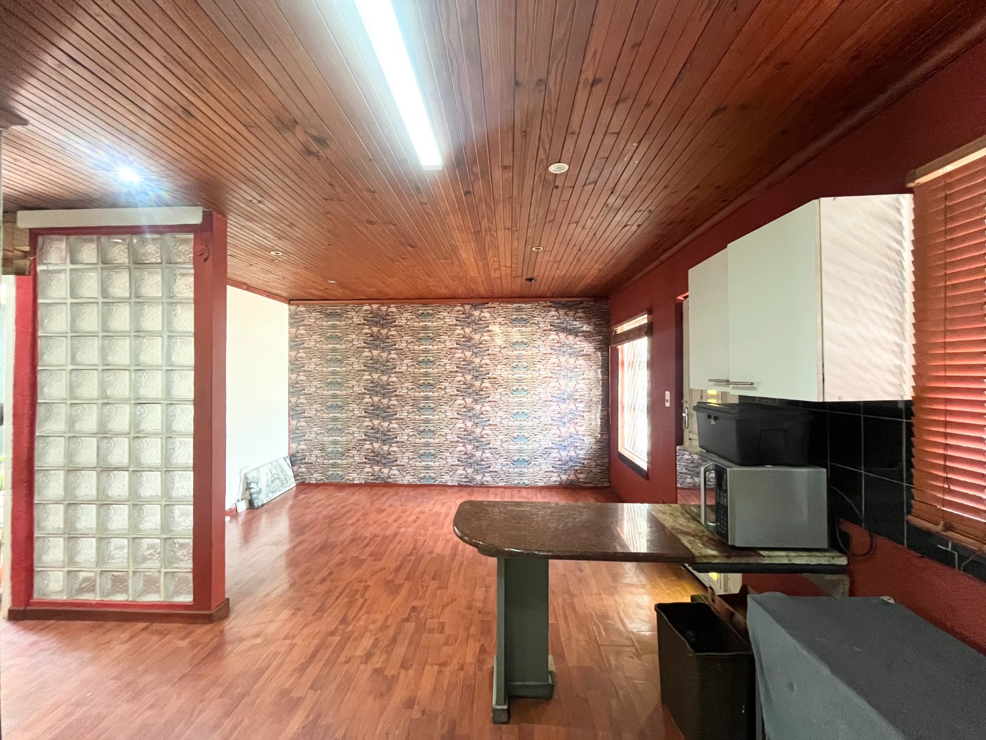 Step inside to find a functional layout designed for comfortable living. The lounge area boasts a unique wooden plank ceiling and a distinctive glass block partition, adding character and natural light. The kitchen, while presenting an opportunity for renovation, features a corner layout with white cabinets and dark countertops, ready for your personal touch. A built-in bar counter further enhances the entertainment potential of the open-plan living space.