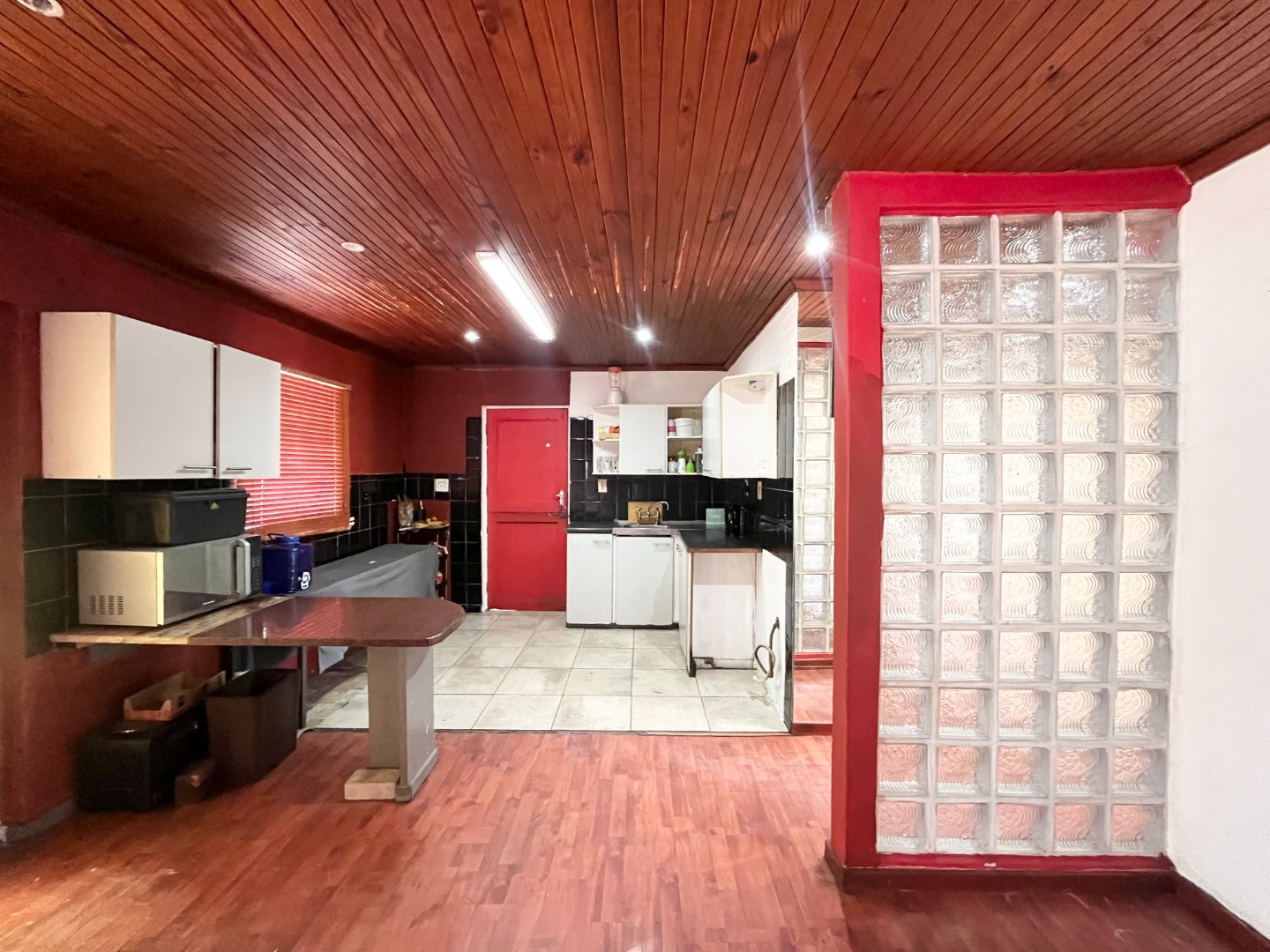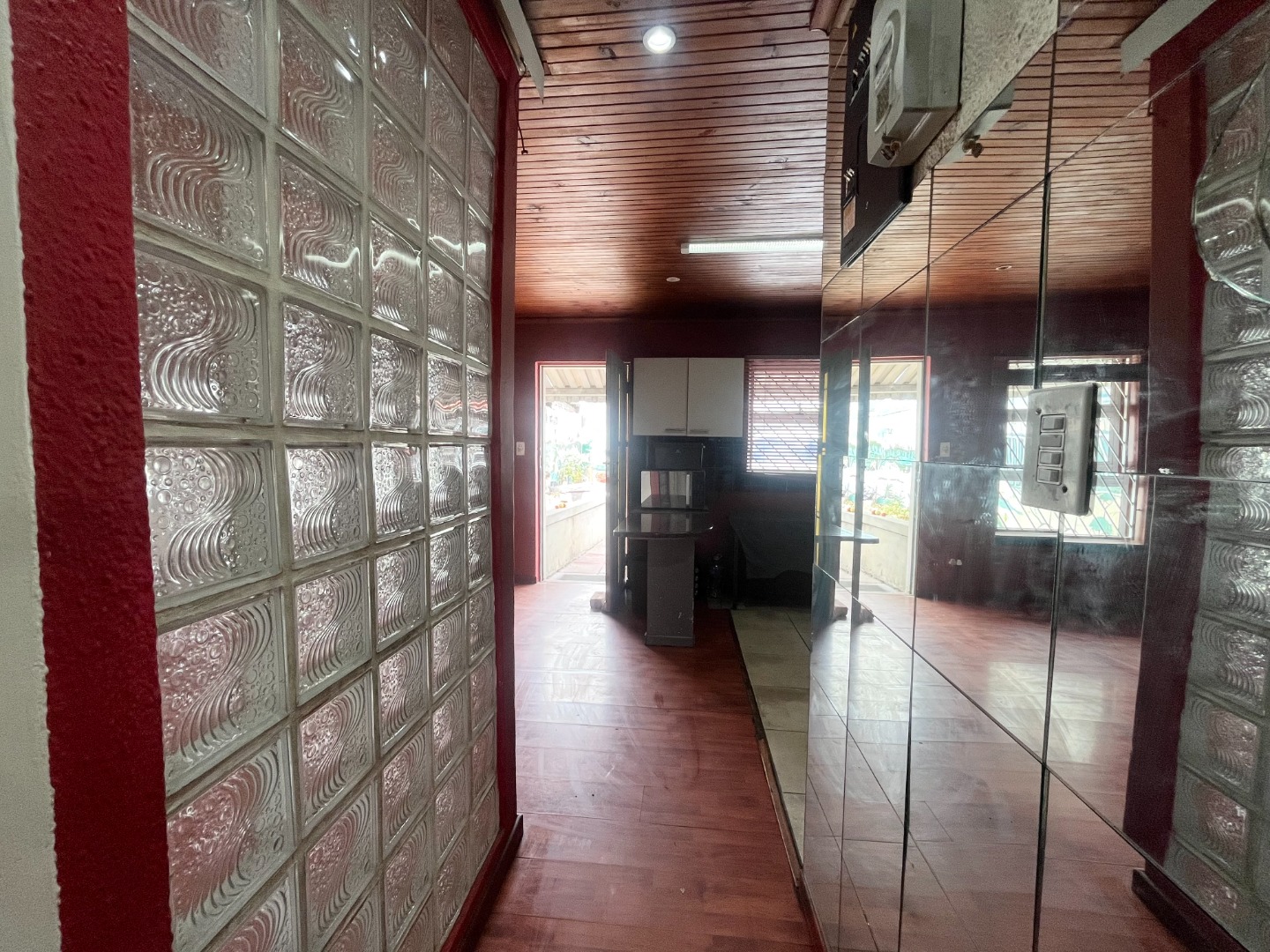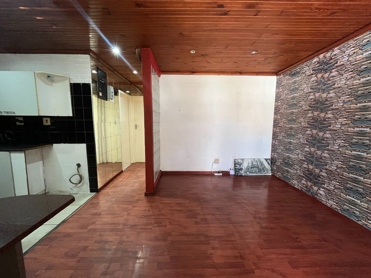 Step inside to find a functional layout designed for comfortable living. The lounge area boasts a unique wooden plank ceiling and a distinctive glass block partition, adding character and natural light. The kitchen, while presenting an opportunity for renovation, features a corner layout with white cabinets and dark countertops, ready for your personal touch. A built-in bar counter further enhances the entertainment potential of the open-plan living space.