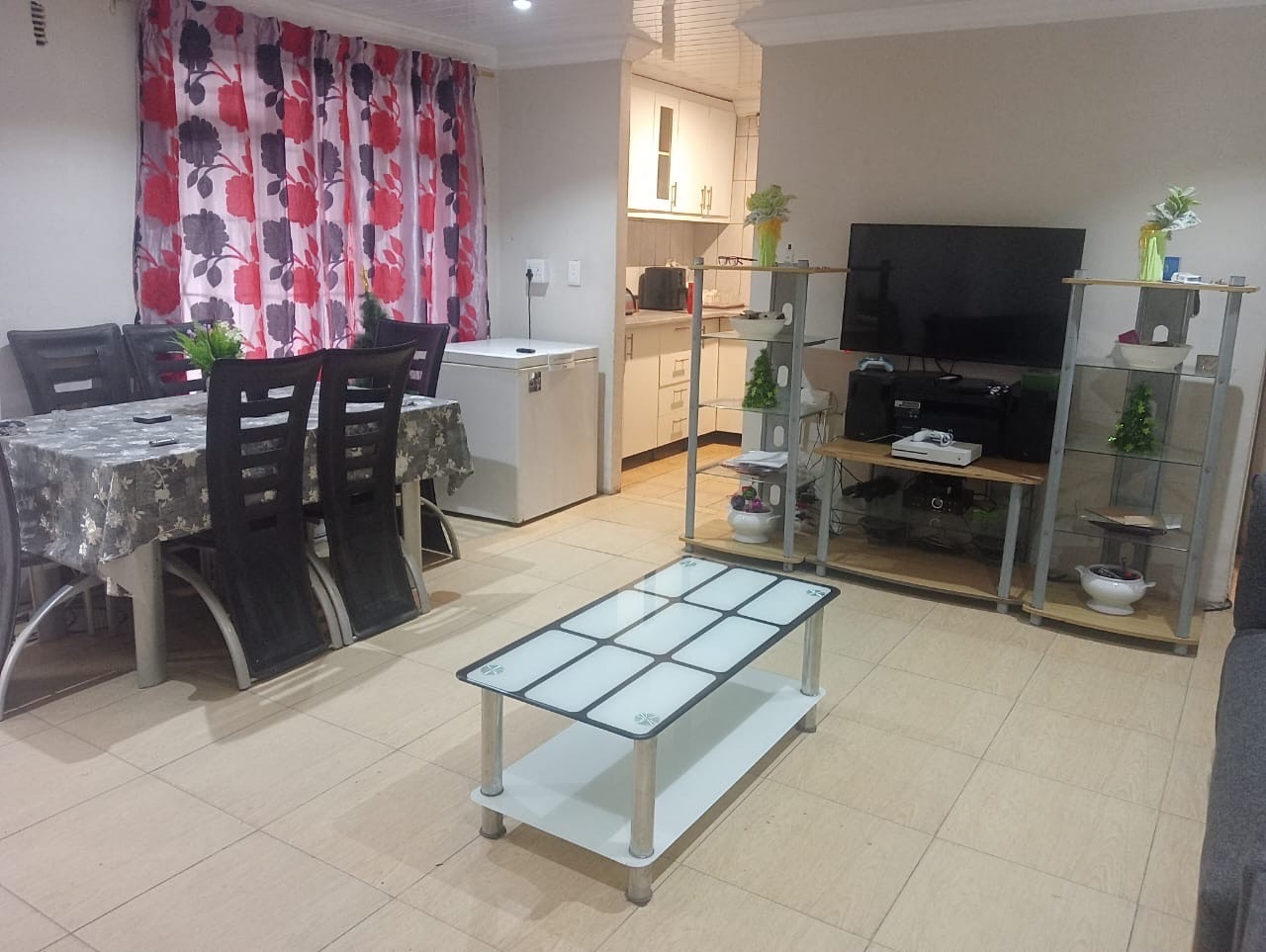The interior of this 71 sqm home is thoughtfully designed for modern living. The open-plan layout seamlessly connects the lounge and dining areas, creating a versatile space for relaxation and entertaining. Tiled flooring extends throughout these living zones, ensuring easy maintenance and a clean aesthetic. The kitchen features modern white cabinetry, an L-shaped countertop with a double sink, and a window that allows for natural light, providing a functional and bright culinary environment.