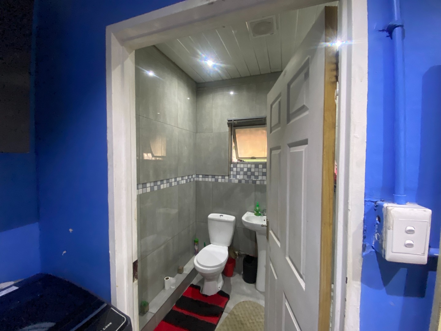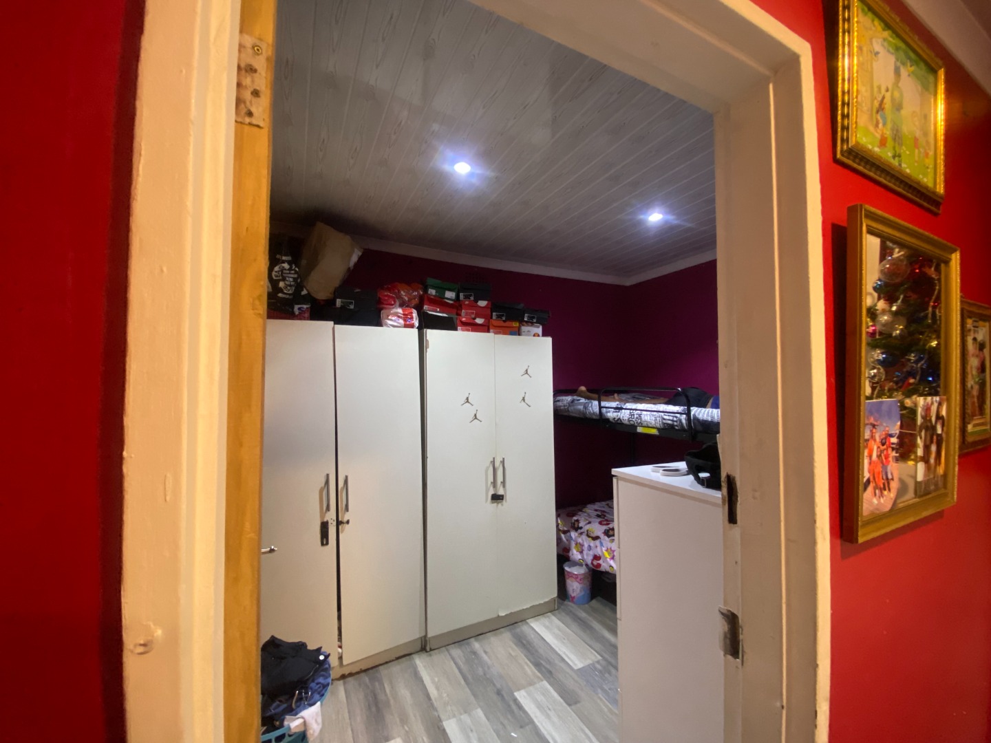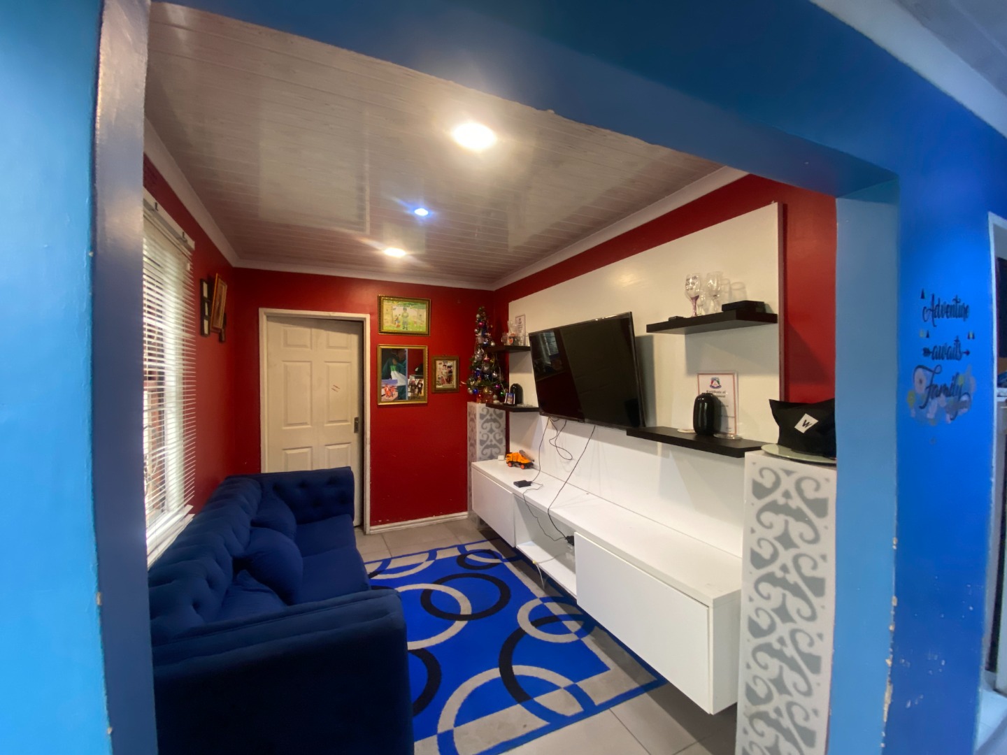 The interior boasts a distinctive character, starting with a U-shaped kitchen designed for efficiency. It features bright red cabinetry, black countertops, and a convenient breakfast bar.The adjacent lounge area is equally expressive, with bold red walls, and a unique white wood-paneled ceiling, creating a lively atmosphere.