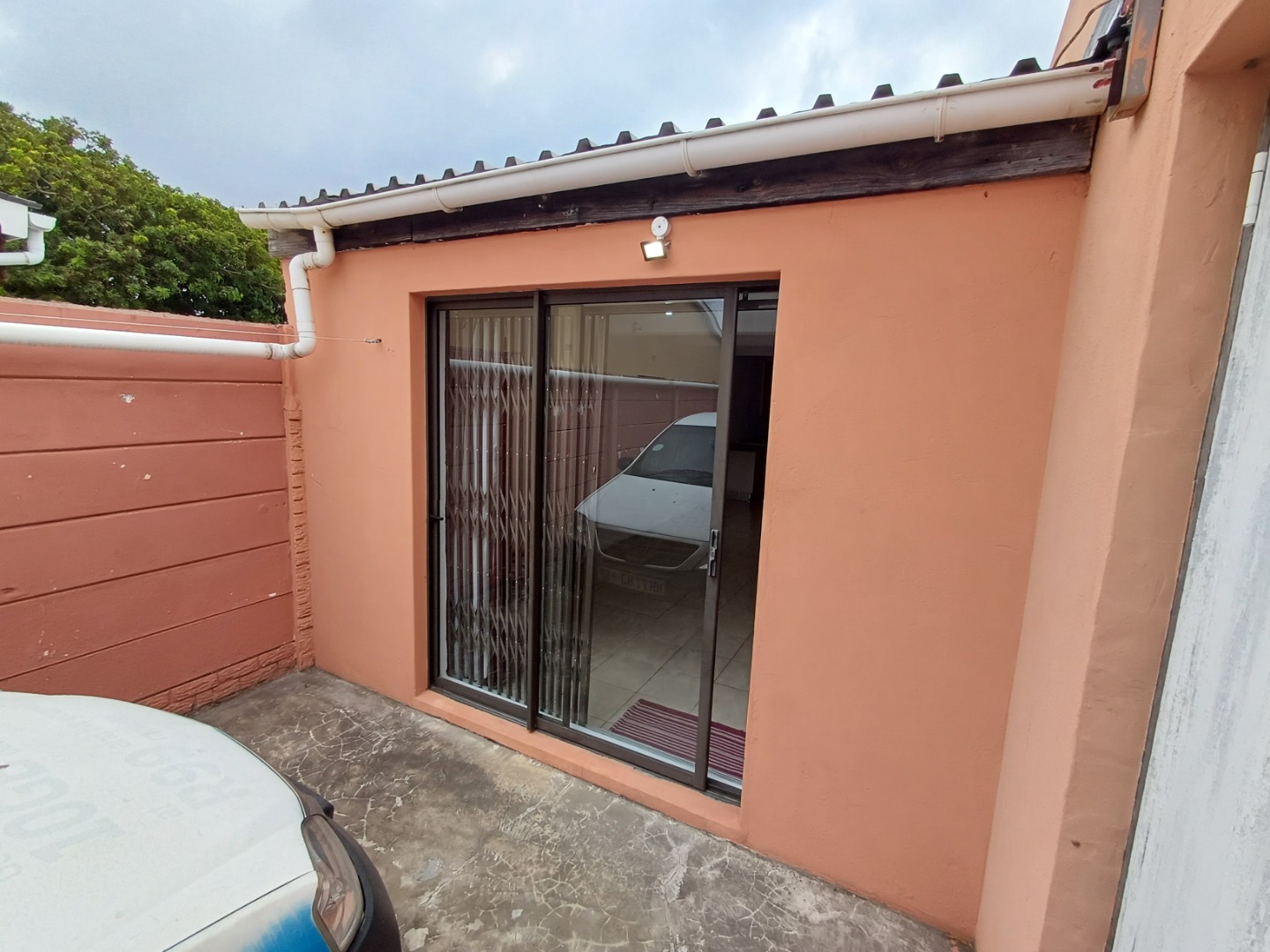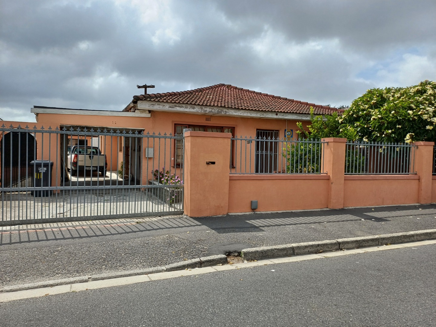 Outside, the property boasts a secure perimeter with high fencing and a sliding gate, giving you peace of mind. You'll also appreciate the off-street parking, so your car is always safe and sound. For added security, there's a visible alarm system and a security gate on the sliding glass door, making this a true lock-up-and-go option. The peach/orange exterior gives it a warm, inviting feel, and the mature landscaping in the front yard adds a touch of greenery.