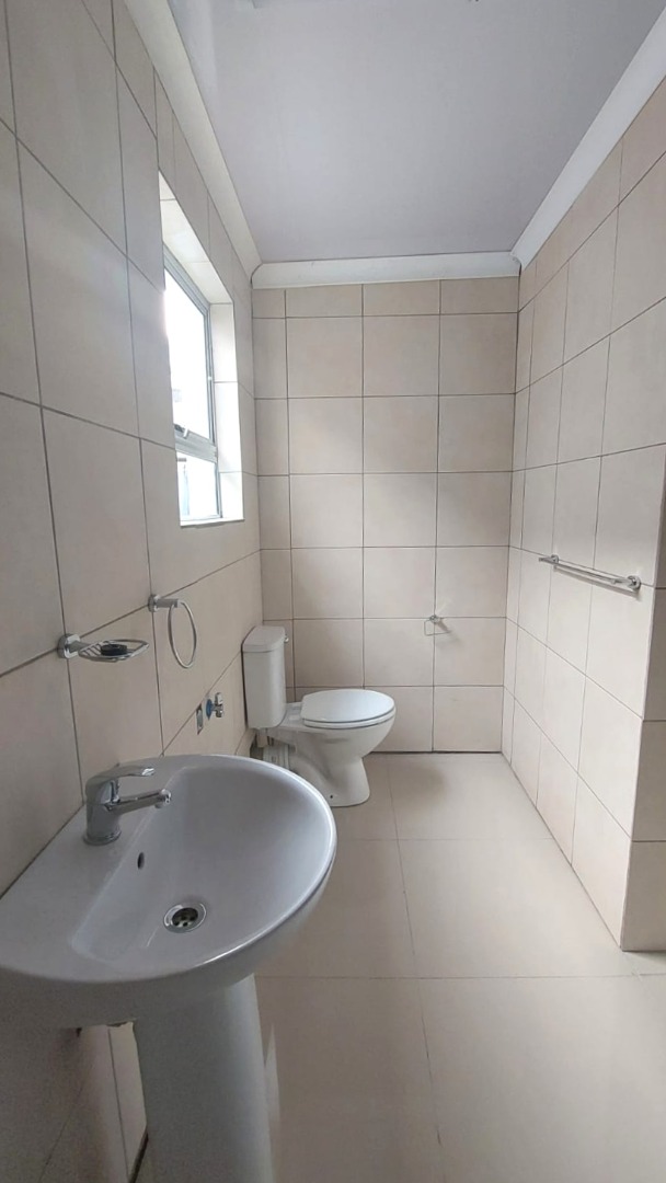The single bedroom is equipped with extensive built-in white wardrobes, providing significant storage solutions. It is finished off with light-coloured tiled flooring and neutral-painted walls, creating a serene retreat. The ensuite bathroom is fully tiled from floor to ceiling, featuring a modern pedestal sink, a toilet, and a shower area. A large window ensures ample natural light, contributing to a fresh and airy feel.