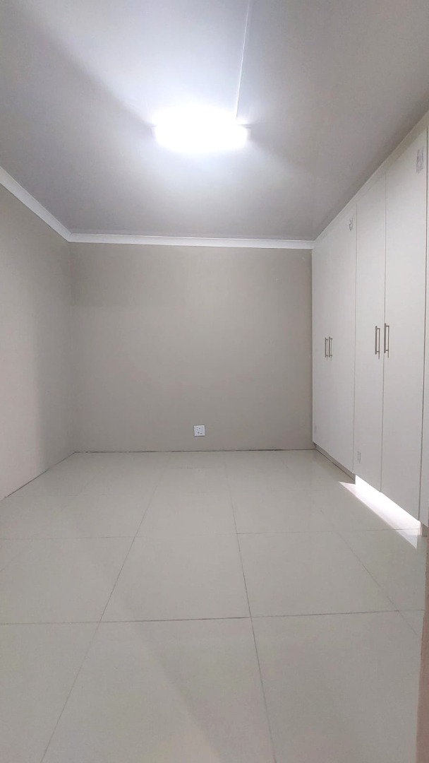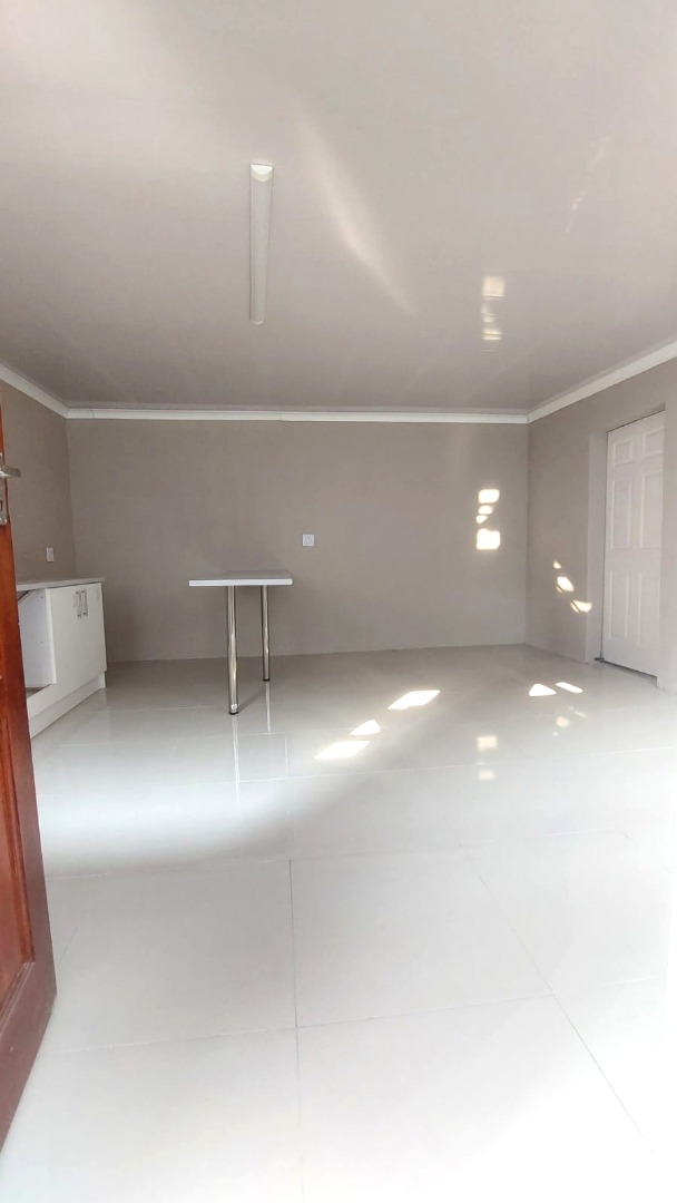 This modern 1-bedroom rental in Belgravia, Cape Town, offers a comfortable and practical living space. The property features a well-appointed kitchenette designed with a clean aesthetic, boasting light-coloured walls, white tiled flooring, and white built-in base cabinets. Natural light streams in, enhancing the bright and inviting atmosphere of this central living area.