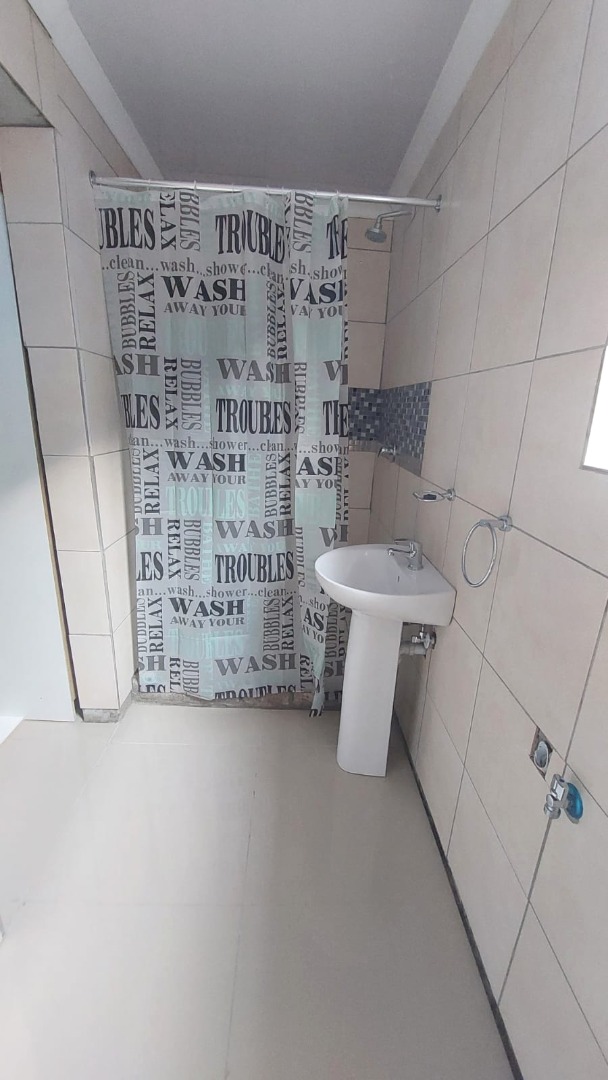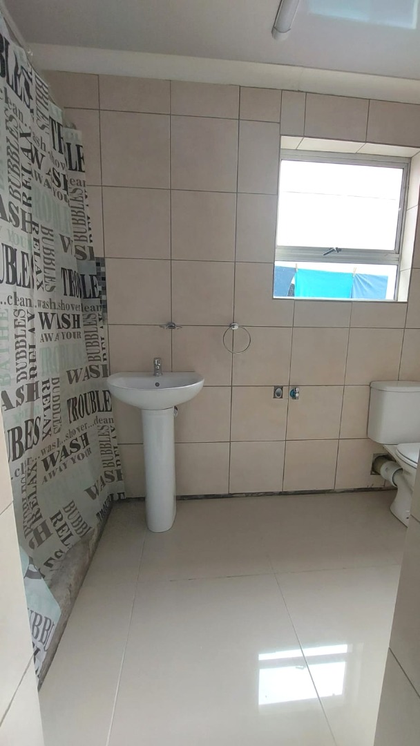 The single bedroom is equipped with extensive built-in white wardrobes, providing significant storage solutions. It is finished off with light-coloured tiled flooring and neutral-painted walls, creating a serene retreat. The ensuite bathroom is fully tiled from floor to ceiling, featuring a modern pedestal sink, a toilet, and a shower area. A large window ensures ample natural light, contributing to a fresh and airy feel.
