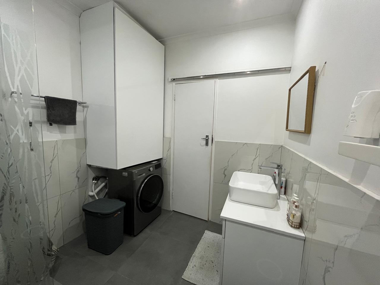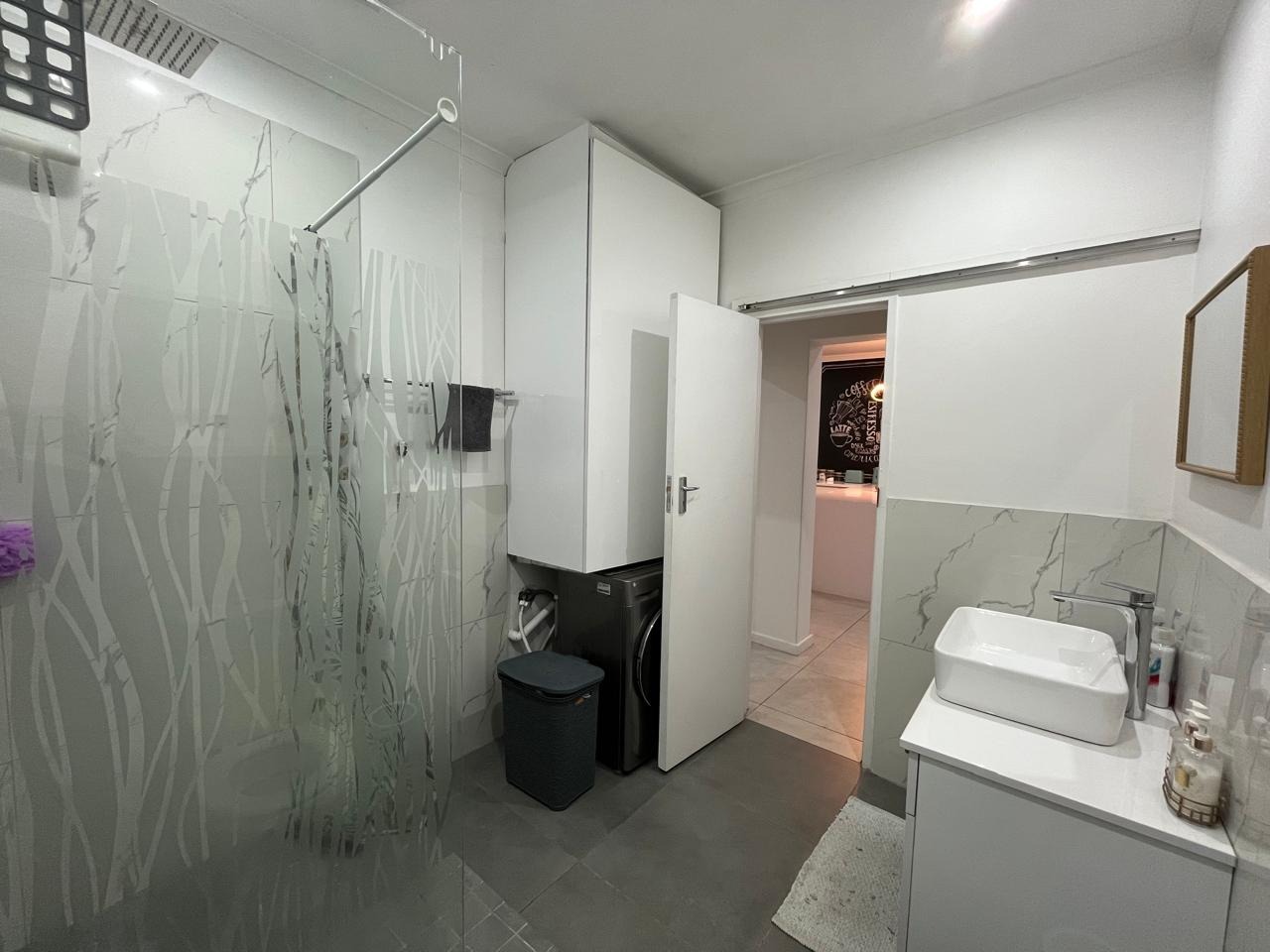 This upmarket bathroom are designed with elegance and functionality in mind. Equipped with high-quality fixtures, modern tiling, and a spacious shower, basin and toilet.