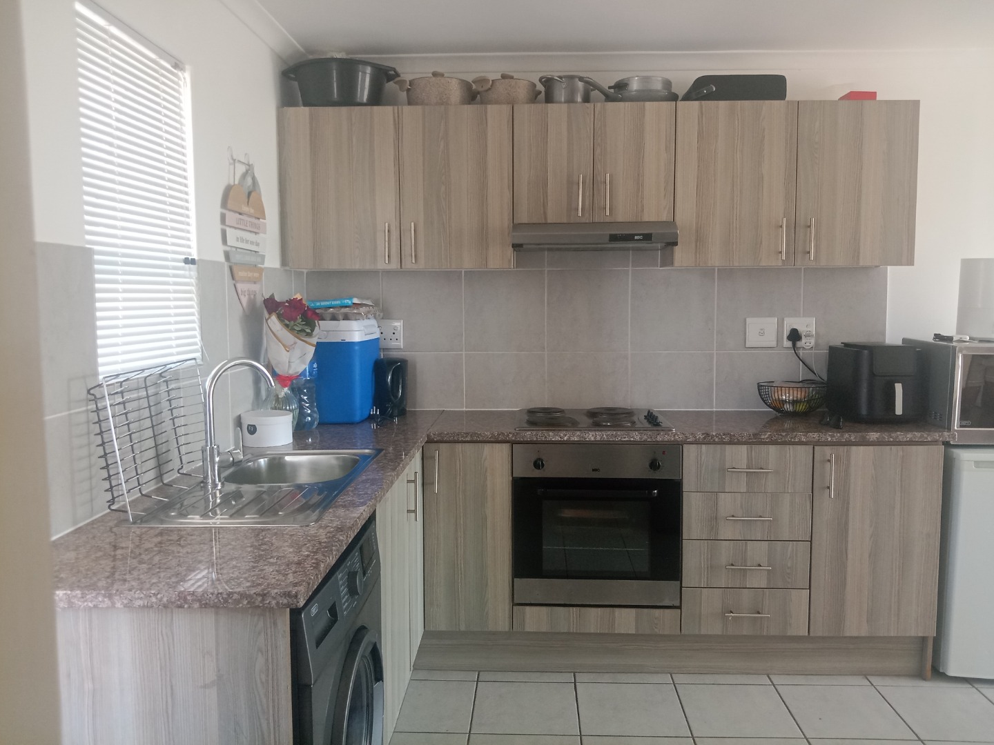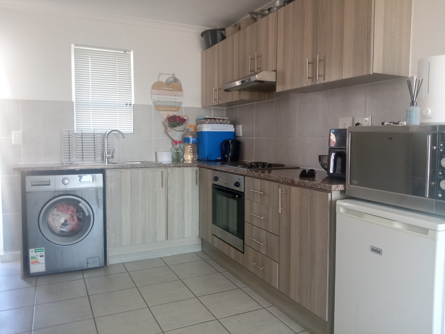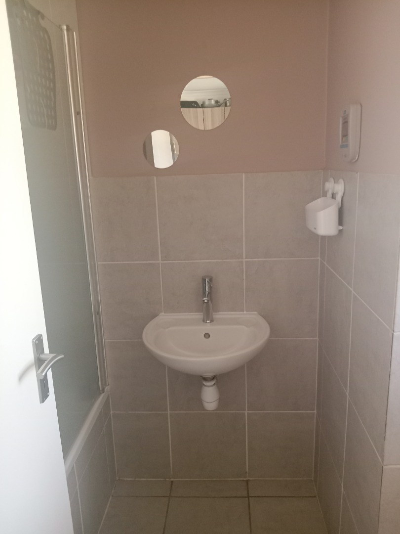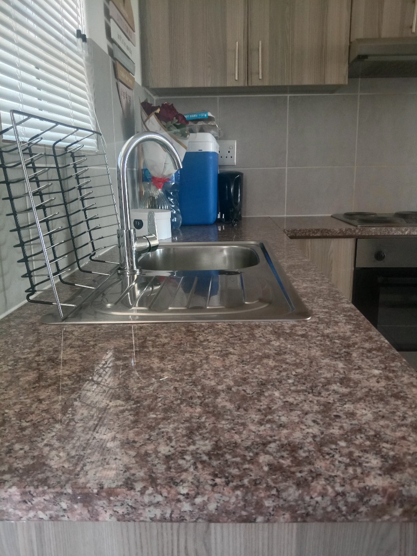Neat and secure, this first floor flat offers an open plan modern open kitchen, with built in cupboards, hob and oven. Granite kitchen tops and modern layout includes an undercounter washing machine point. Lounge is sunny and cosy , fiber and DSTV ready, overlooks the local nature reserve. Spacious bedroom with laminated floors and built in cupboards for extra storage. Bathroom is neat and comes with an overhead shower.
