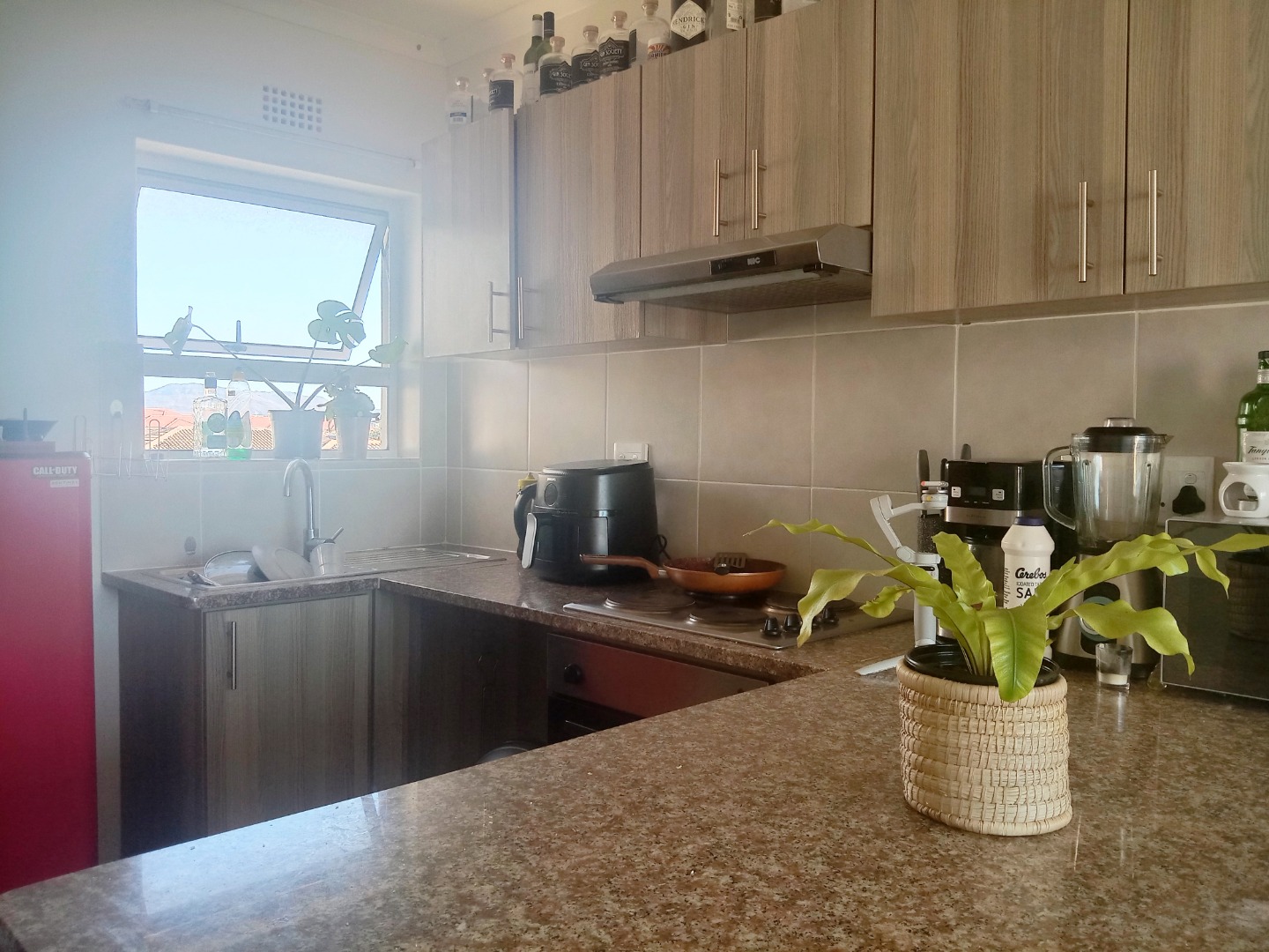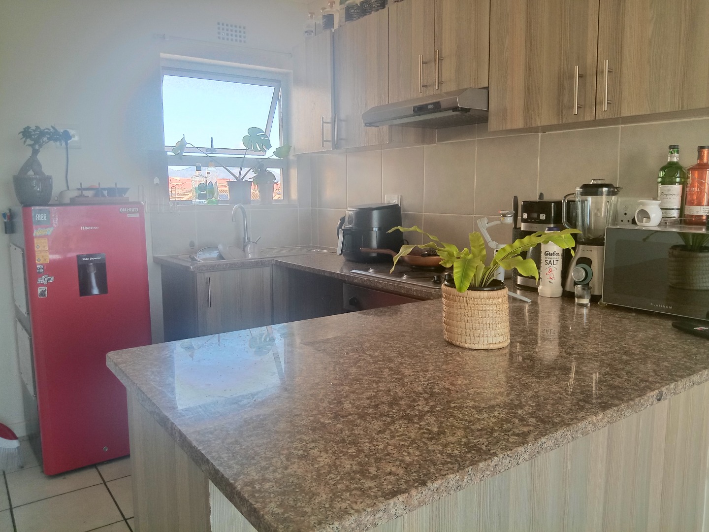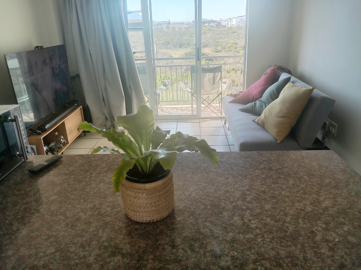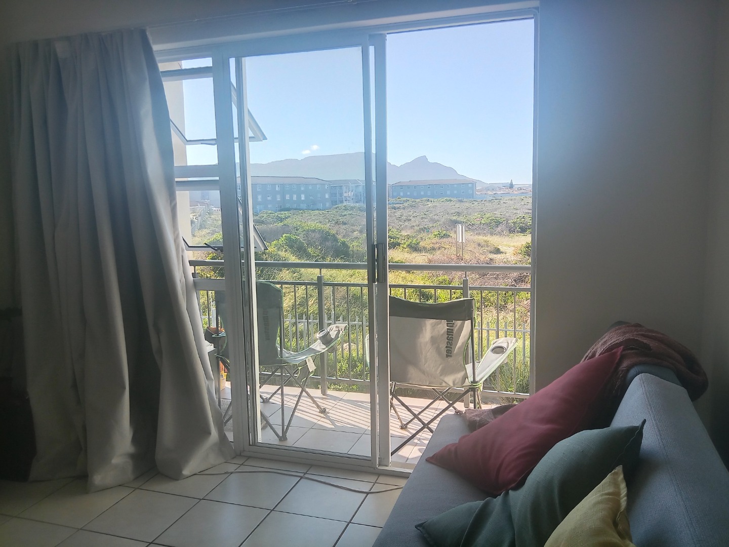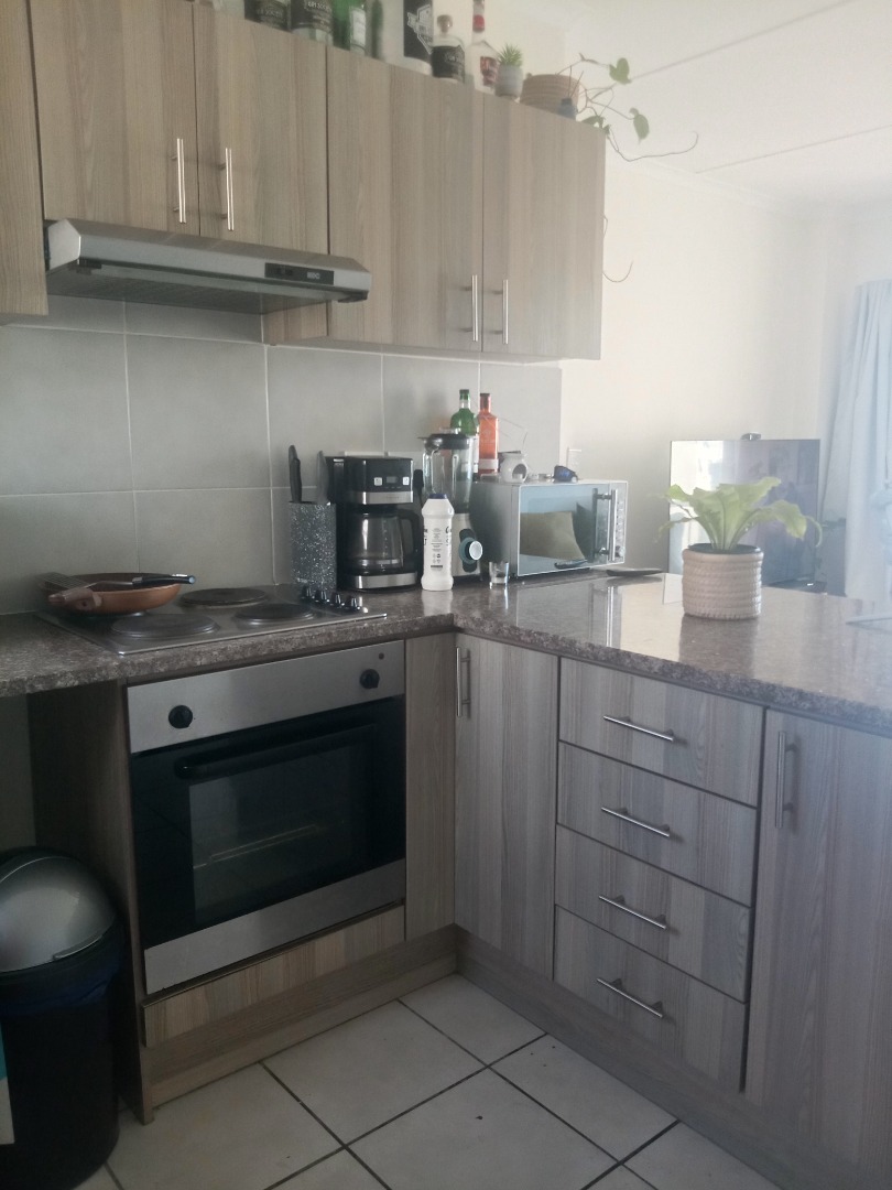 Neat and secure 2 bedroom flat available in sought after Ocean Breeze complex. Offers open plan kitchen with granite breakfast top. Undercounter washing machine point. Built in cupboards with oven and hob. Tiled lounge with sliding doors lead to balcony for spectacular mountain, sunset and nature reserve views. Both bedrooms are spacious, with laminated floors and come with built in cupboards. Bathroom with bath and overhead shower.