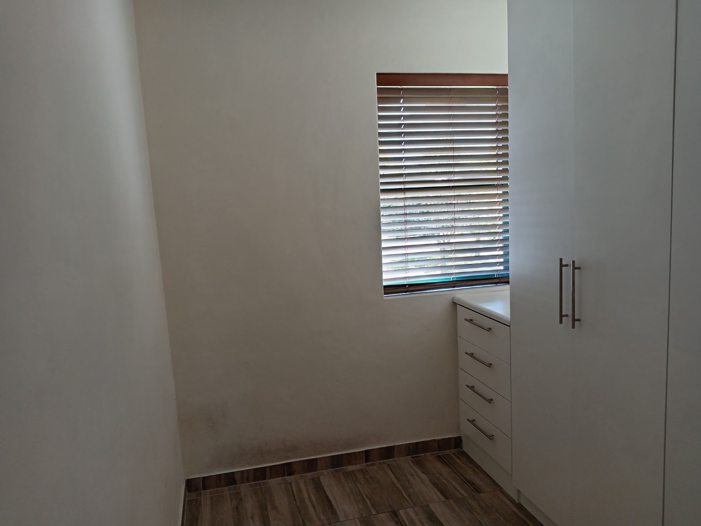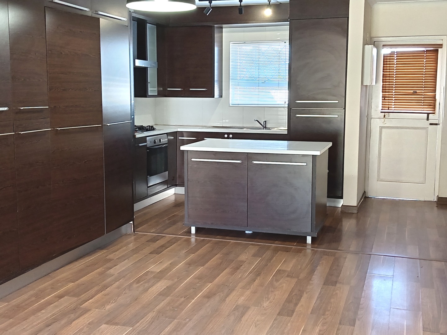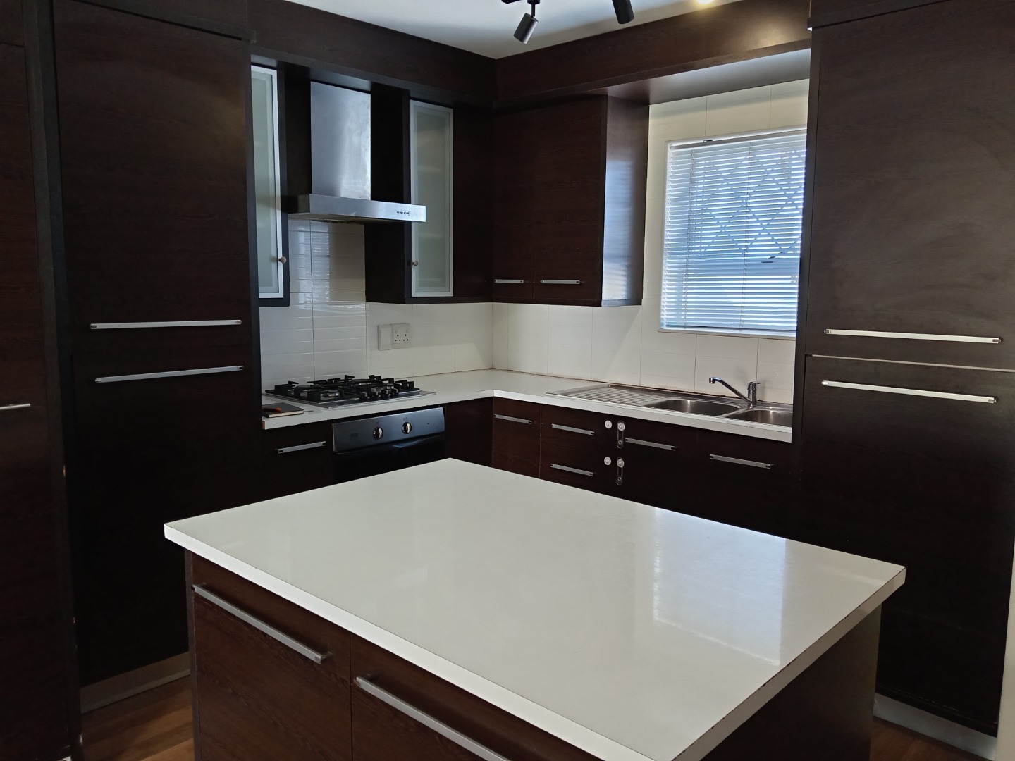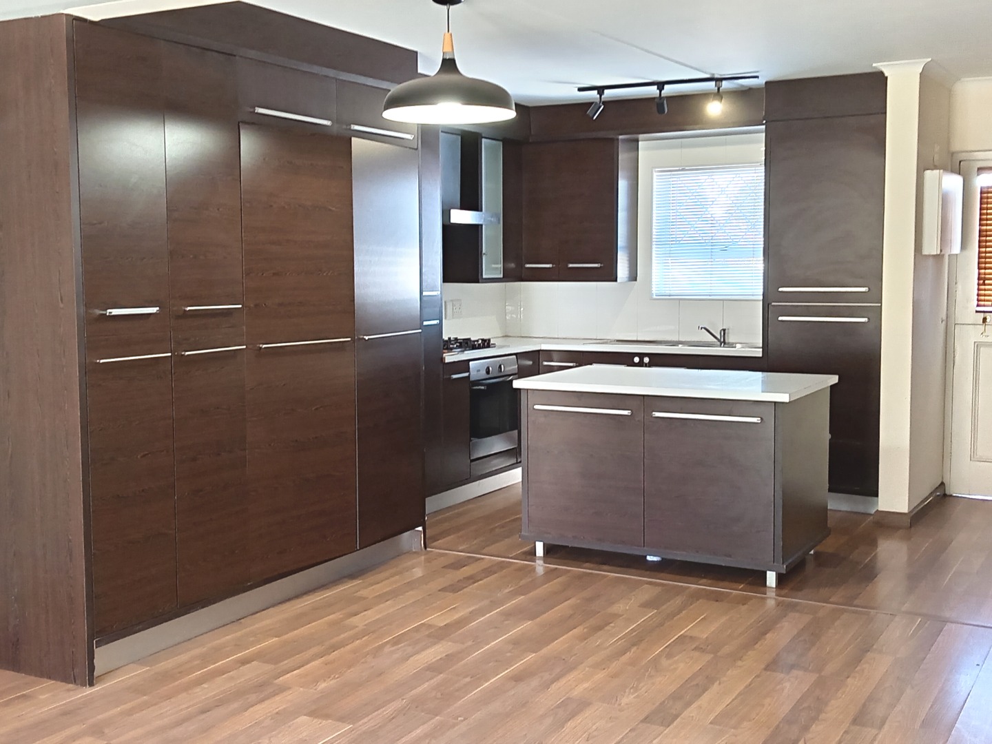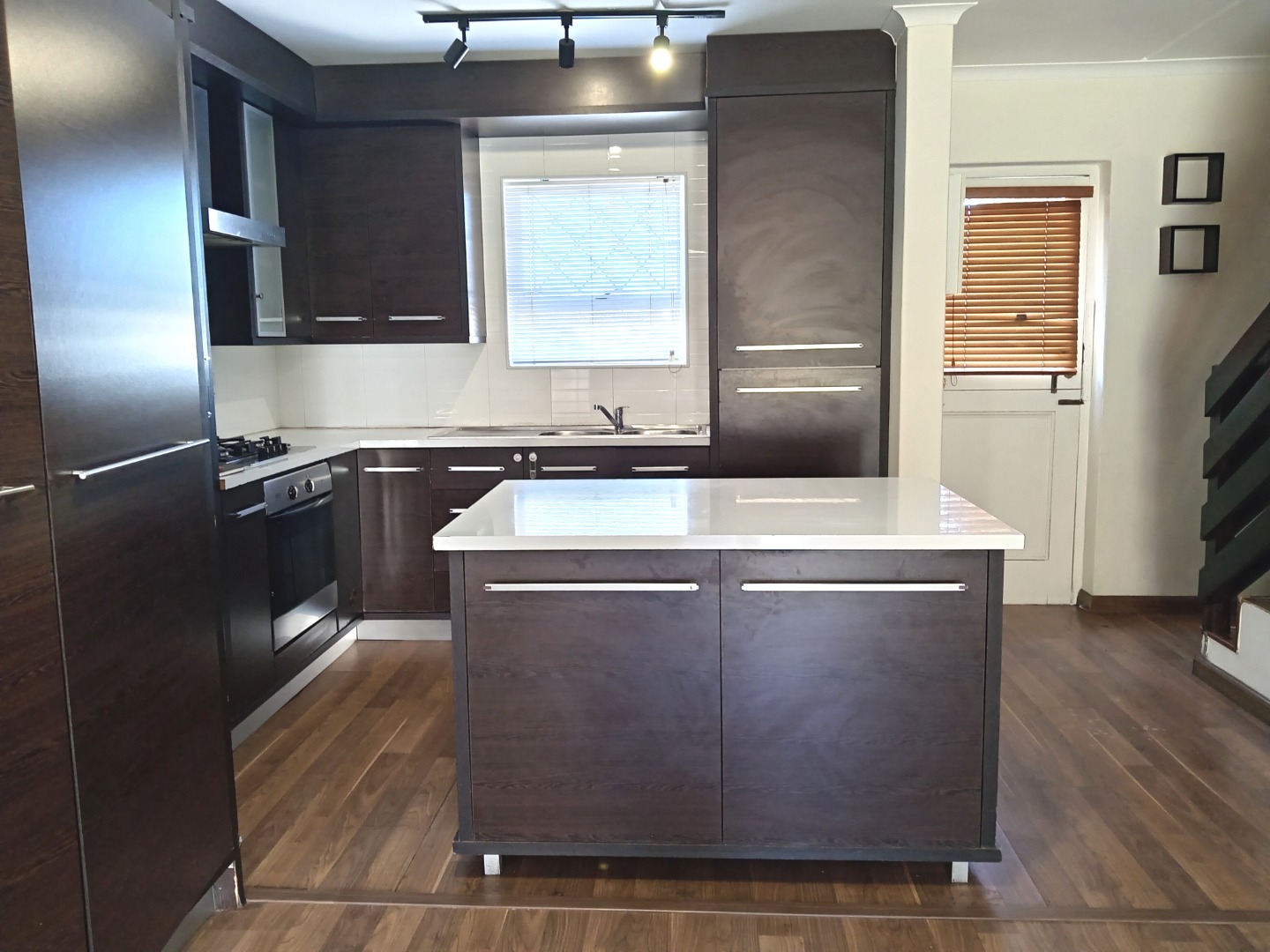 Discover comfortable living in this inviting 3-bedroom, 1-bathroom rental property located within a secure complex in Rondebosch East, Cape Town. This residence offers a practical layout designed for modern lifestyles. The contemporary kitchen is a highlight, boasting sleek dark wood-effect cabinetry, ample storage including full-height pantry units, and pristine white countertops with a subway tile-style backsplash. Integrated appliances, including a hob and oven, enhance functionality, complemented by a versatile kitchen island for additional workspace. A comfortable lounge area completes the interior living spaces.