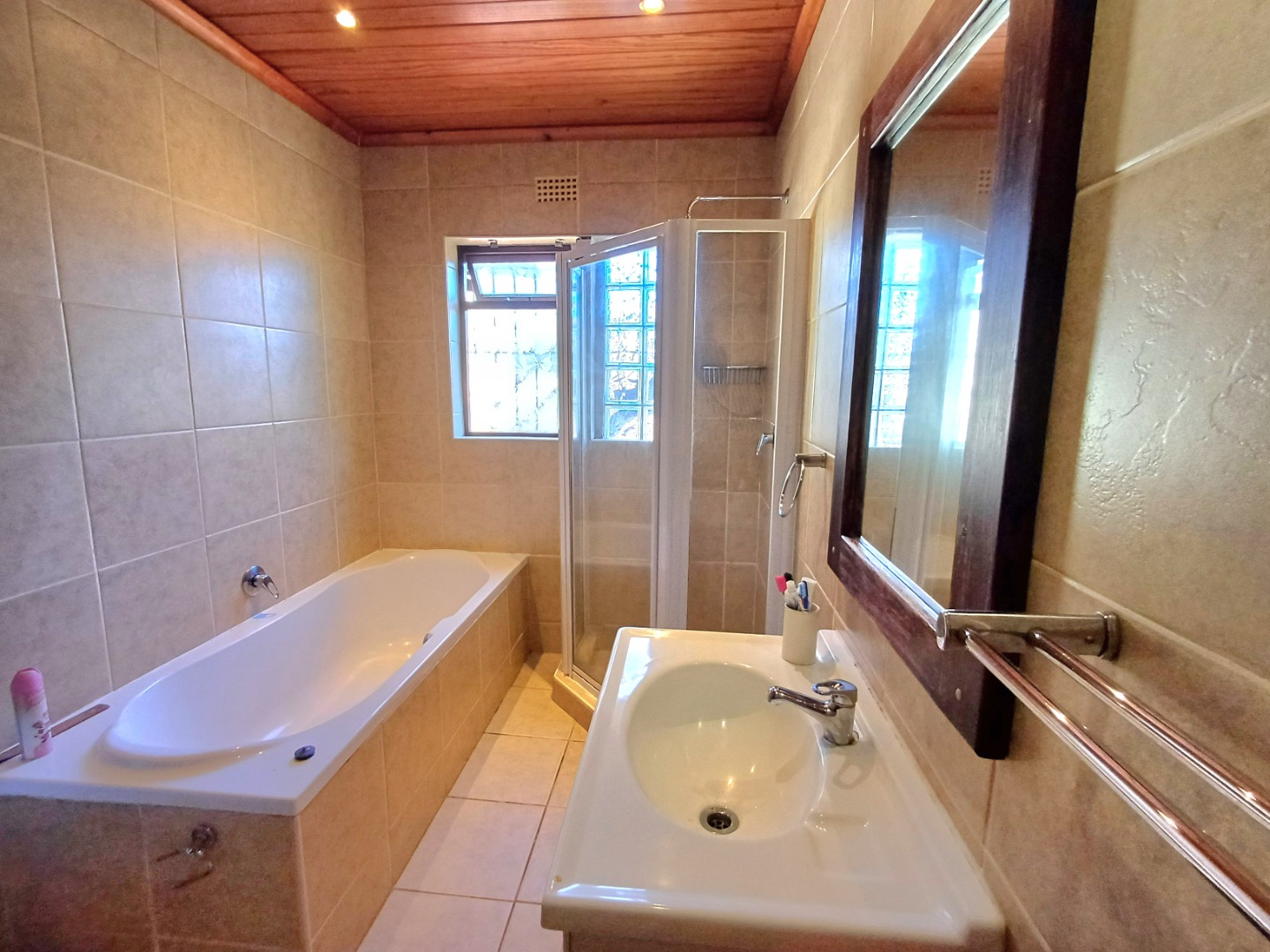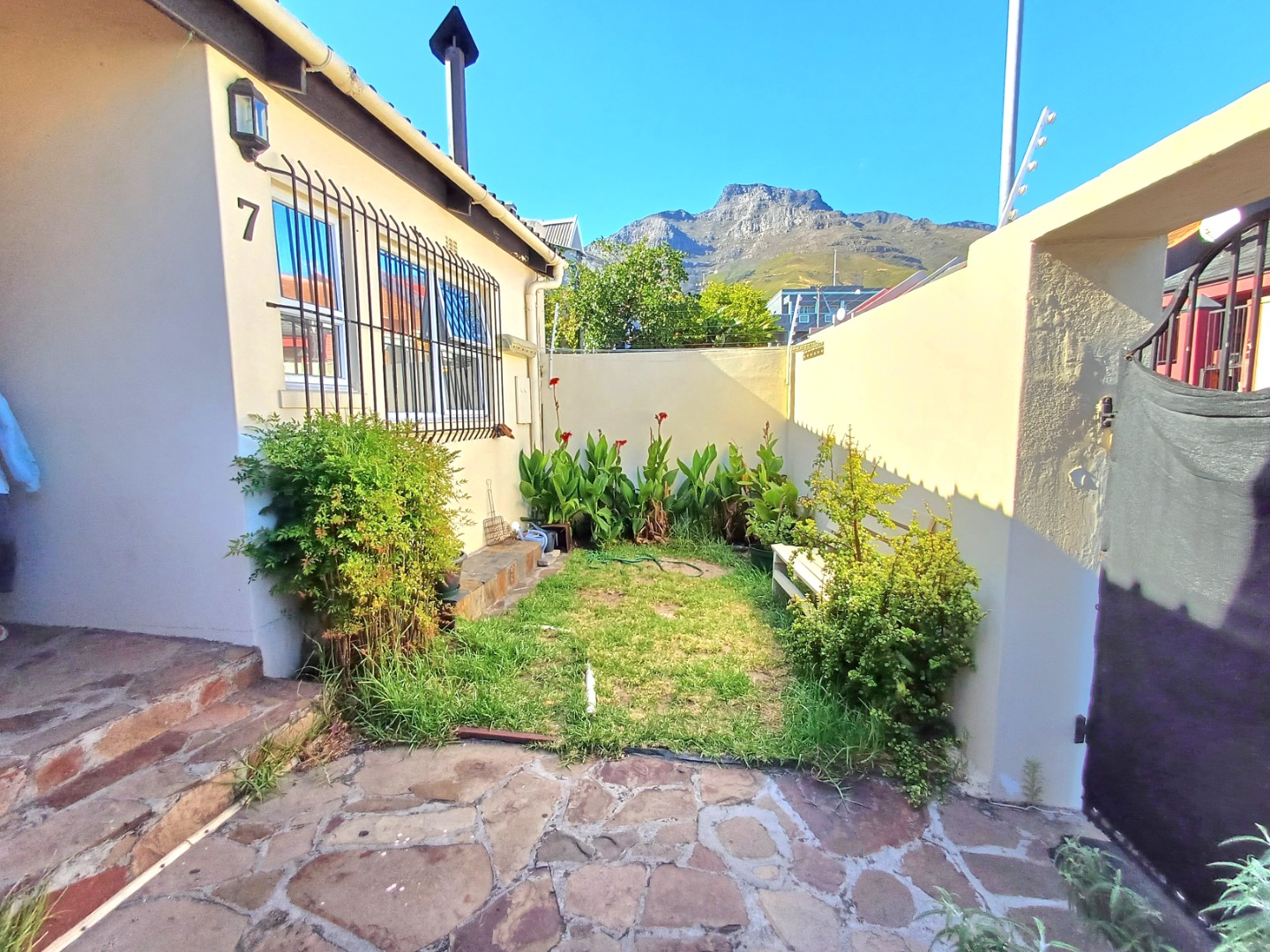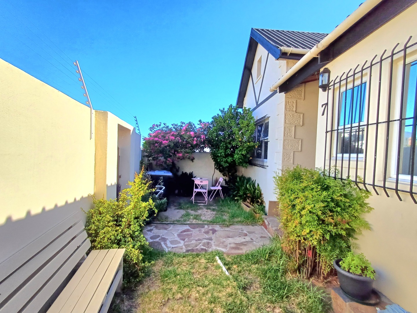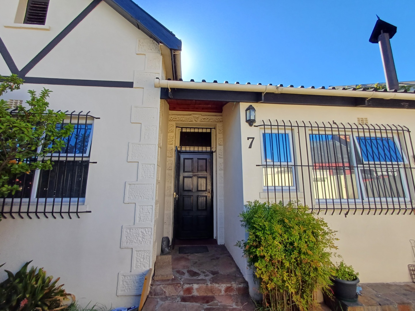 Security is well-considered here, giving you peace of mind. You'll notice visible security measures like an electric fence, security bars on the windows, ensuring a safe environment. The property also features a charming front garden area with flowering plants, adding to its curb appeal.