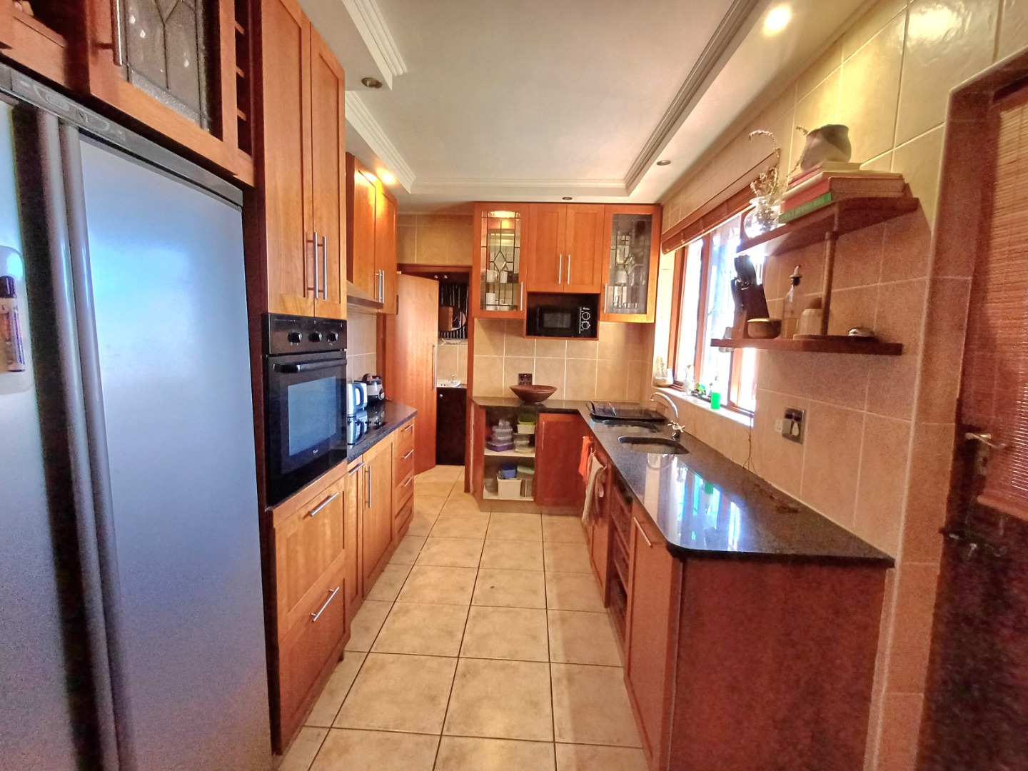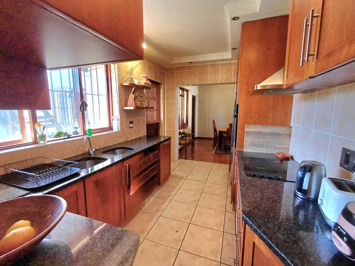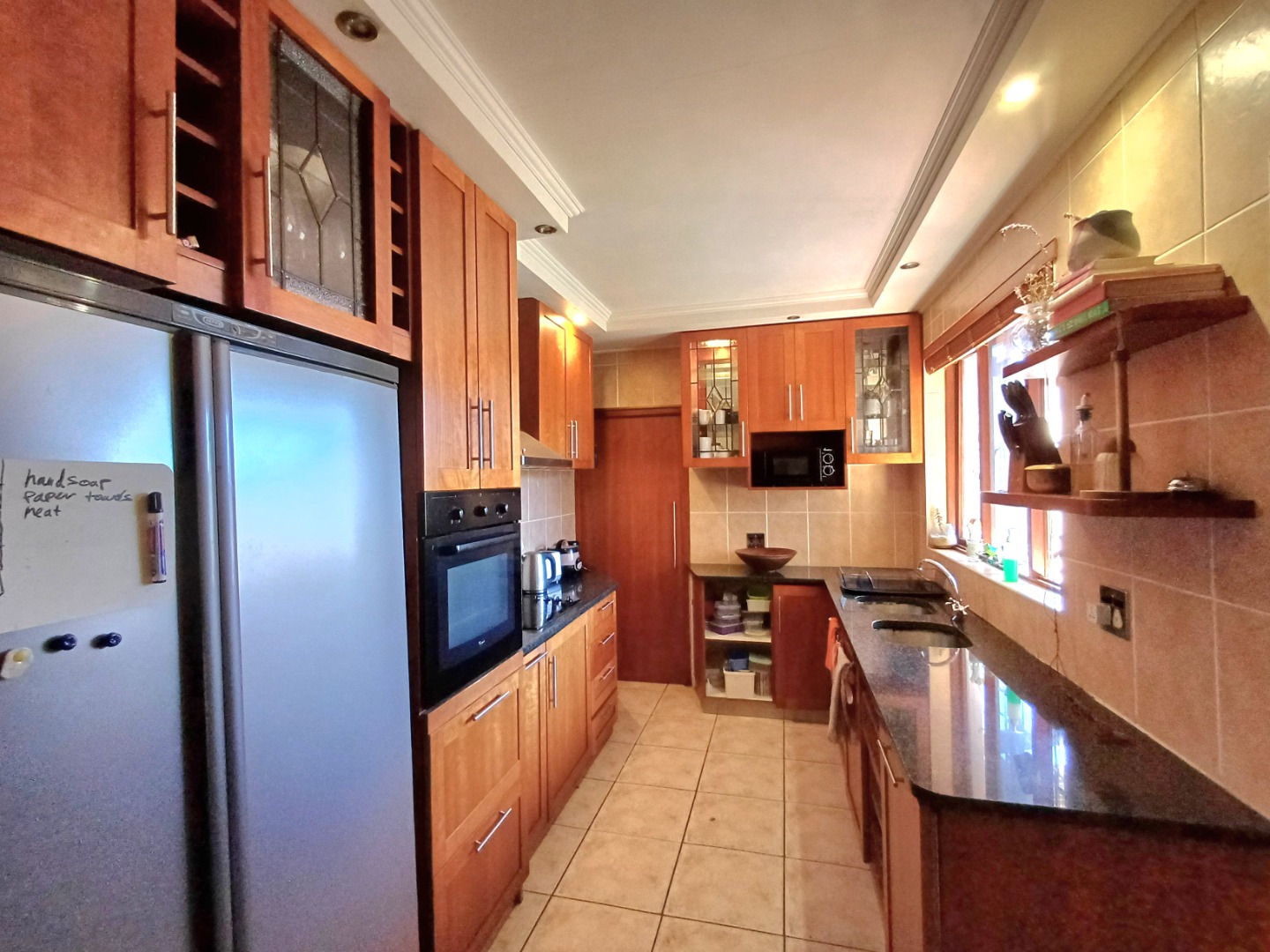 The kitchen is a real highlight, featuring ample wooden cabinetry for all your storage needs, complemented by dark granite-style countertops. It comes equipped with an integrated oven and hob, plus a modern stainless steel refrigerator, making meal prep a breeze. This home is designed for comfortable living, offering a practical layout that suits families or professionals looking for a convenient and charming place to call their own.