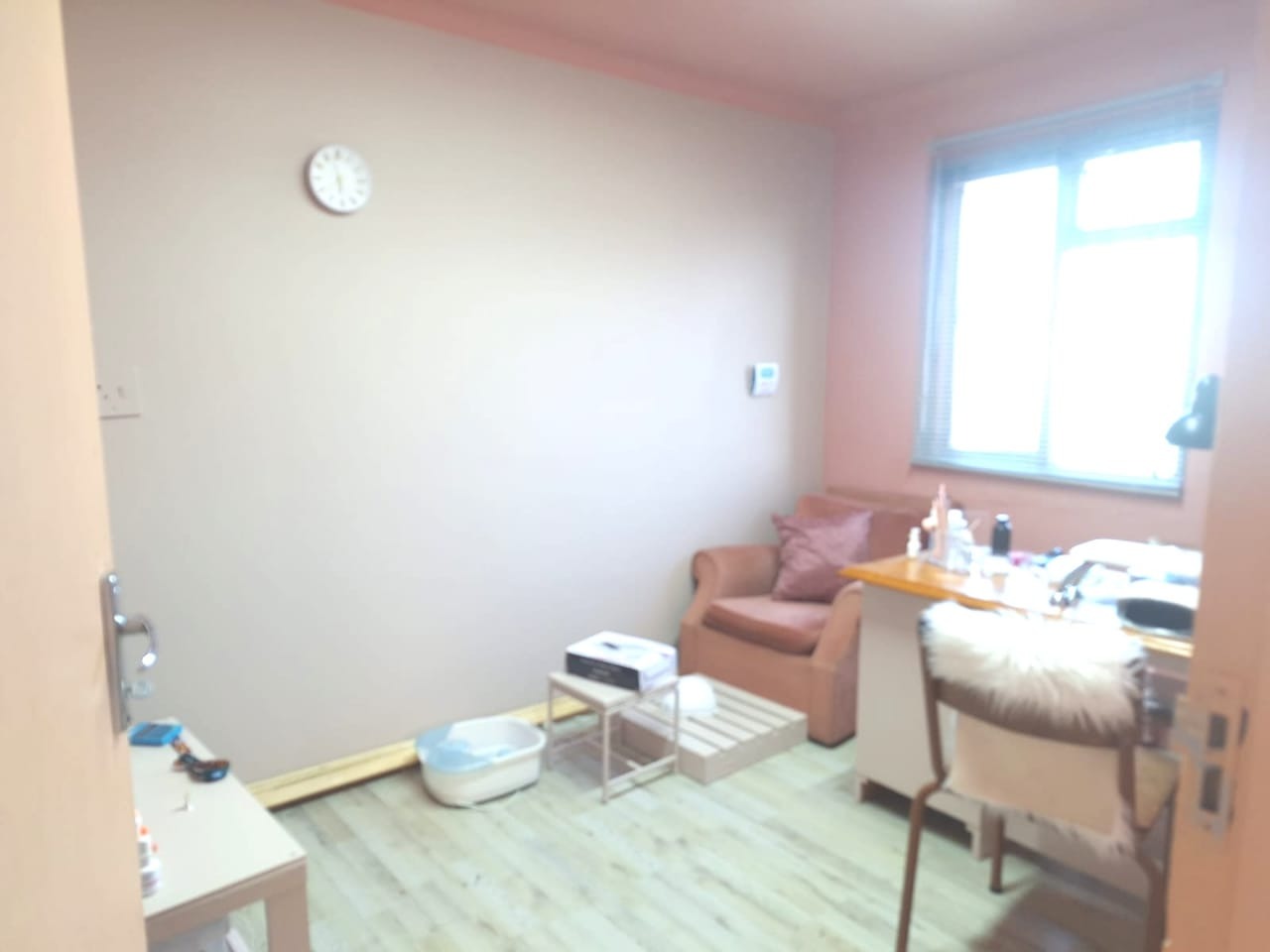 The kitchen, a central hub, provides a functional space with open shelving, a freestanding stove, and a convenient breakfast bar, perfect for casual dining or additional prep space. While offering essential amenities, the kitchen presents an opportunity for tenants to personalize the aesthetic to their taste. The single bathroom includes a glass-enclosed shower, toilet, and a wall-mounted sink, providing all necessary facilities. A versatile smaller room, currently configured as an office or treatment space, adds flexibility to the property's use.