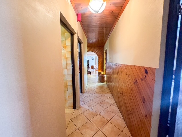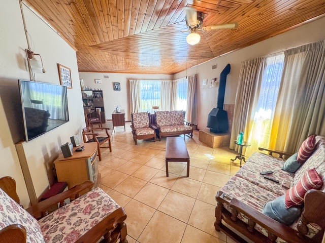 Step inside to a spacious lounge area featuring a wooden ceiling and durable tiled flooring, creating an open and airy atmosphere. Natural light streams through multiple windows, enhancing the living space, which also includes a freestanding fireplace for cozy evenings and a ceiling fan for comfort. The functional kitchen boasts ample wooden cabinetry and counter space, tiled floors, and a large window, providing a practical area for daily living.
