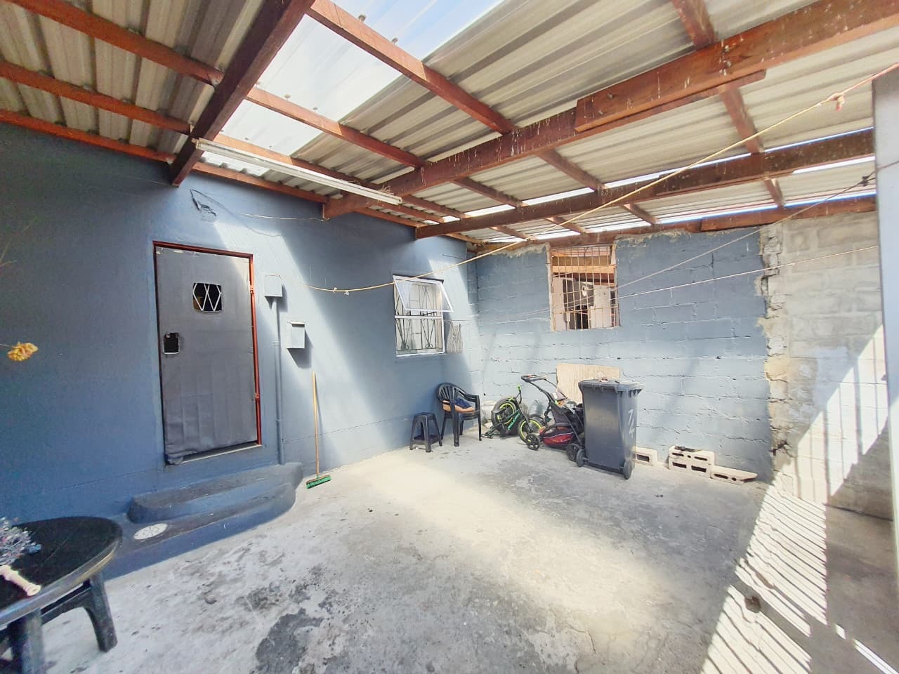 Externally, the property provides two convenient parking spaces. There is also a covered outdoor area with a concrete floor and a translucent roof, offering a sheltered space for various uses, though it currently has a utilitarian finish.