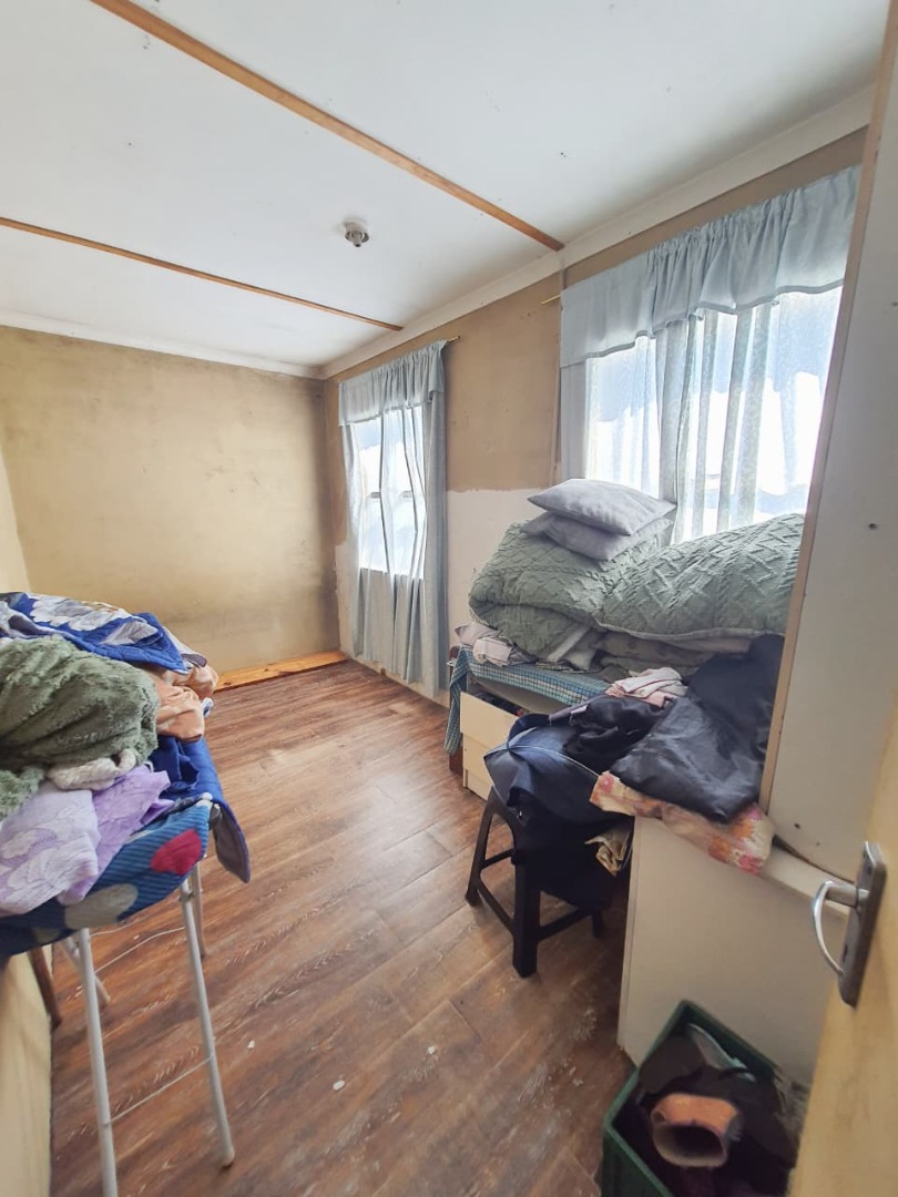 The residence comprises two bedrooms, each offering natural light from windows. One bedroom features wooden flooring, while the other has laminate, both requiring some finishing and organisation to reach their full potential. The property includes one bathroom, which is tiled throughout and features a bathtub with a shower option, a toilet, and a sink. A window, secured with burglar bars, ensures ventilation and natural light.