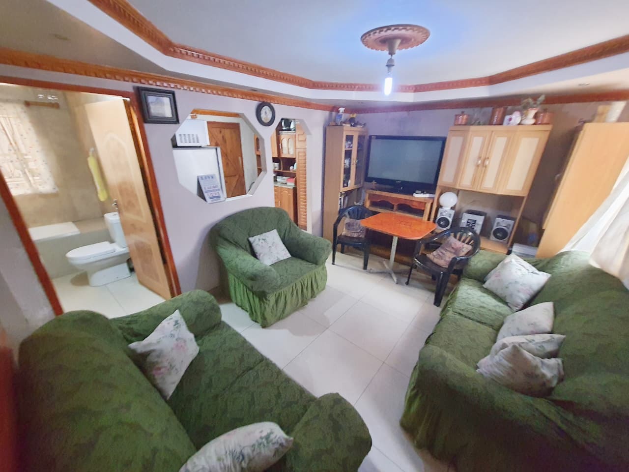 Inside, the home offers a compact lounge area with tiled flooring and decorative trim, ready for personal touches. A distinctive feature of this property is the inclusion of a functional kitchen space. The main kitchen is equipped with tiled flooring, wooden cabinetry, a stove, and a double sink, connecting to the living area through an arched opening. Additionally.