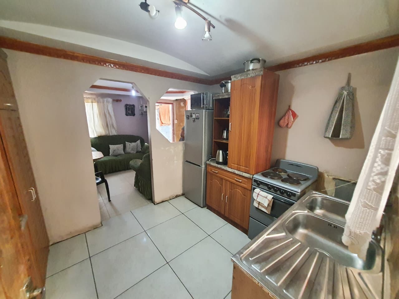 Inside, the home offers a compact lounge area with tiled flooring and decorative trim, ready for personal touches. A distinctive feature of this property is the inclusion of a functional kitchen space. The main kitchen is equipped with tiled flooring, wooden cabinetry, a stove, and a double sink, connecting to the living area through an arched opening. Additionally.