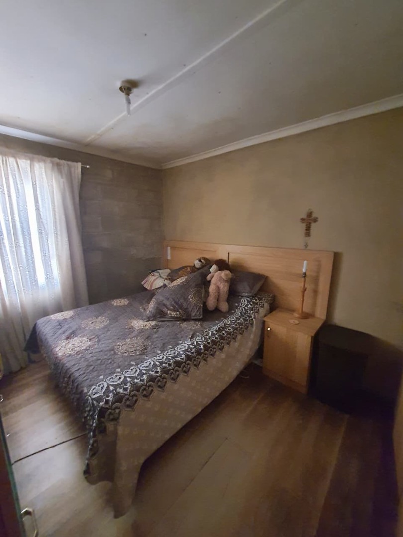 The residence comprises two bedrooms, each offering natural light from windows. One bedroom features wooden flooring, while the other has laminate, both requiring some finishing and organisation to reach their full potential. The property includes one bathroom, which is tiled throughout and features a bathtub with a shower option, a toilet, and a sink. A window, secured with burglar bars, ensures ventilation and natural light.