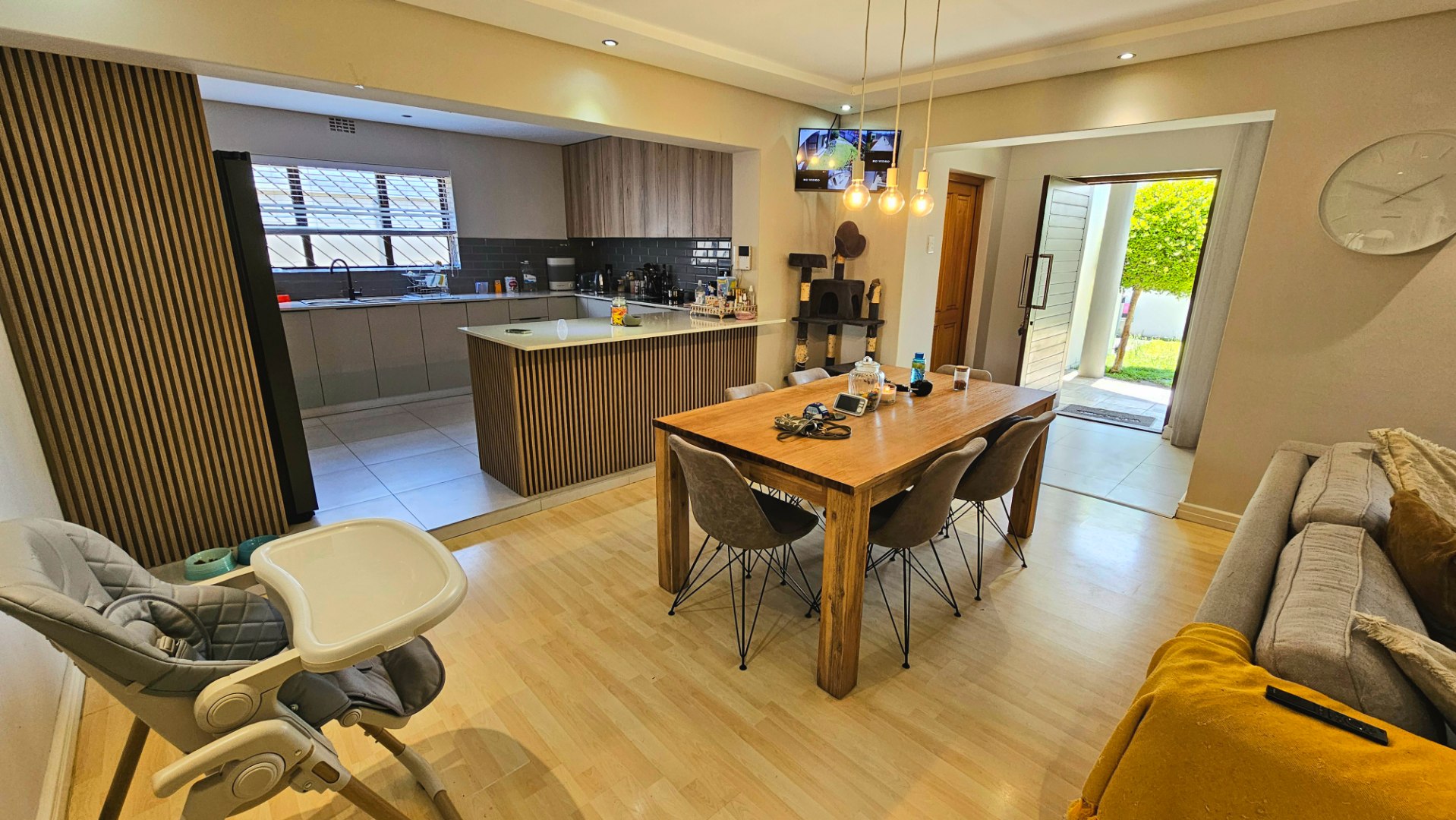 Step outside and the home truly comes to life. A beautifully maintained garden with lush green grass surrounds a sparkling swimming pool—an inviting centerpiece for sunny days and relaxed weekends. Whether you’re hosting summer braais or simply enjoying the serenity of your surroundings, this outdoor space is designed for living well.