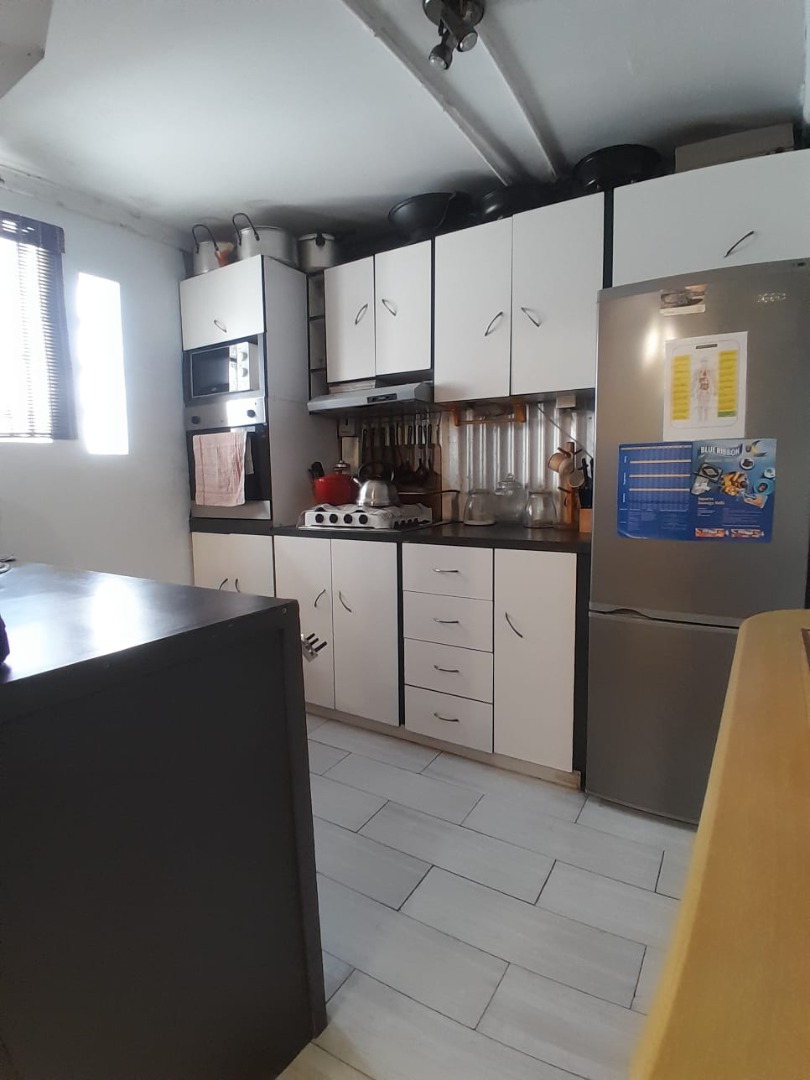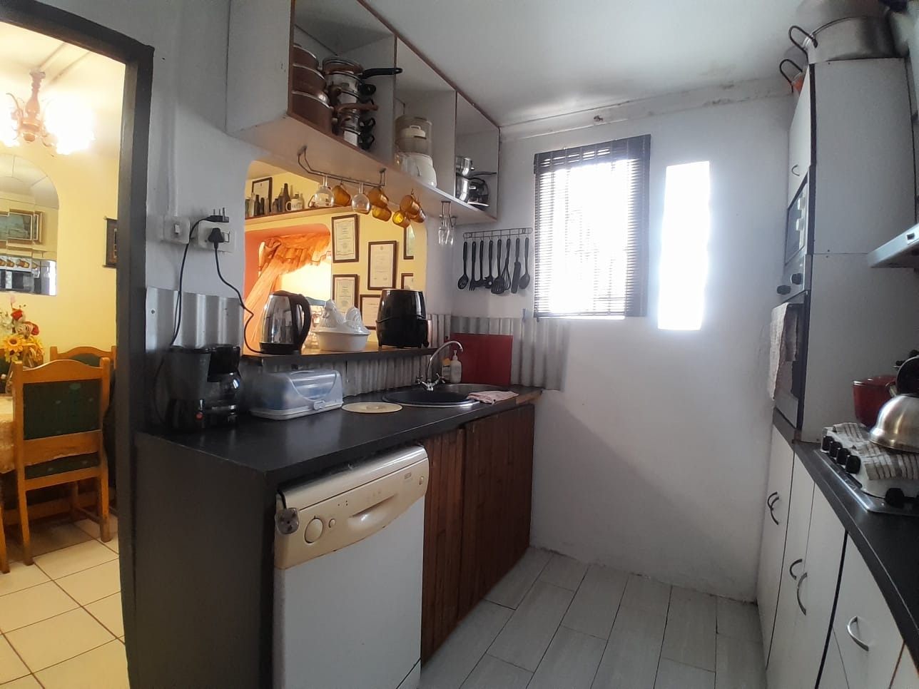 The kitchen is tiled and fitted with built-in cupboards, built-in stove and a built-in oven , double sink and offering additional cupboard space and a washing machine connection.