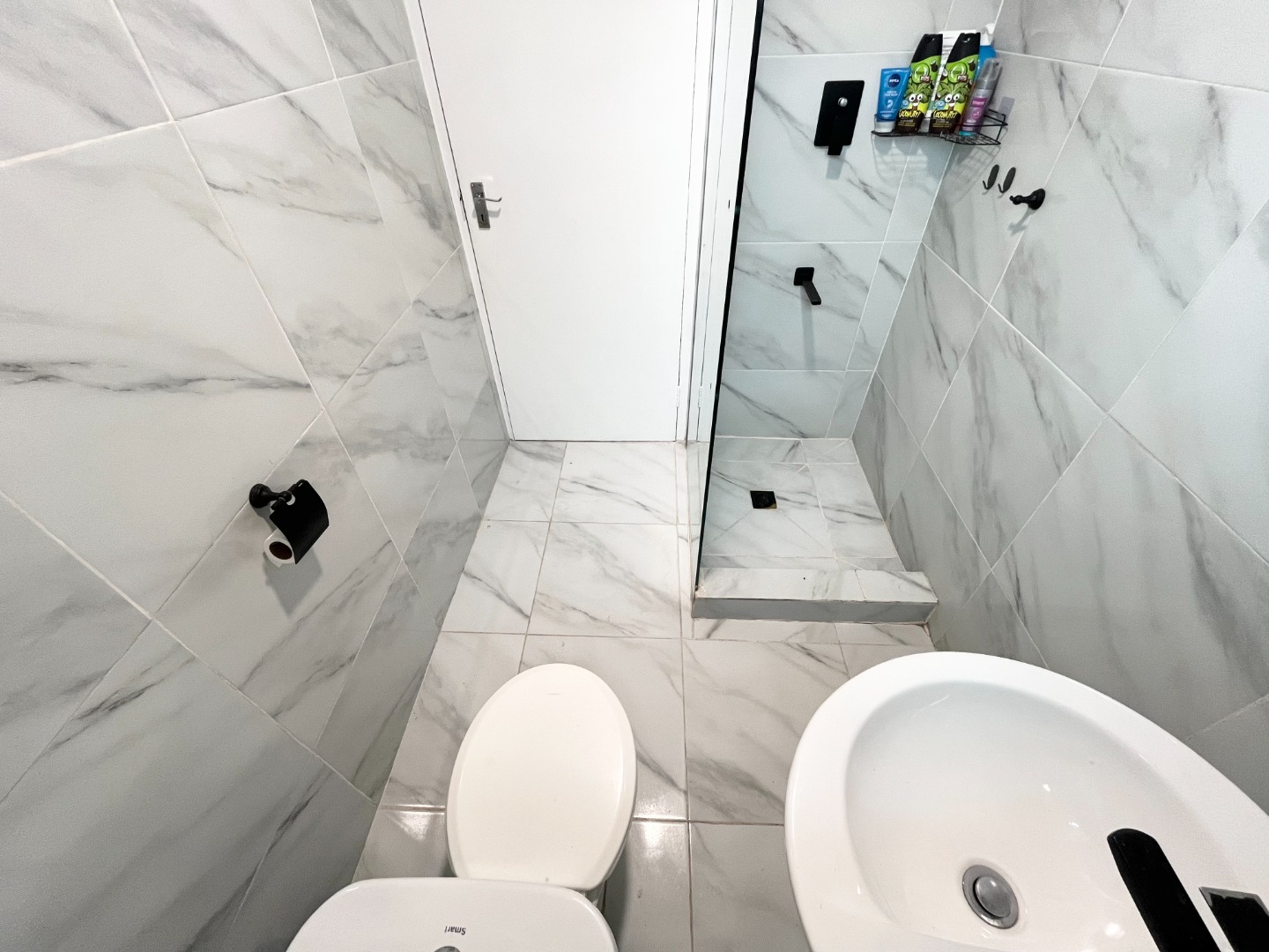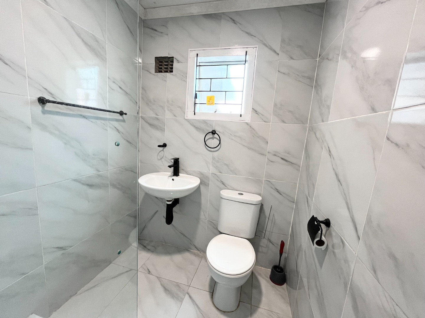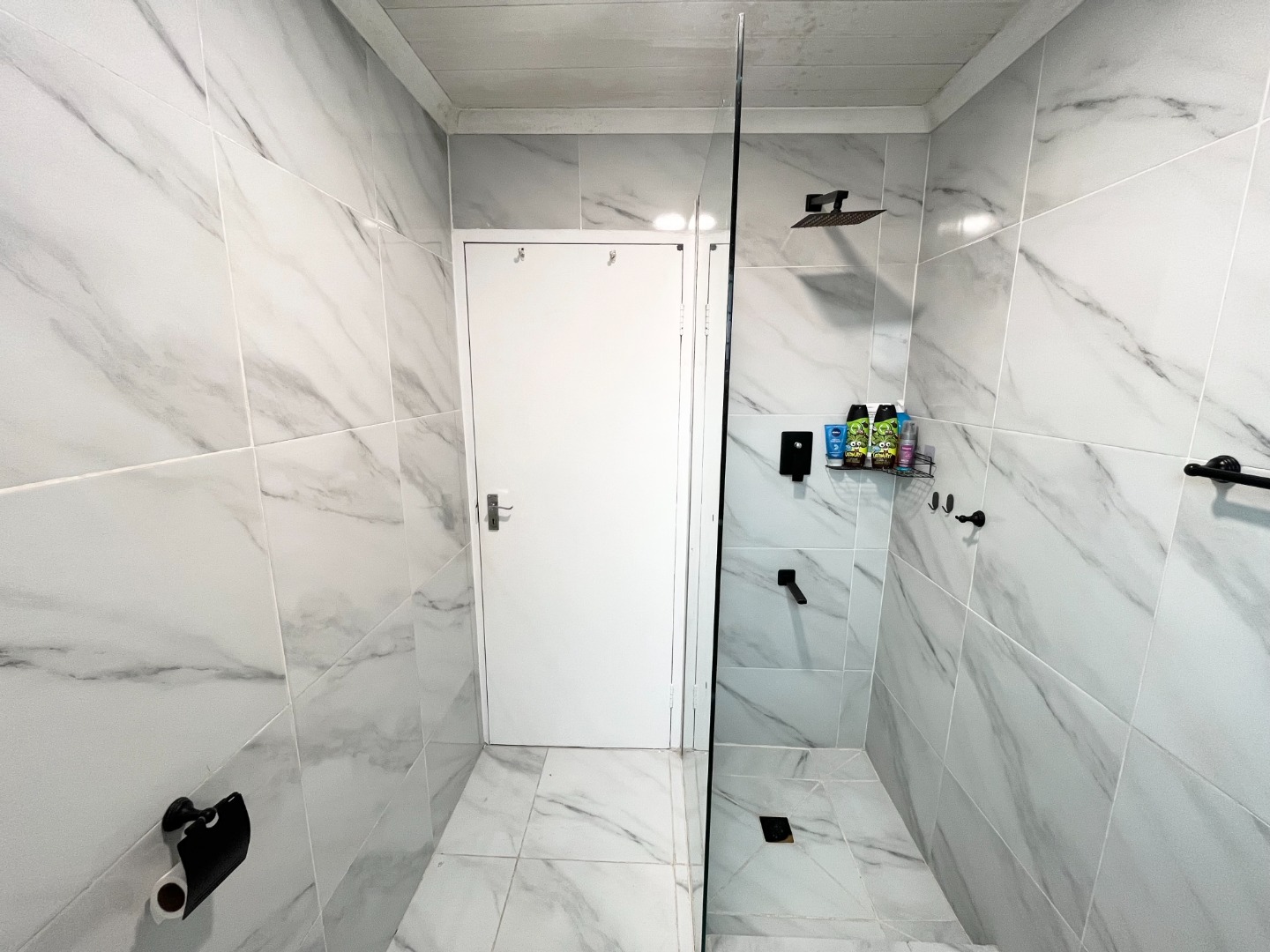The bathroom is equipped with a modern walk-in shower, basin, toilet there is a washing machine point.