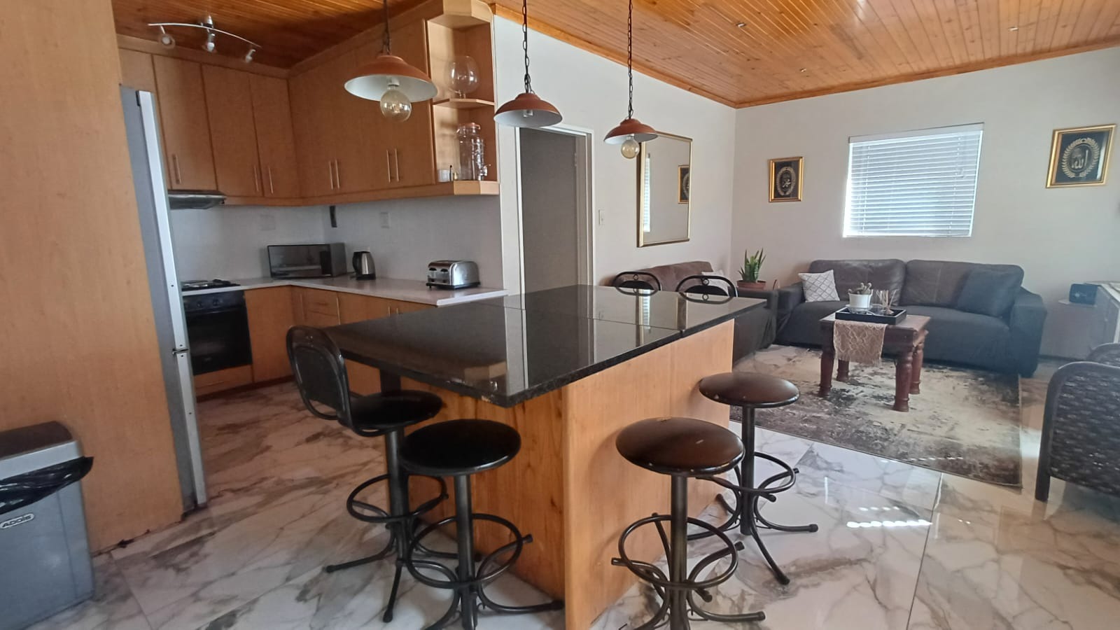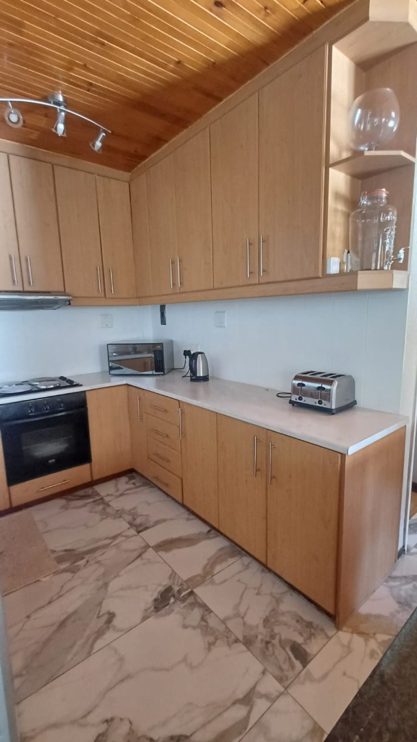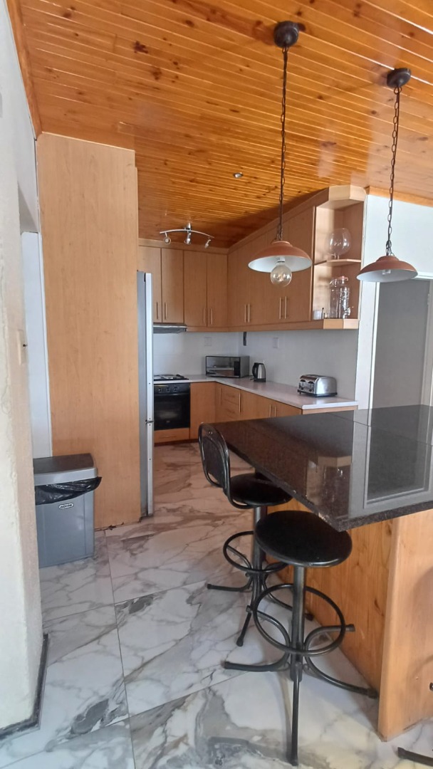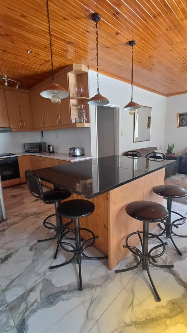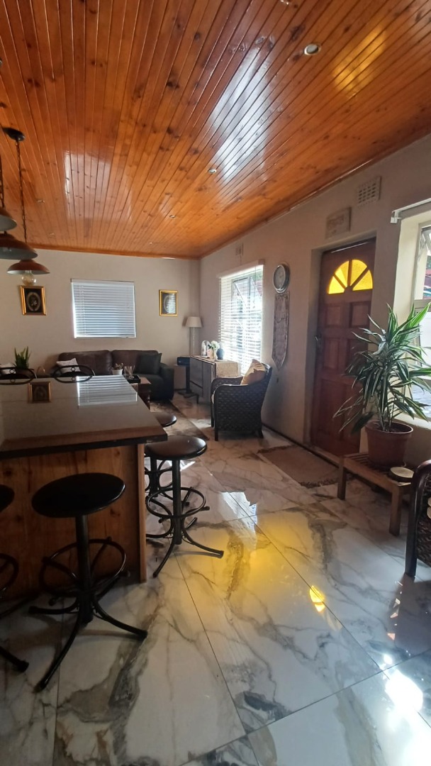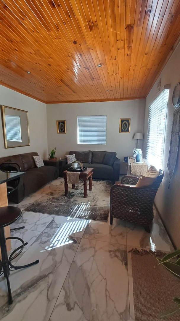 The main house features a welcoming, open-plan layout. Upon entry, you are greeted by a stylish lounge, kitchen, and living area, enhanced by beautiful knotty pine ceilings. A convenient guest bathroom is located nearby, alongside a versatile bedroom. The interior boasts neat tiling and laminated flooring. The functional kitchen is a highlight, equipped with modern built-in-cupboards