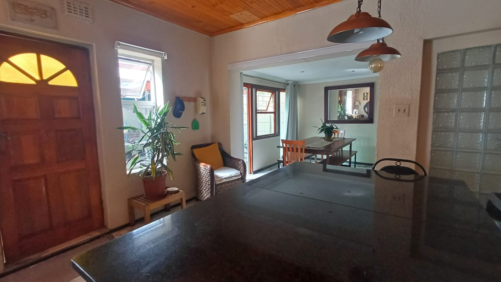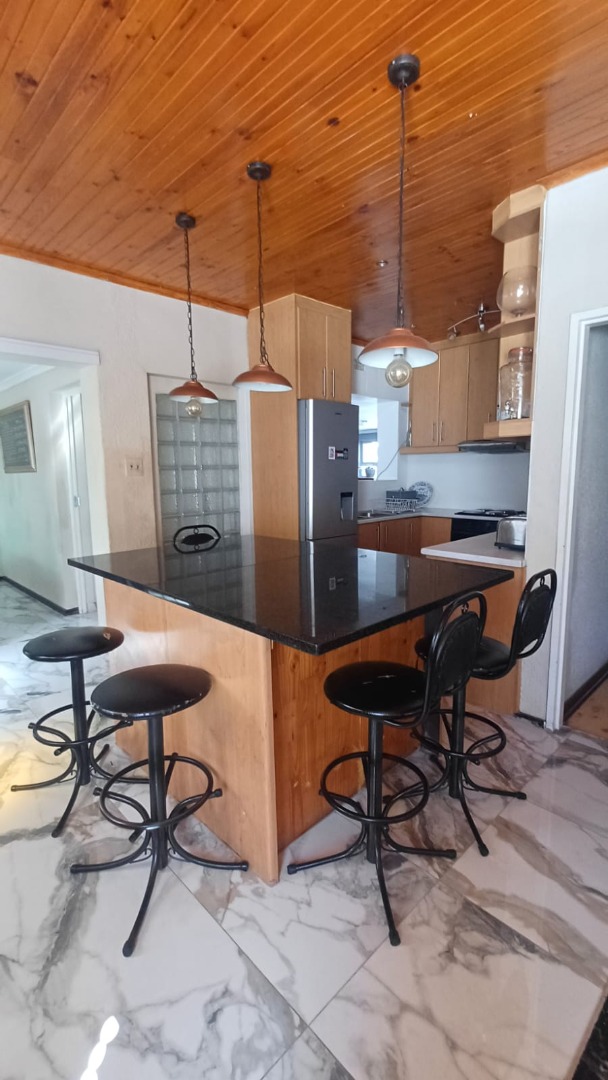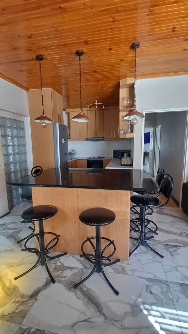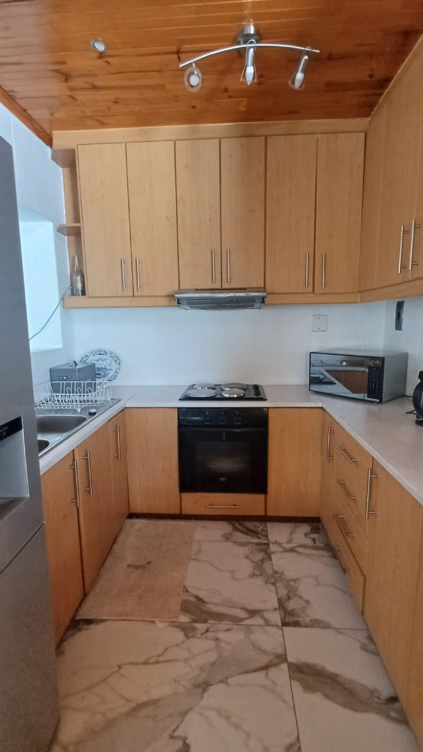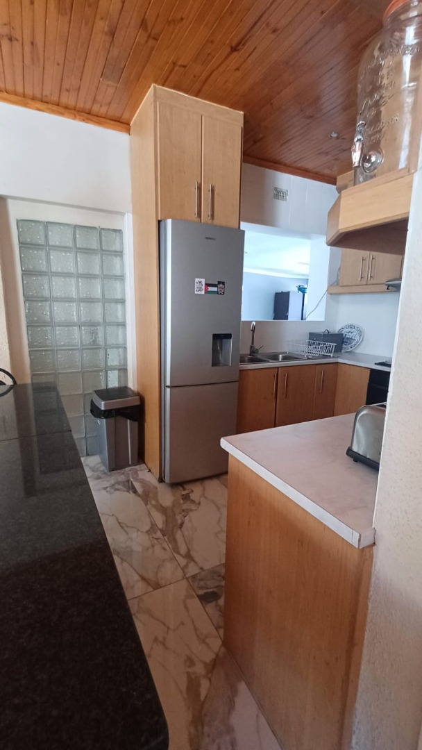 The main house features a welcoming, open-plan layout. Upon entry, you are greeted by a stylish lounge, kitchen, and living area, enhanced by beautiful knotty pine ceilings. A convenient guest bathroom is located nearby, alongside a versatile bedroom. The interior boasts neat tiling and laminated flooring. The functional kitchen is a highlight, equipped with modern built-in-cupboards