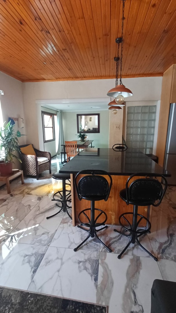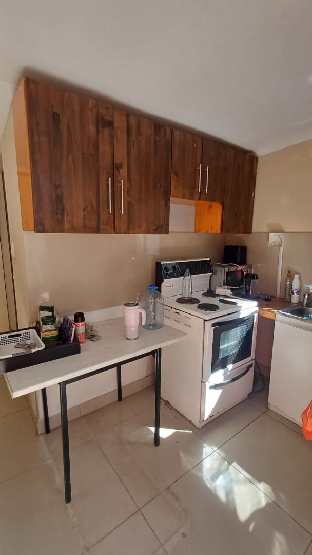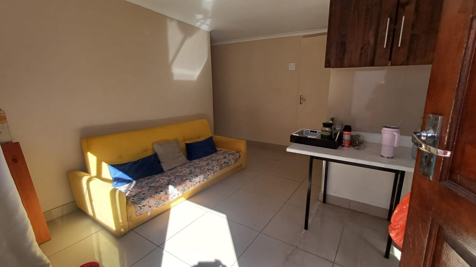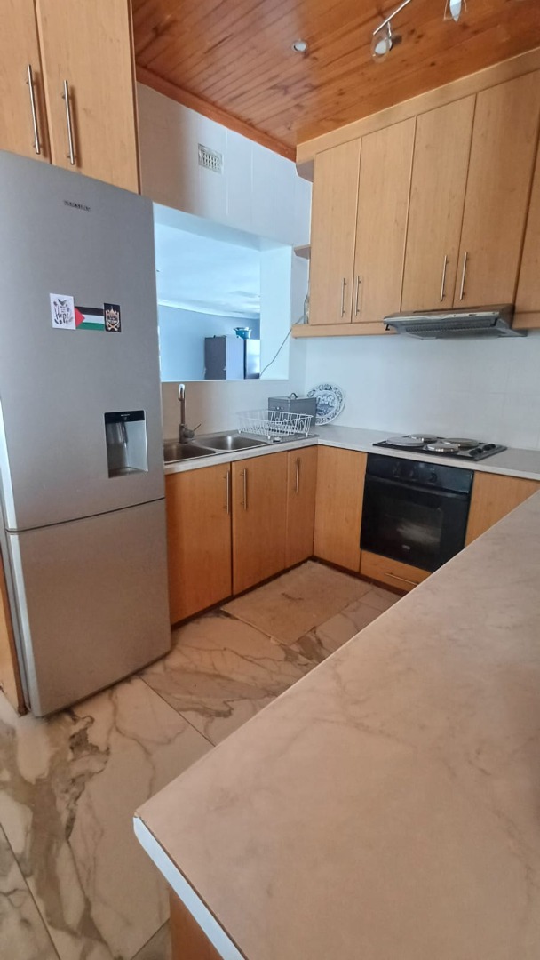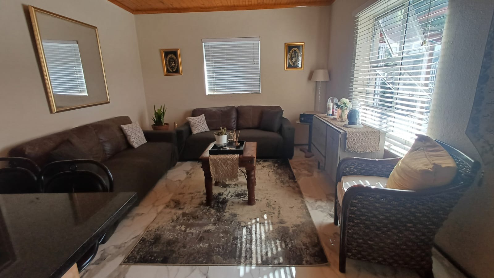 The main house features a welcoming, open-plan layout. Upon entry, you are greeted by a stylish lounge, kitchen, and living area, enhanced by beautiful knotty pine ceilings. A convenient guest bathroom is located nearby, alongside a versatile bedroom. The interior boasts neat tiling and laminated flooring. The functional kitchen is a highlight, equipped with modern built-in-cupboards