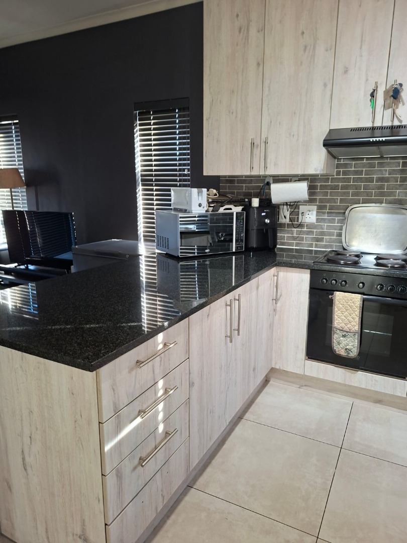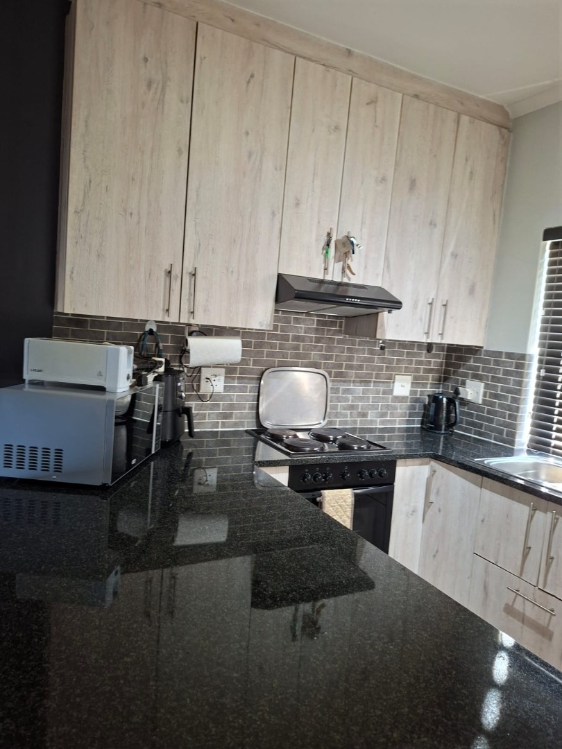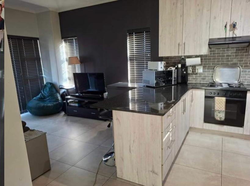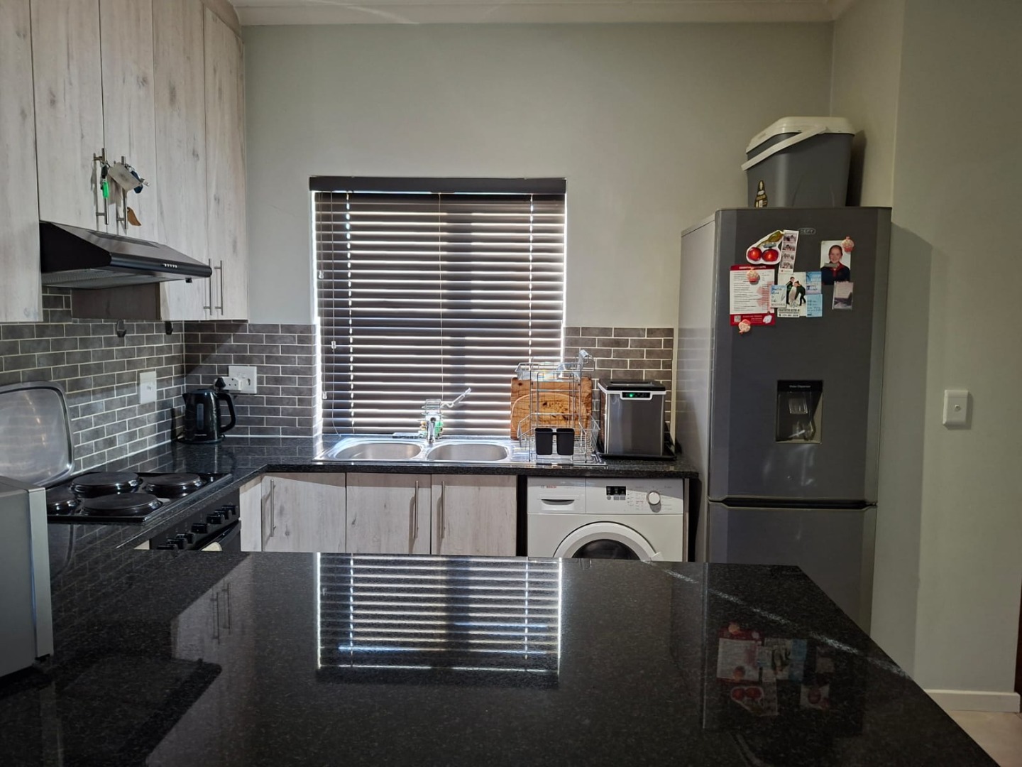 Discover modern living in this well-appointed two-bedroom unit, part of the contemporary Bonnie Villas complex in Windsor Park, Kraaifontein. The property showcases a sleek architectural design with clean lines and a sophisticated grey and dark grey exterior, creating an inviting kerb appeal. The exterior is well-maintained with paved areas and new landscaping, reflecting a commitment to quality. Step inside to an open-plan living area featuring durable tiled flooring, designed for comfortable daily life. The modern U-shaped kitchen is a highlight, equipped with stylish light wood-look cabinetry, dark granite countertops, and an attractive tile backsplash. Functionality is enhanced by integrated appliances, including a built-in oven, hob, and space for a washing machine, providing a seamless culinary experience. Natural light floods the living spaces through well-placed windows, which are fitted with modern blinds for privacy and light control. The layout efficiently connects the lounge and kitchen, fostering an inclusive atmosphere ideal for both relaxation and entertaining. This residence offers two comfortable bedrooms, providing private retreats for occupants. A single well-appointed bathroom serves the unit, featuring contemporary fixtures and finishes consistent with the home's modern aesthetic. Practical amenities include a single garage and an additional parking space, ensuring convenience for residents and visitors. Located in Windsor Park, Kraaifontein, this property offers access to local amenities and a suburban lifestyle. Key Features: * Modern architectural design * Open-plan living area * Contemporary U-shaped kitchen * Dark granite countertops * Integrated oven and hob * Two bedrooms * One bathroom * Single garage * Additional parking space