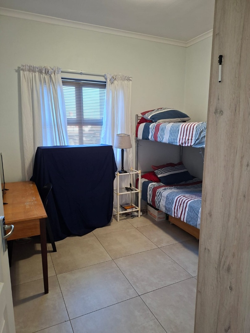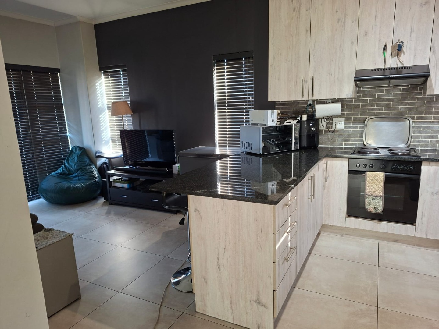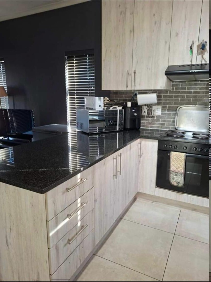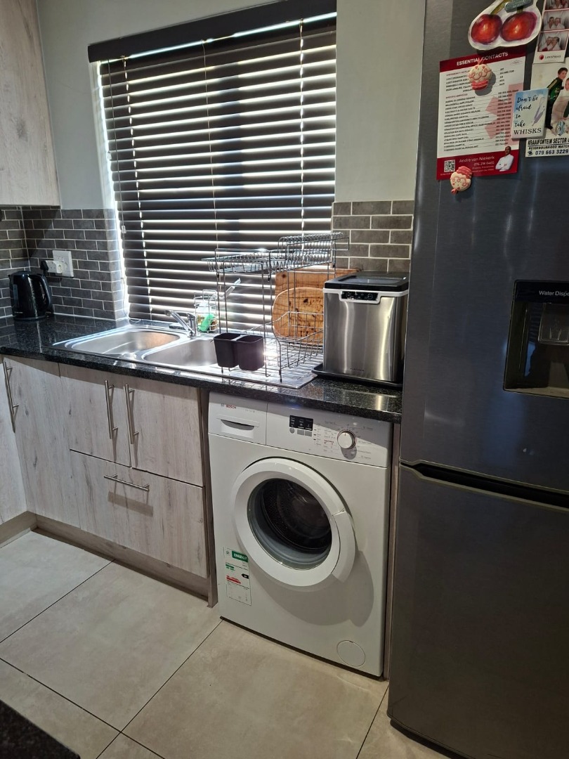 Discover modern living in this well-appointed two-bedroom unit, part of the contemporary Bonnie Villas complex in Windsor Park, Kraaifontein. The property showcases a sleek architectural design with clean lines and a sophisticated grey and dark grey exterior, creating an inviting kerb appeal. The exterior is well-maintained with paved areas and new landscaping, reflecting a commitment to quality. Step inside to an open-plan living area featuring durable tiled flooring, designed for comfortable daily life. The modern U-shaped kitchen is a highlight, equipped with stylish light wood-look cabinetry, dark granite countertops, and an attractive tile backsplash. Functionality is enhanced by integrated appliances, including a built-in oven, hob, and space for a washing machine, providing a seamless culinary experience. Natural light floods the living spaces through well-placed windows, which are fitted with modern blinds for privacy and light control. The layout efficiently connects the lounge and kitchen, fostering an inclusive atmosphere ideal for both relaxation and entertaining. This residence offers two comfortable bedrooms, providing private retreats for occupants. A single well-appointed bathroom serves the unit, featuring contemporary fixtures and finishes consistent with the home's modern aesthetic. Practical amenities include a single garage and an additional parking space, ensuring convenience for residents and visitors. Located in Windsor Park, Kraaifontein, this property offers access to local amenities and a suburban lifestyle. Key Features: * Modern architectural design * Open-plan living area * Contemporary U-shaped kitchen * Dark granite countertops * Integrated oven and hob * Two bedrooms * One bathroom * Single garage * Additional parking space