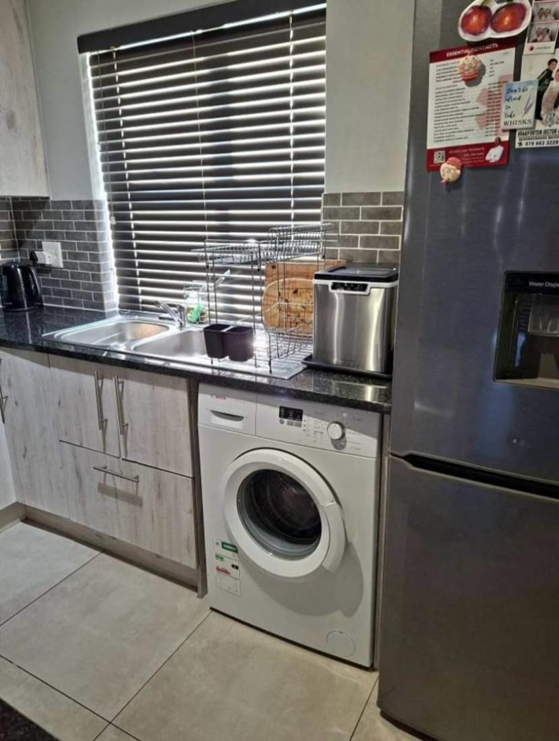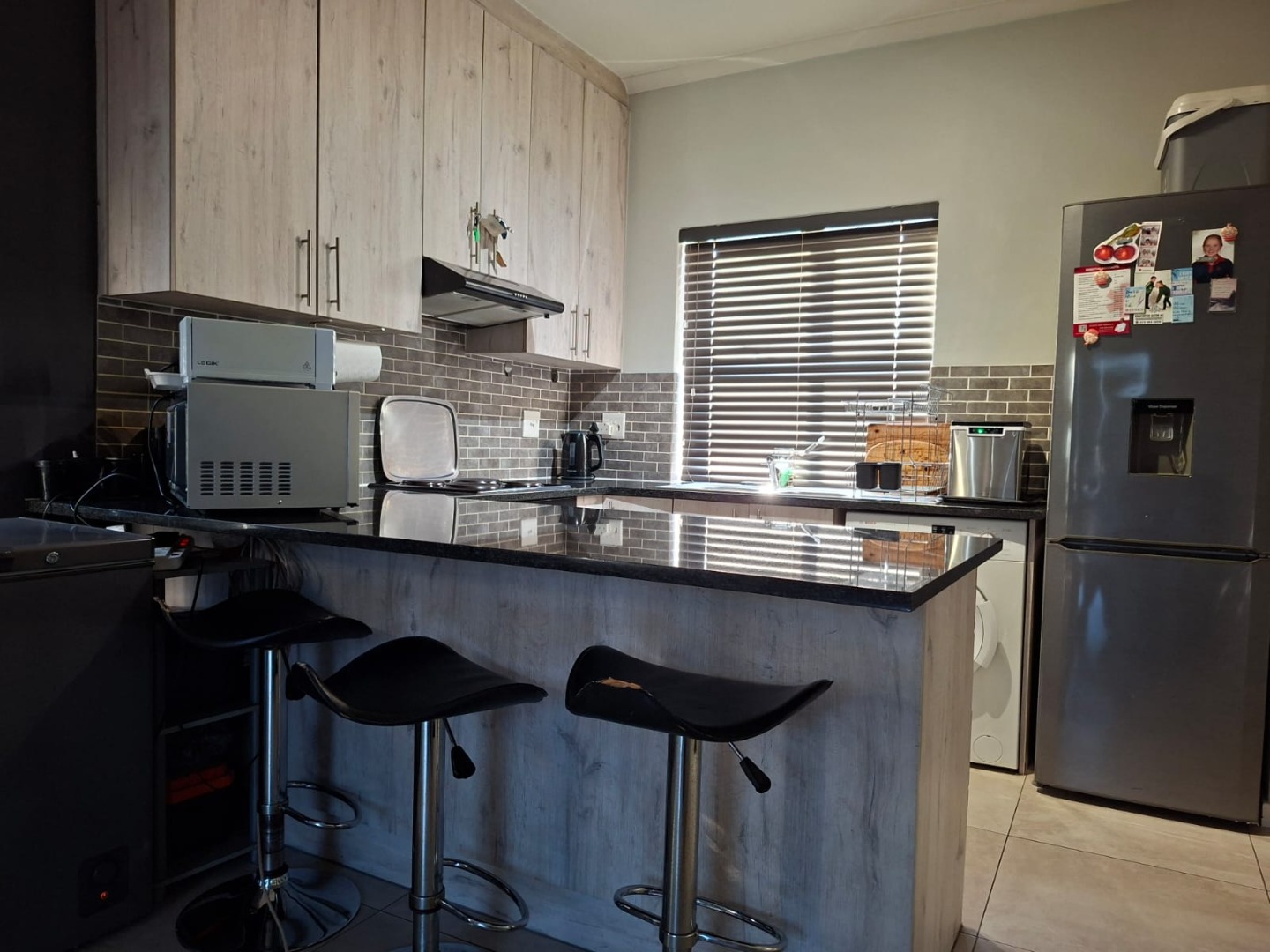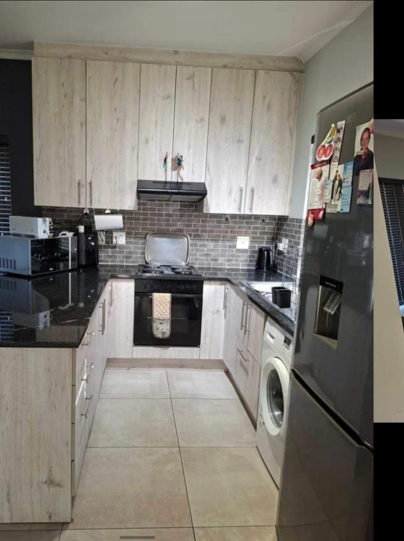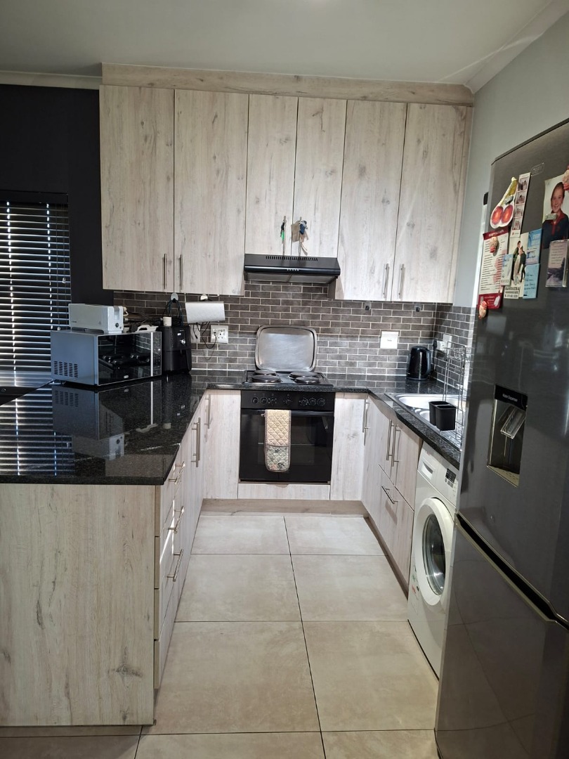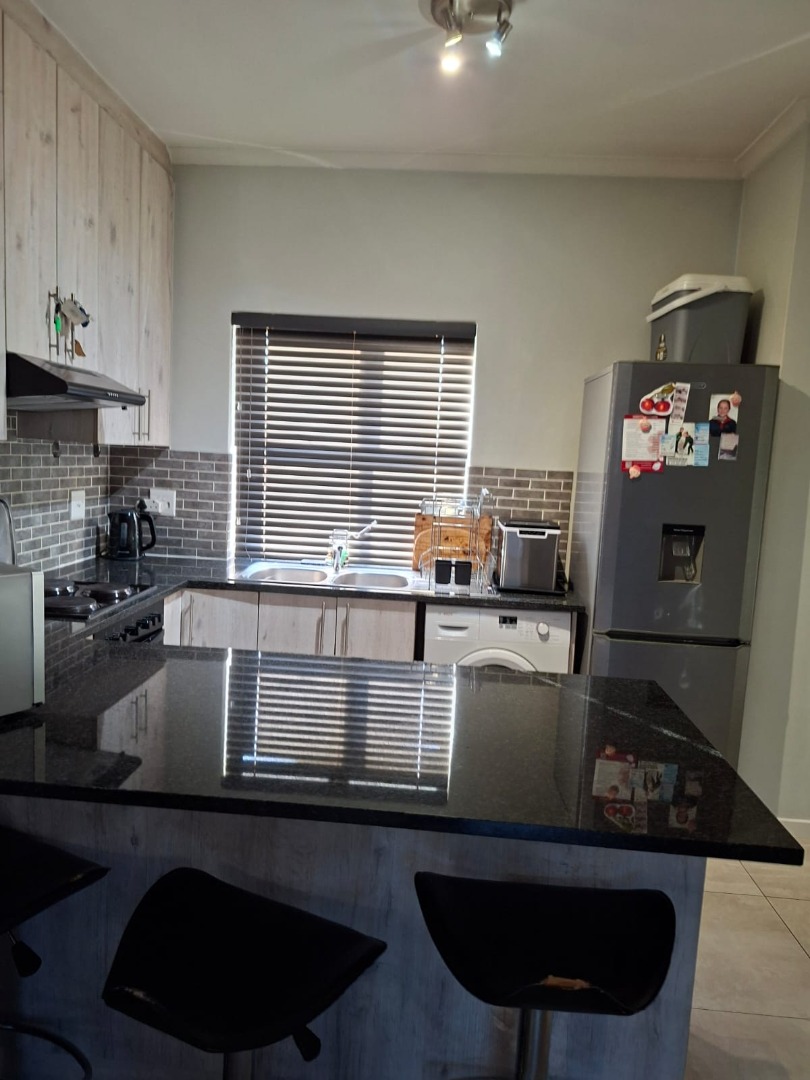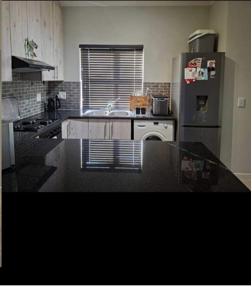 Discover modern living in this well-appointed two-bedroom unit, part of the contemporary Bonnie Villas complex in Windsor Park, Kraaifontein. The property showcases a sleek architectural design with clean lines and a sophisticated grey and dark grey exterior, creating an inviting kerb appeal. The exterior is well-maintained with paved areas and new landscaping, reflecting a commitment to quality. Step inside to an open-plan living area featuring durable tiled flooring, designed for comfortable daily life. The modern U-shaped kitchen is a highlight, equipped with stylish light wood-look cabinetry, dark granite countertops, and an attractive tile backsplash. Functionality is enhanced by integrated appliances, including a built-in oven, hob, and space for a washing machine, providing a seamless culinary experience. Natural light floods the living spaces through well-placed windows, which are fitted with modern blinds for privacy and light control. The layout efficiently connects the lounge and kitchen, fostering an inclusive atmosphere ideal for both relaxation and entertaining. This residence offers two comfortable bedrooms, providing private retreats for occupants. A single well-appointed bathroom serves the unit, featuring contemporary fixtures and finishes consistent with the home's modern aesthetic. Practical amenities include a single garage and an additional parking space, ensuring convenience for residents and visitors. Located in Windsor Park, Kraaifontein, this property offers access to local amenities and a suburban lifestyle. Key Features: * Modern architectural design * Open-plan living area * Contemporary U-shaped kitchen * Dark granite countertops * Integrated oven and hob * Two bedrooms * One bathroom * Single garage * Additional parking space