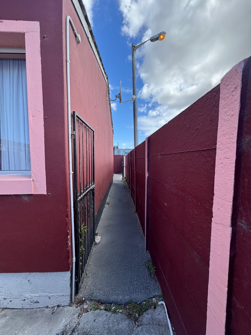 This single-story residence in Beacon Valley presents a secure and private frontage, defined by a high perimeter wall and a pedestrian gate. The property features a dark red exterior with white-framed windows, offering a distinct street presence. A paved front area provides practical off-street parking for up to four vehicles, enhancing convenience for residents and visitors alike.